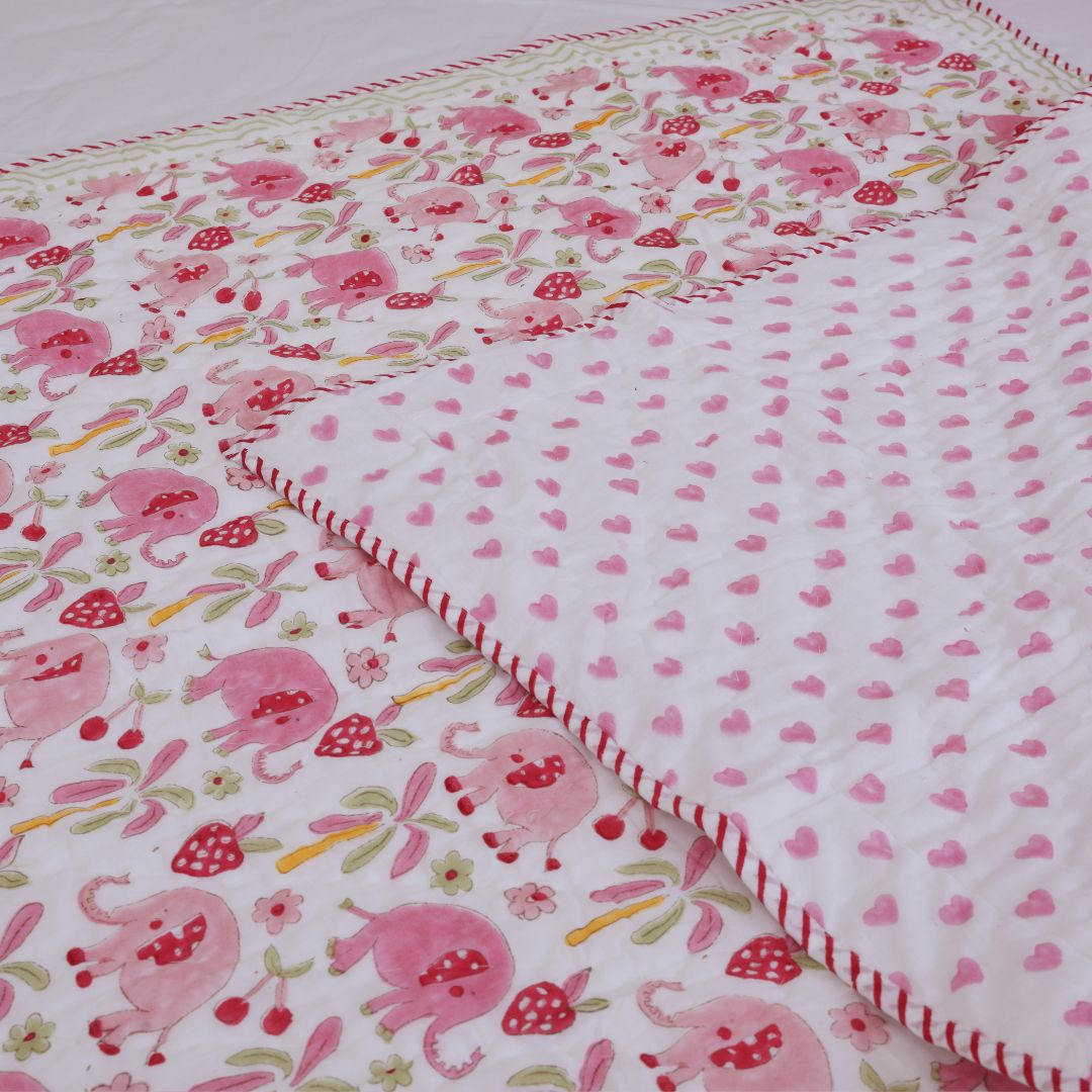 Handblock Printed Cotton Kids’ Quilt – Pink Elephant Design
