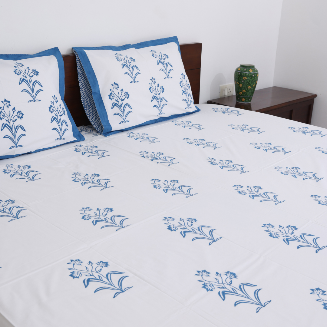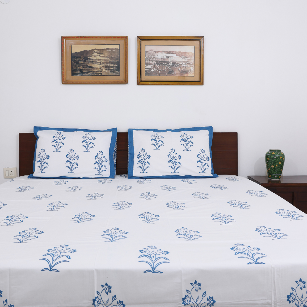 Introduce elegance and simplicity to your bedroom with the Blue Floral Handblock Printed Percale Bedsheet. Featuring intricately handblock-printed floral motifs in a refreshing blue on a crisp white base, this bedsheet exudes sophistication and charm. Made from percale, it ensures a soft and breathable texture for ultimate comfort. Perfect for creating a serene and stylish ambiance in your space, this bedsheet is both practical and visually stunning.