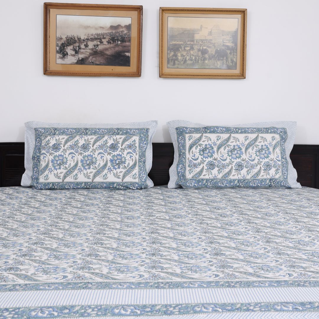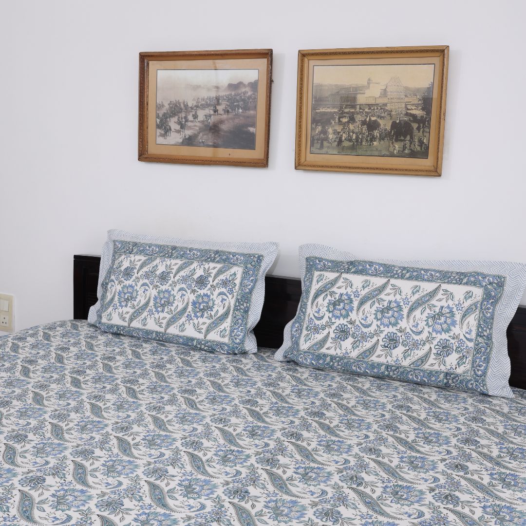 Infuse your bedroom with timeless elegance with the Blue Paisley Handblock Cotton Bedcover. Featuring intricate paisley patterns in soothing blue tones, this bedcover is handblock printed by skilled artisans, showcasing the rich craftsmanship of Jaipur. Made from 100% pure cotton, it provides breathability, softness, and durability for daily use. The large size (90 x 108 inches) makes it a perfect fit for most beds, while the matching pillow covers ensure a cohesive and stylish look for your space.