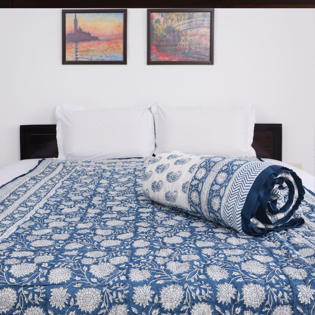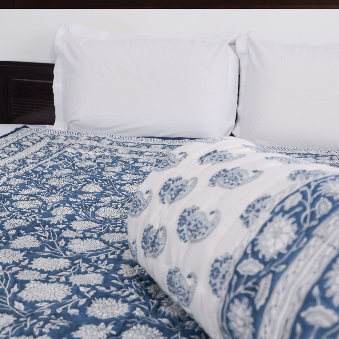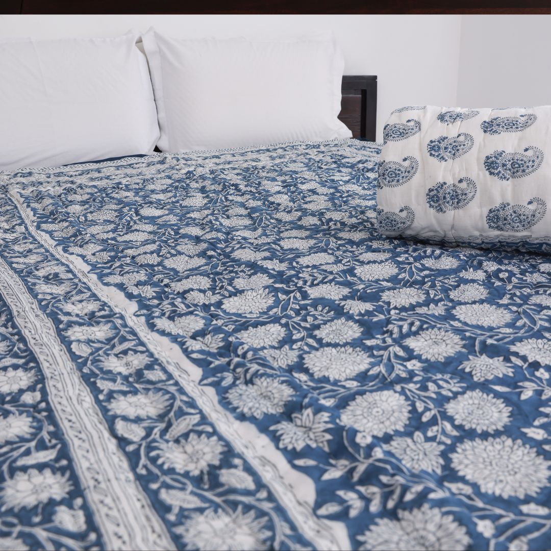 Add a touch of timeless elegance to your bedroom with the Blue Turquoise Traditional Print Handblock Reversible Quilt. Featuring intricate hand-carved designs, this quilt showcases the artistry of Jaipur’s handblock printing tradition. Made from 100% pure cotton mulmul with a soft cotton filling, it provides unmatched warmth and comfort. The dual-sided printing offers two distinct designs, making it versatile and perfect for refreshing your bedroom decor.