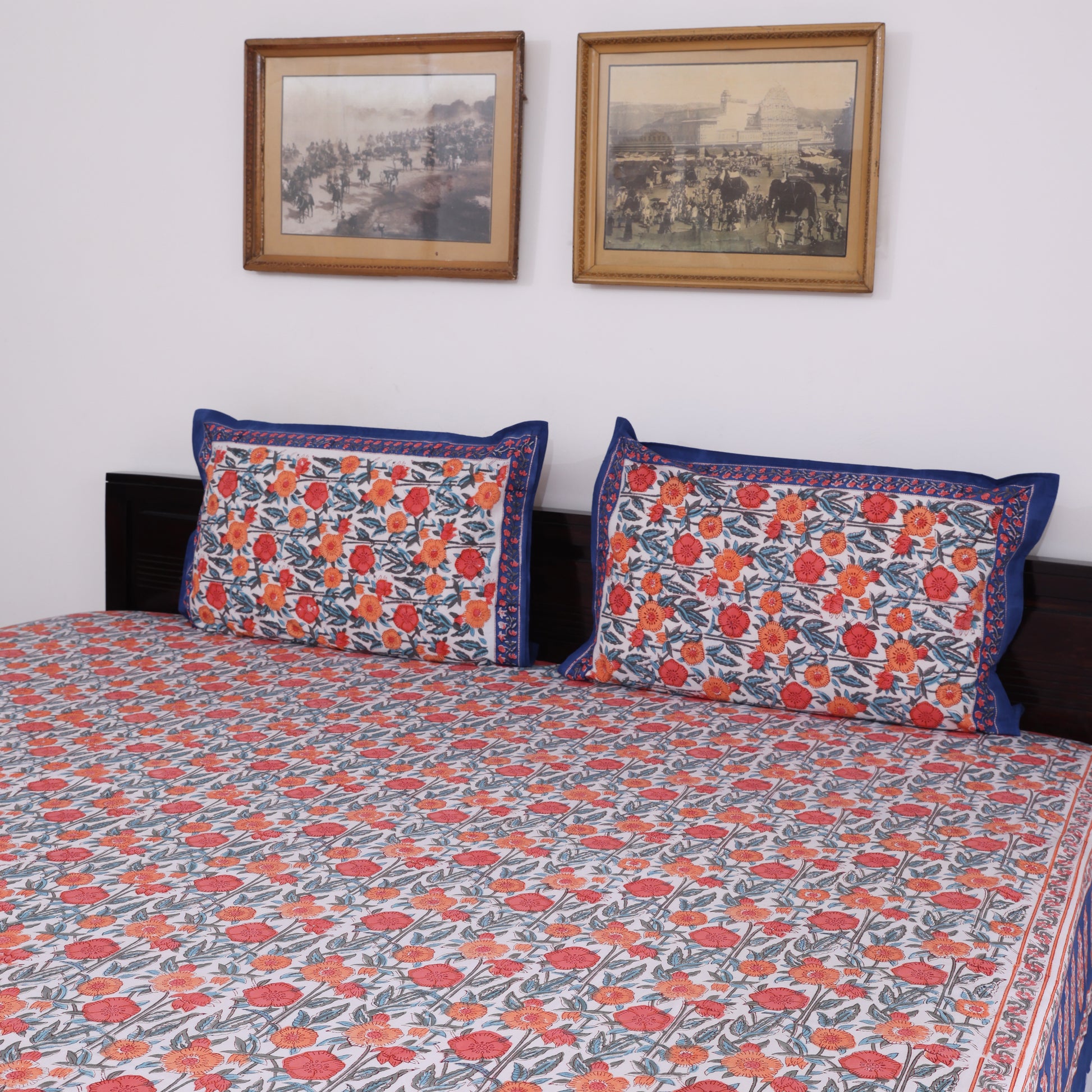 Dark Blue & Orange Handblock Printed Cotton Bedsheet