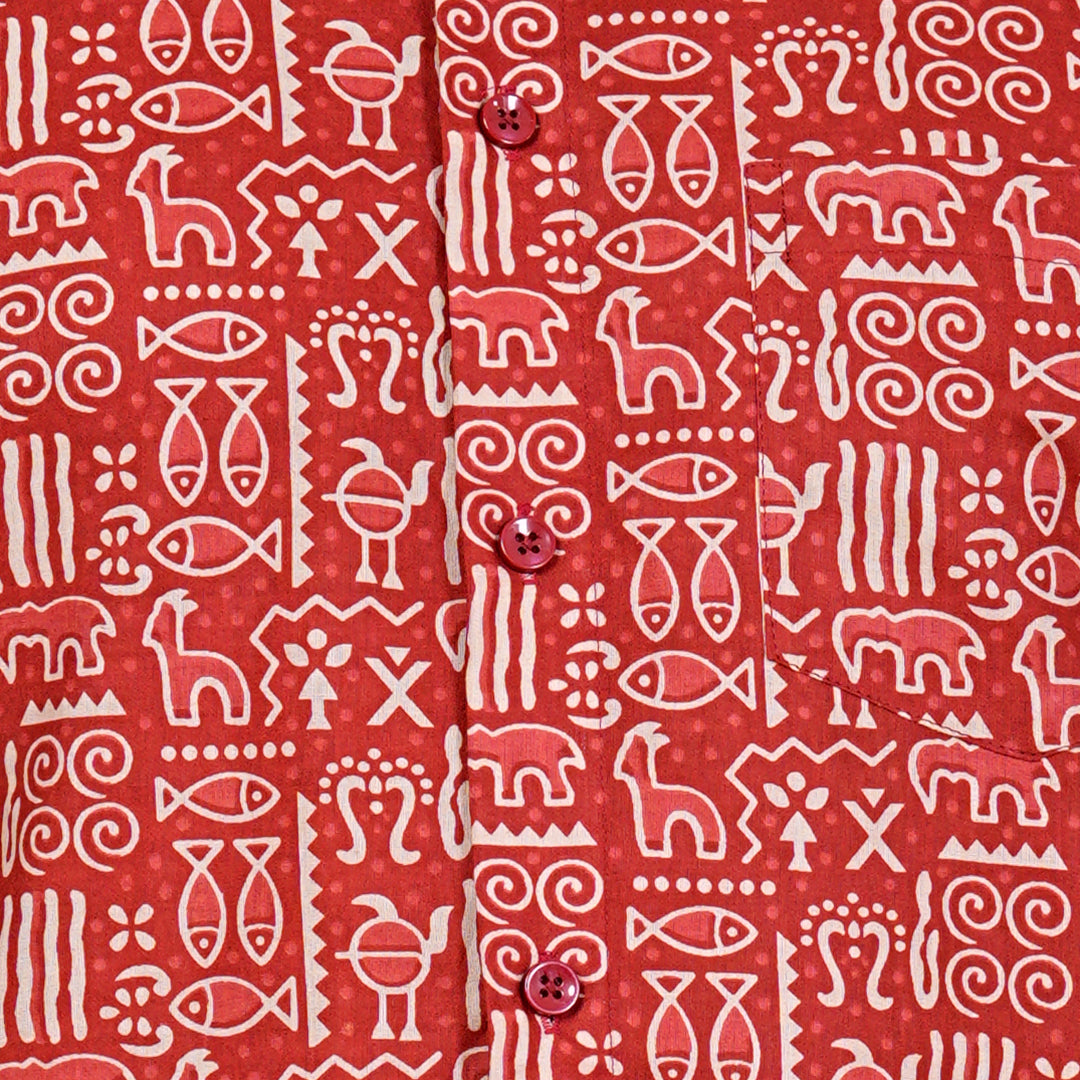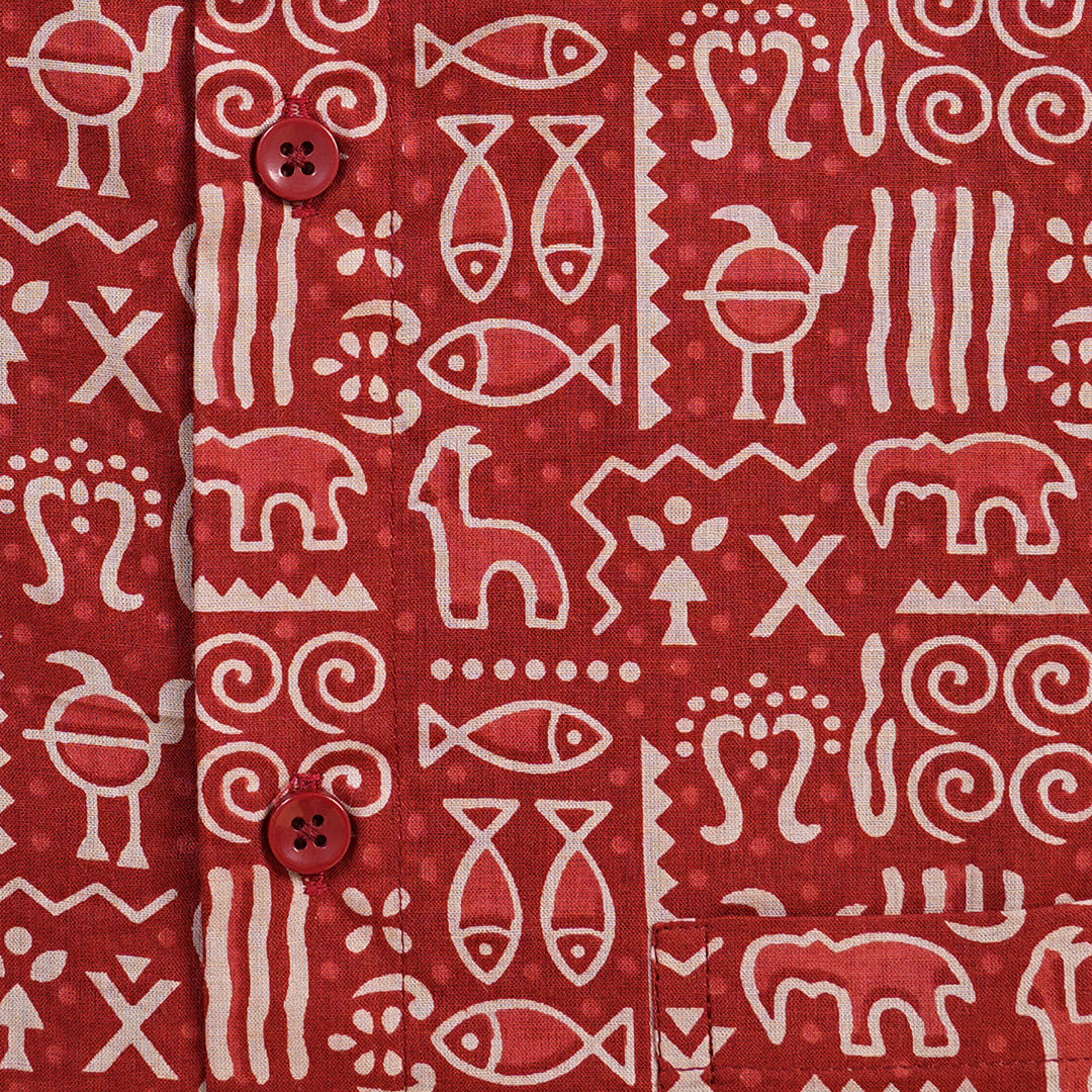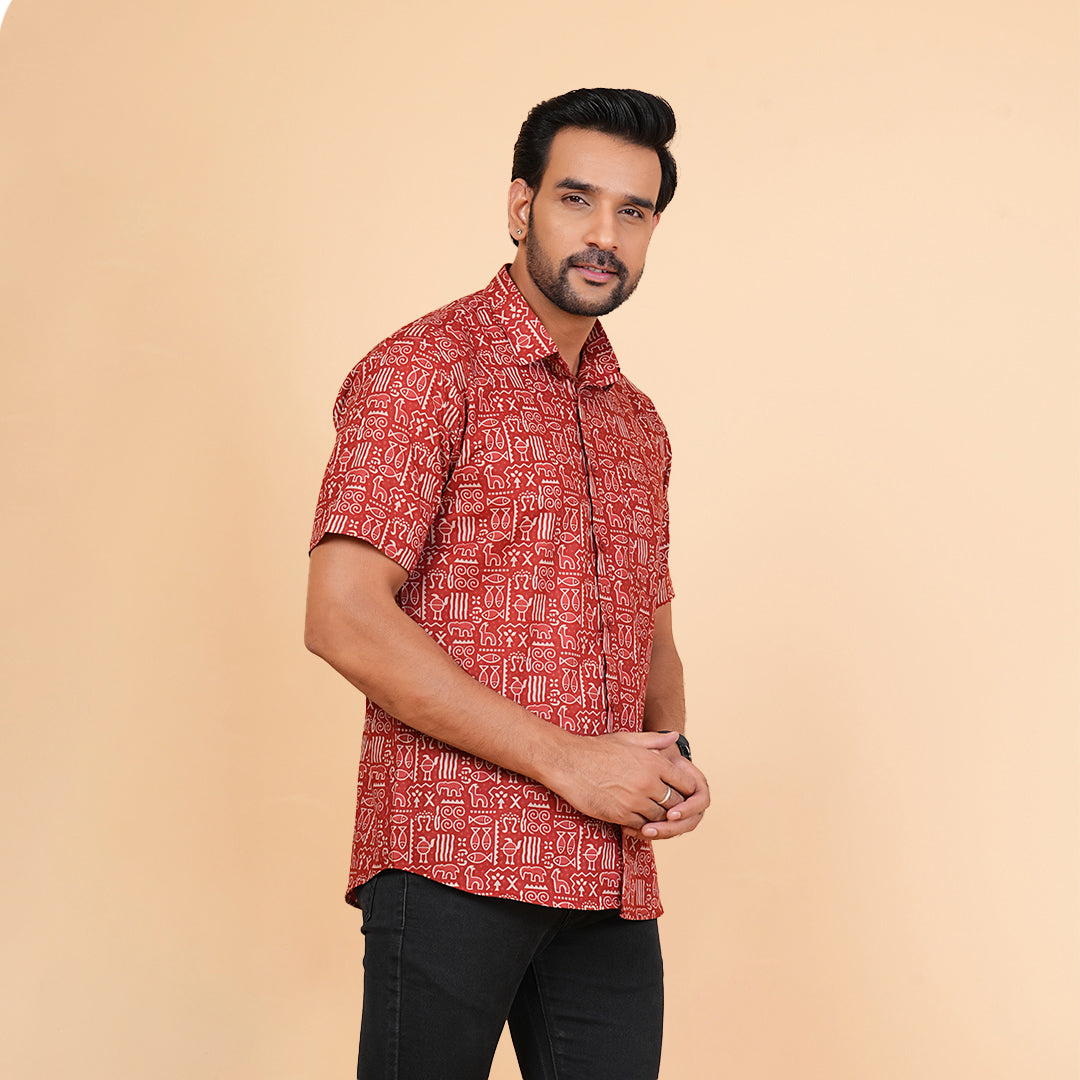 Made from 100% cotton, the Red Earthy Vibes Shirt brings warmth, comfort, and cultural charm to your wardrobe. The bold red base is paired with an earthy, nature-inspired print that balances vibrance with grounded simplicity. Designed with a spread collar, half sleeves, and a front button placket, this regular fit shirt is perfect for festive gatherings, casual days, or relaxed evenings. Ethically made in India.