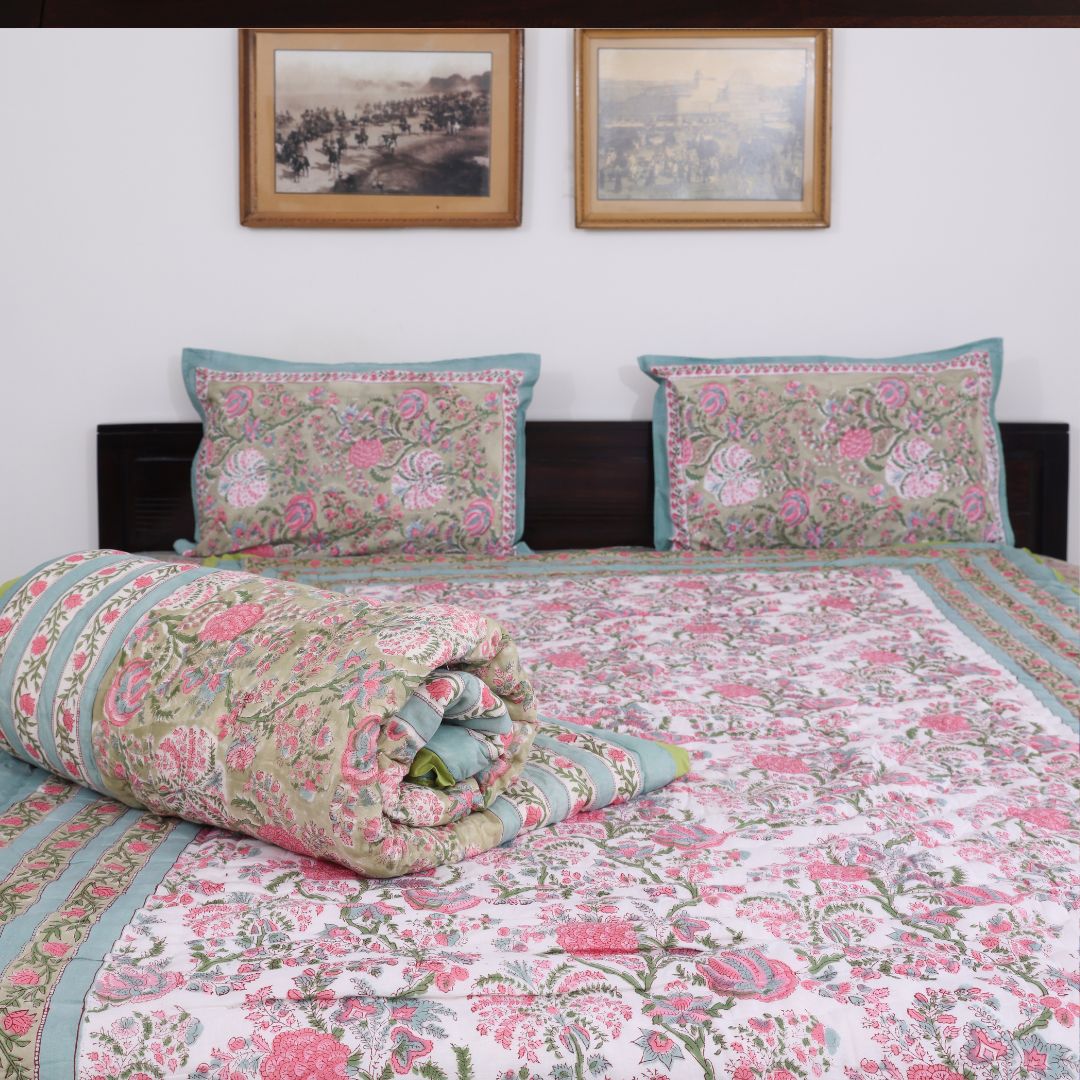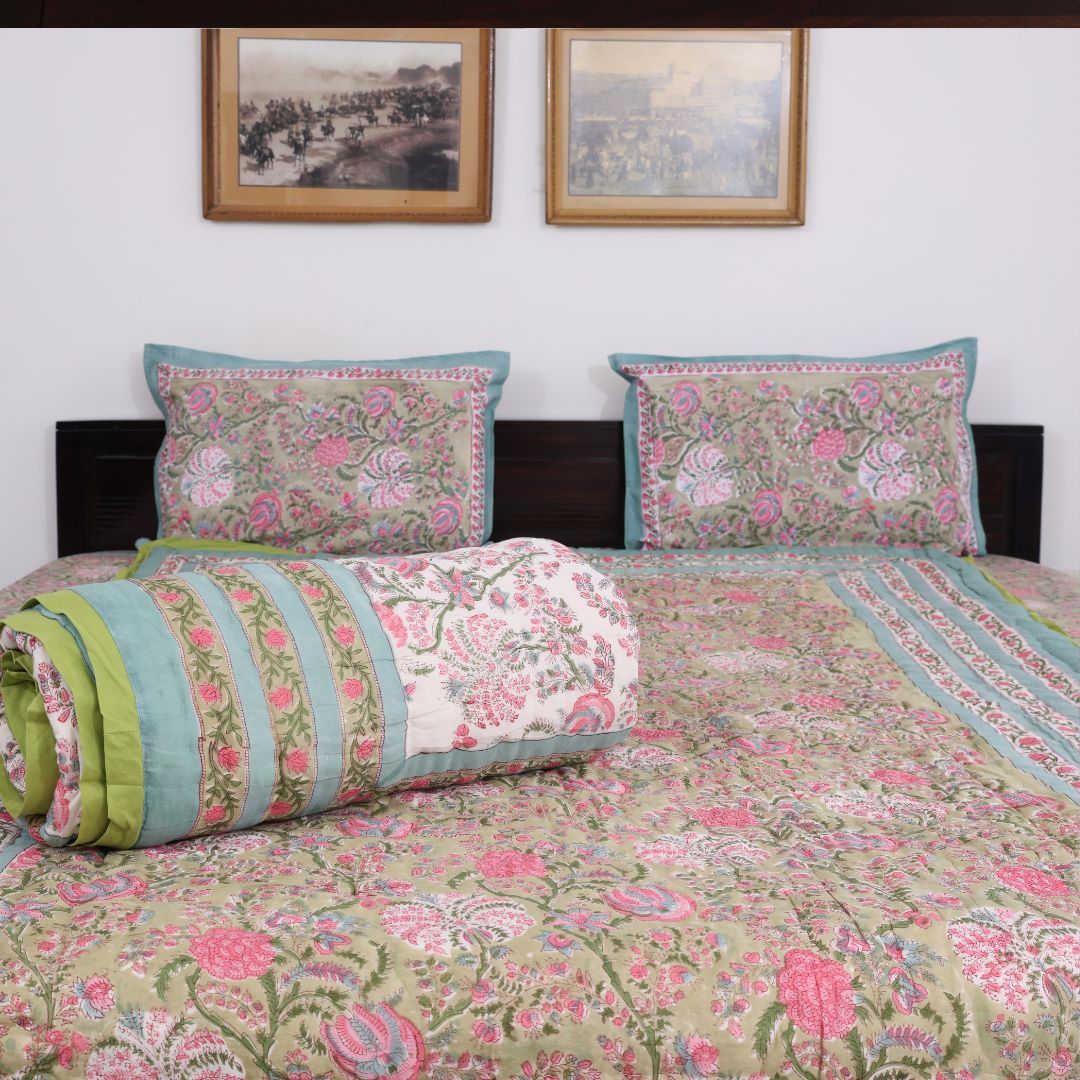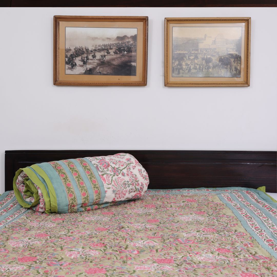 Brighten your bedroom with the delightful Floral Green and Pink Handblock Reversible Quilt. Crafted from 100% pure cotton mulmul, this quilt features intricate handblock-printed designs, celebrating Jaipur’s rich craftsmanship. The reversible design offers two charming patterns in vibrant green and pink hues, adding versatility to your decor. Filled with cotton, this quilt is perfect for providing warmth and comfort while enhancing the elegance of your space.