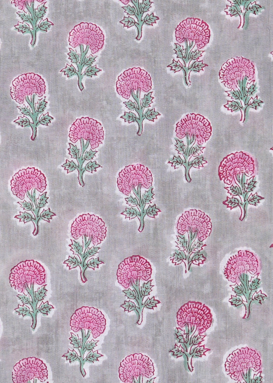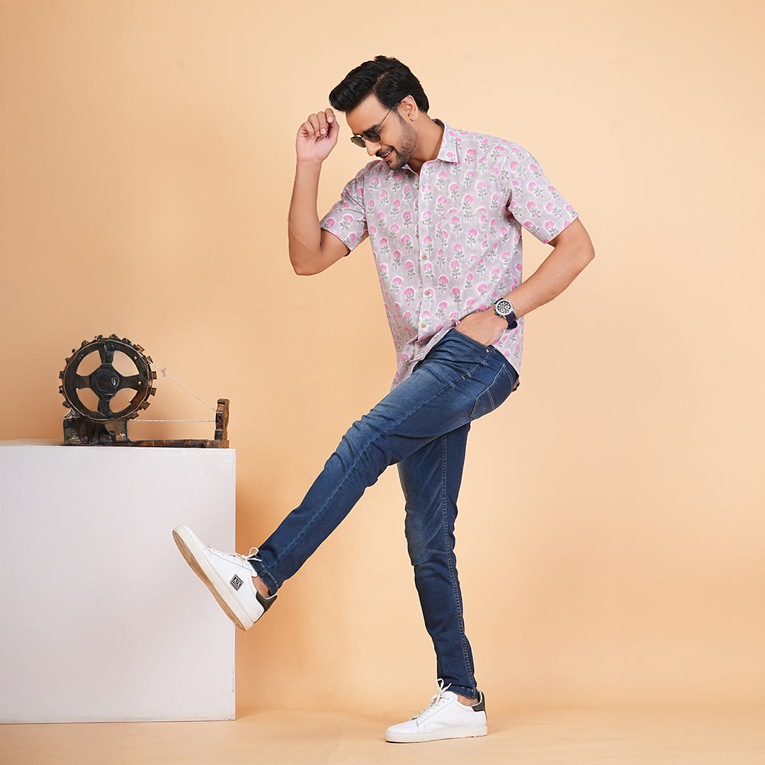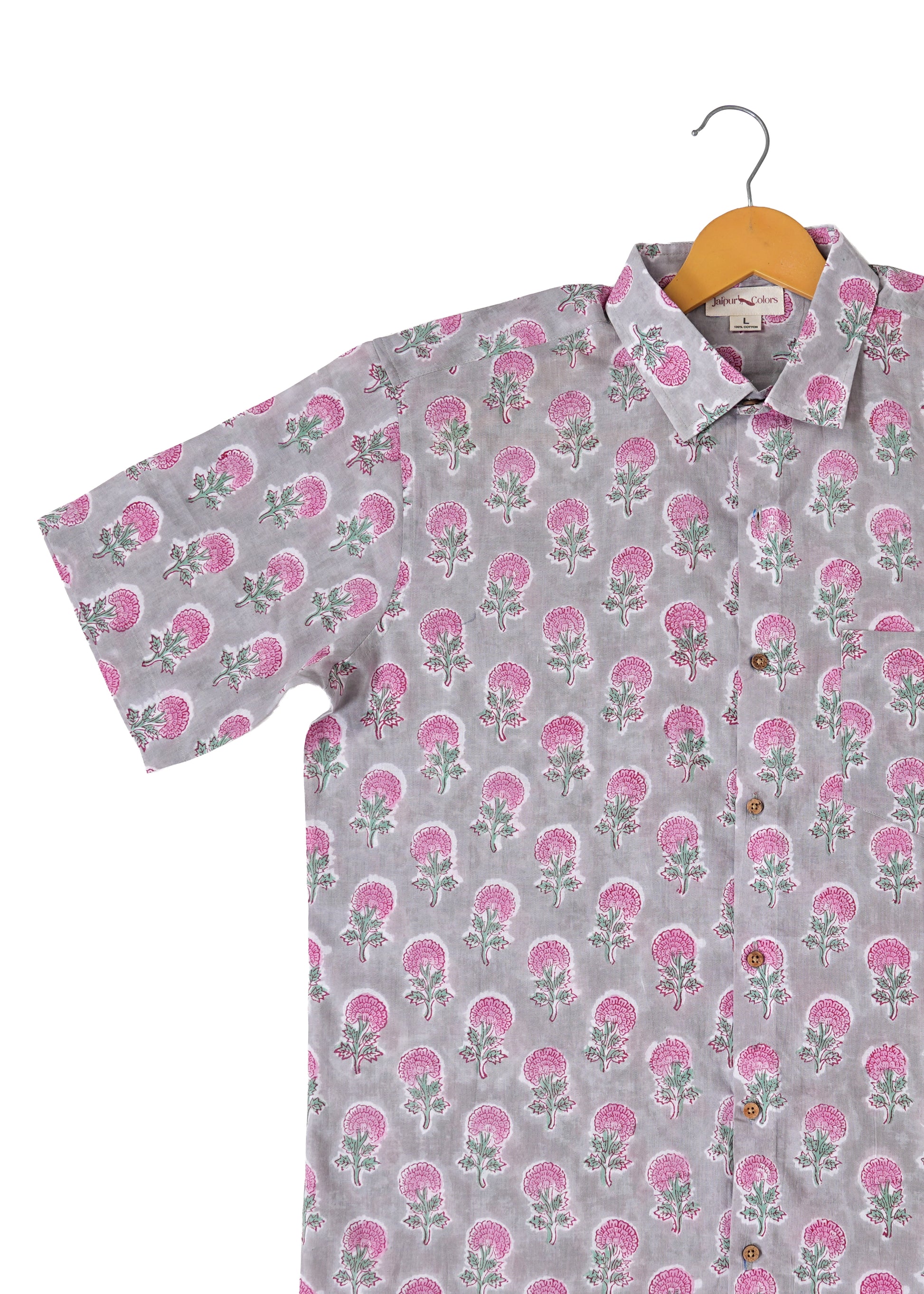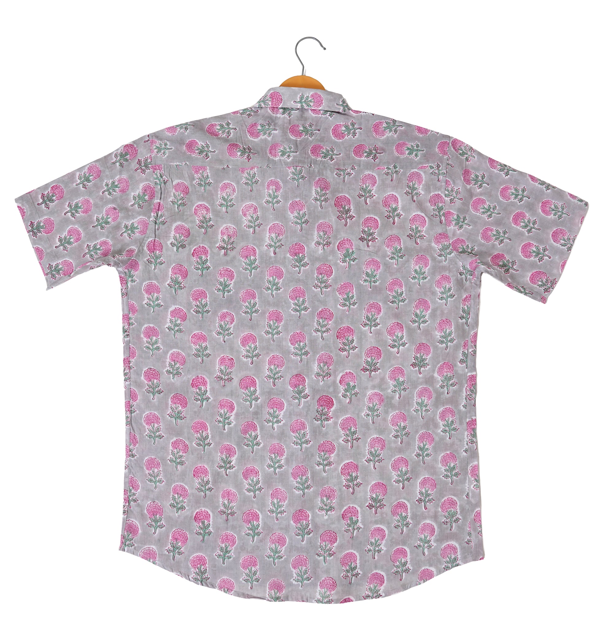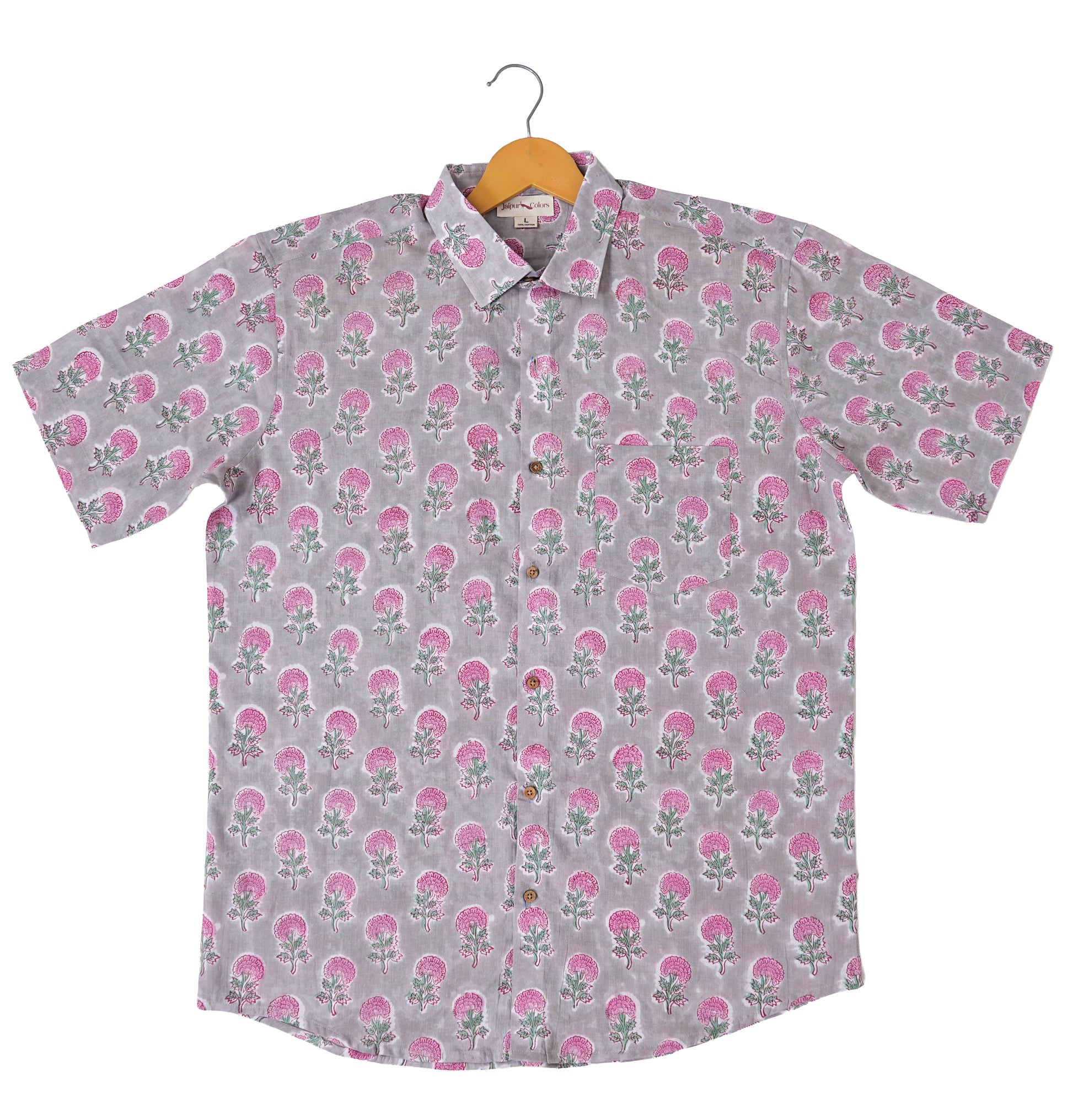 Made from 100% cotton, this grey shirt combines comfort with artisanal style in a regular fit. Featuring a charming handblock of pink flowers, it’s designed with a spread collar, half sleeves, and a front button placket with eco-friendly coconut shell buttons. Hand wash recommended. Ethically made in India.