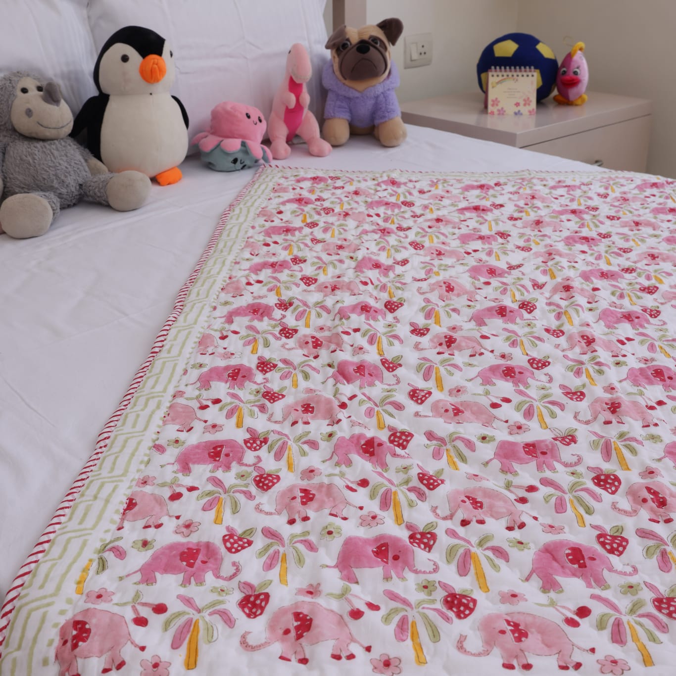 Handblock Printed Cotton Kids’ Quilt – Pink Elephant Design