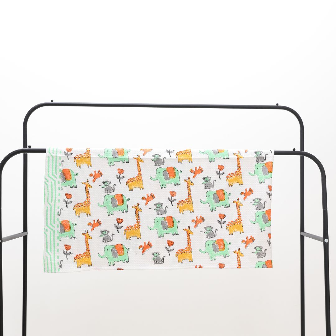 Turn everyday routines into joyful moments with the Kid Giraffe Handblock Towel. Designed with playful giraffe motifs, this towel celebrates the artistry of Jaipur’s handblock printing tradition. Made from 100% pure cotton in a soft waffle weave, it offers exceptional absorbency and comfort for your little ones. Meticulously crafted by skilled artisans, this towel brings together the charm of traditional craftsmanship and the practicality needed for daily use.