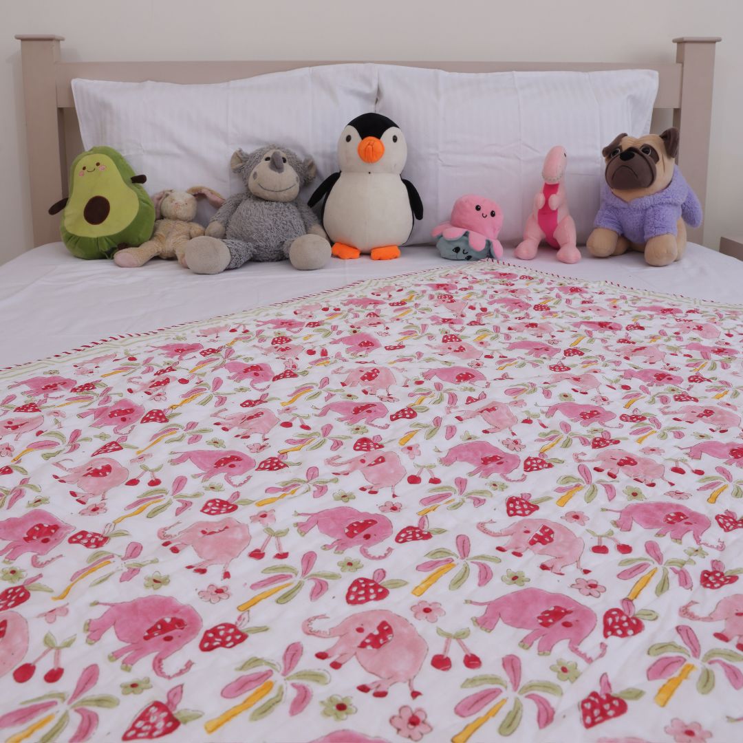 Add a pop of charm to your child’s bedtime with the Kid Pink Elephant Handblock Dohar. Featuring adorable pink elephant motifs, this dohar is crafted from ultra-soft cotton mulmul and filled with flannel for gentle warmth. The vibrant handblock prints celebrate Jaipur’s traditional craftsmanship, making it a delightful addition to your little one’s space. Durable, and machine washable, this dohar offers both comfort and convenience for everyday use.
