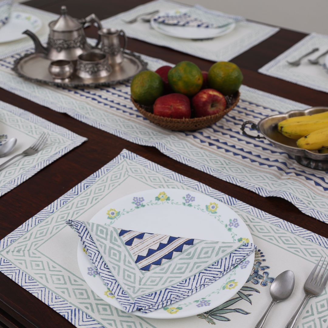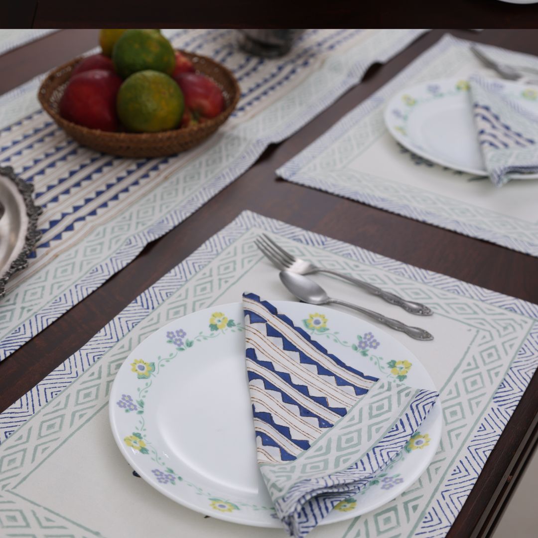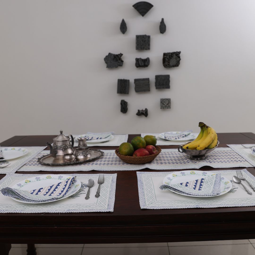 Add a refreshing touch to your dining table with the Light Blue Handblock Dining Set. Featuring soothing light blue floral motifs, this set includes handblock-printed table mats, napkins, and a runner, all made from premium 100% cotton canvas. Skillfully crafted by Jaipur’s artisans, this set embodies elegance and traditional craftsmanship, perfect for enhancing any meal, whether casual or celebratory.