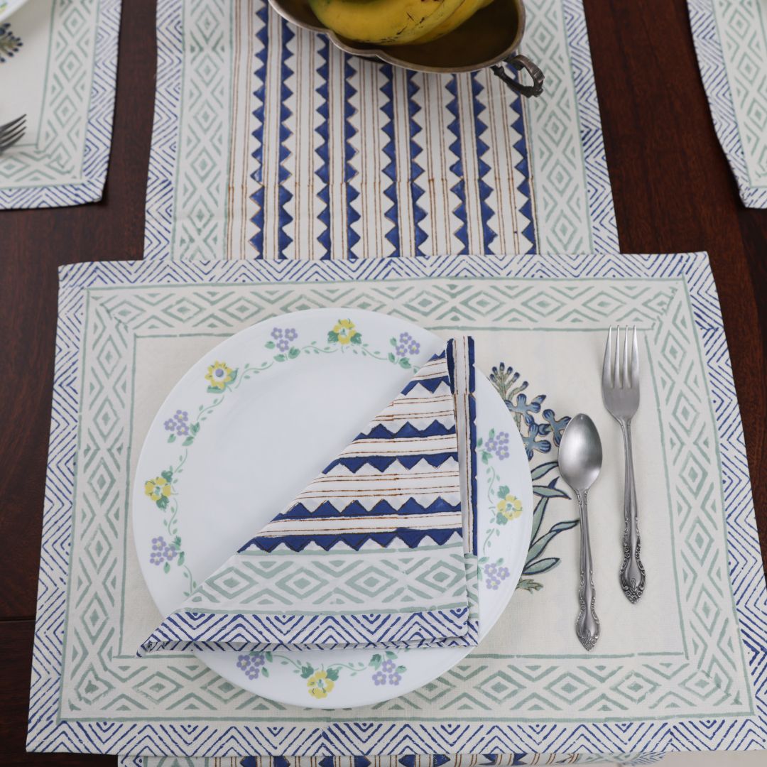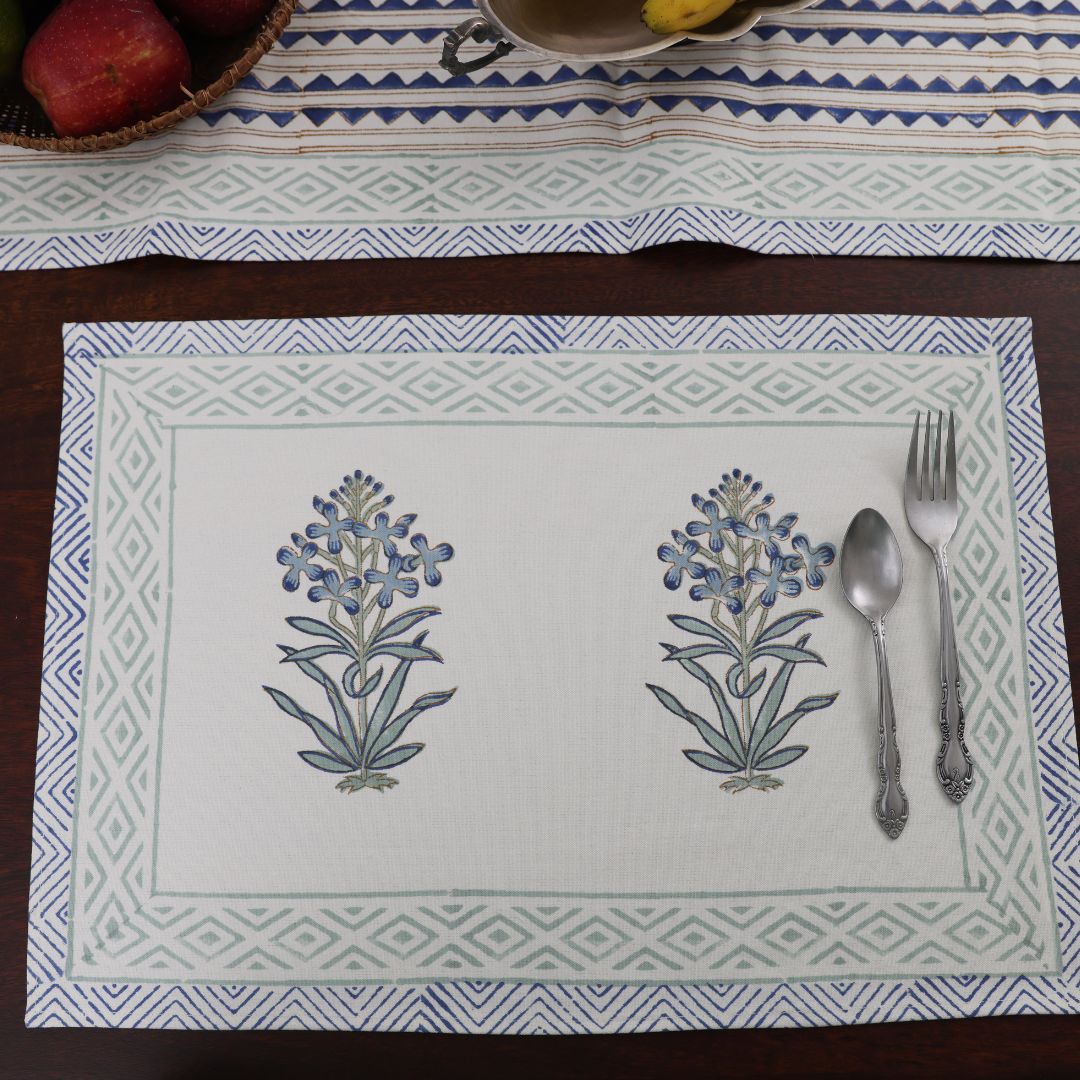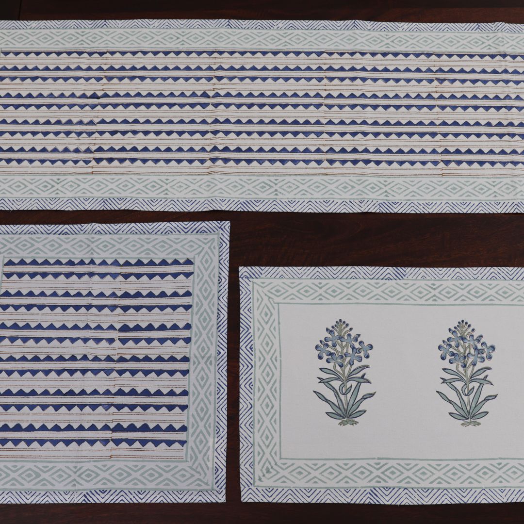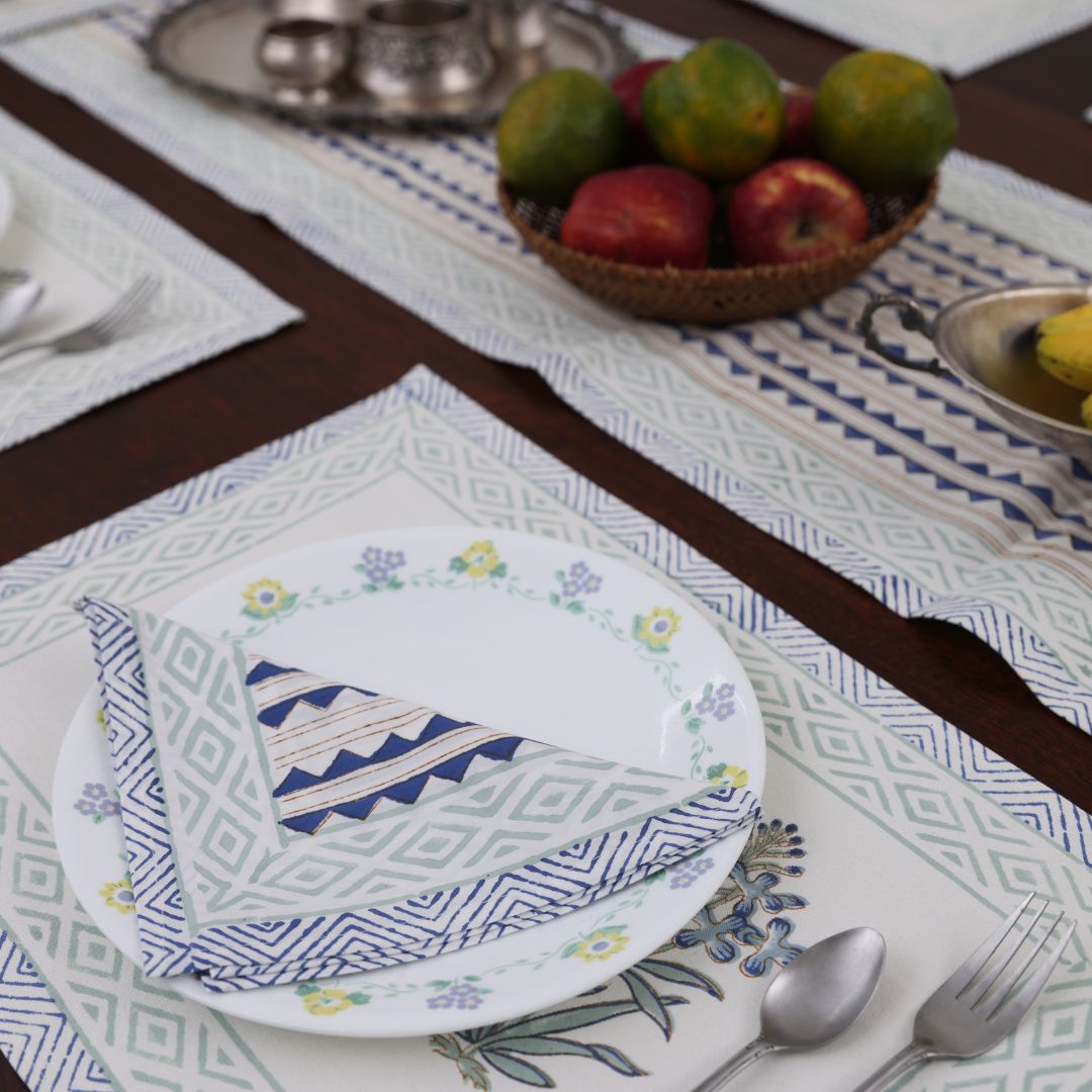 Add a refreshing touch to your dining table with the Light Blue Handblock Dining Set. Featuring soothing light blue floral motifs, this set includes handblock-printed table mats, napkins, and a runner, all made from premium 100% cotton canvas. Skillfully crafted by Jaipur’s artisans, this set embodies elegance and traditional craftsmanship, perfect for enhancing any meal, whether casual or celebratory.
