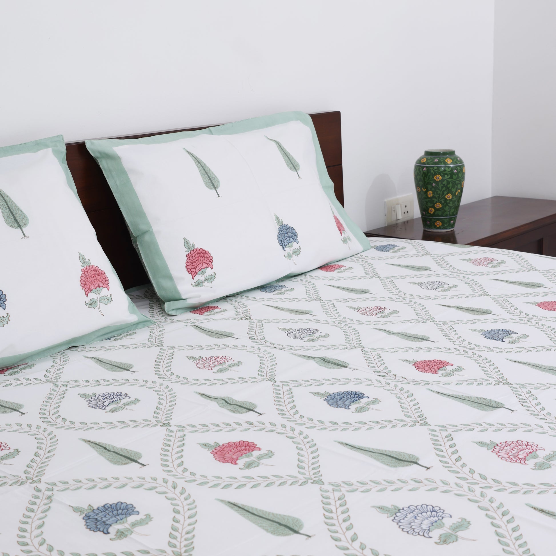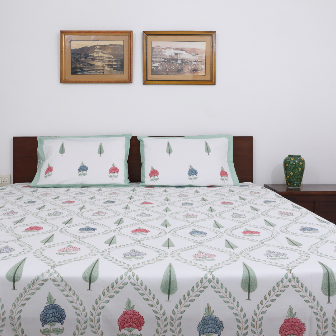Enhance your bedroom with the serene beauty of the Light Jaal Handblock Printed Percale Bedsheet. Featuring a delicate jaal pattern with intricately handblock-printed tree motifs in soothing blue and green hues, this bedsheet exudes elegance and tranquility. Crafted from premium-quality cotton, it offers unmatched comfort, breathability, and durability. Perfect for adding a fresh and minimalist look to your home decor, this bedsheet is an ideal choice for any season.