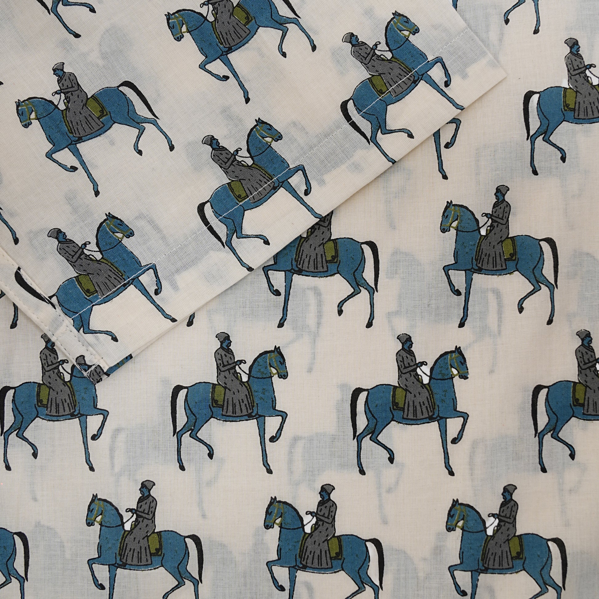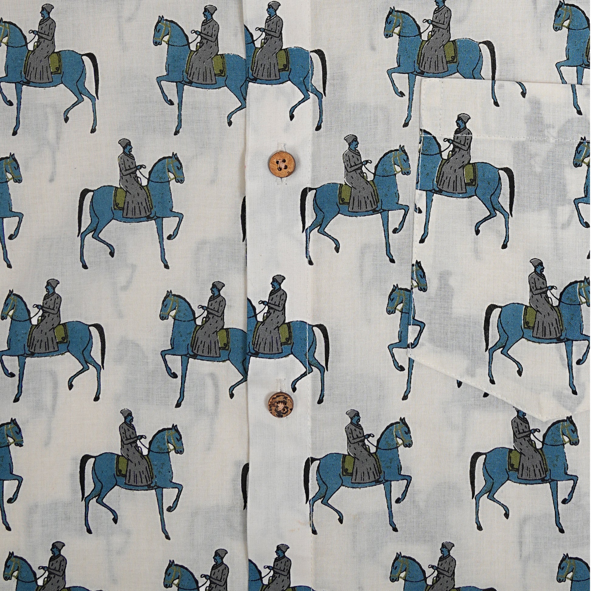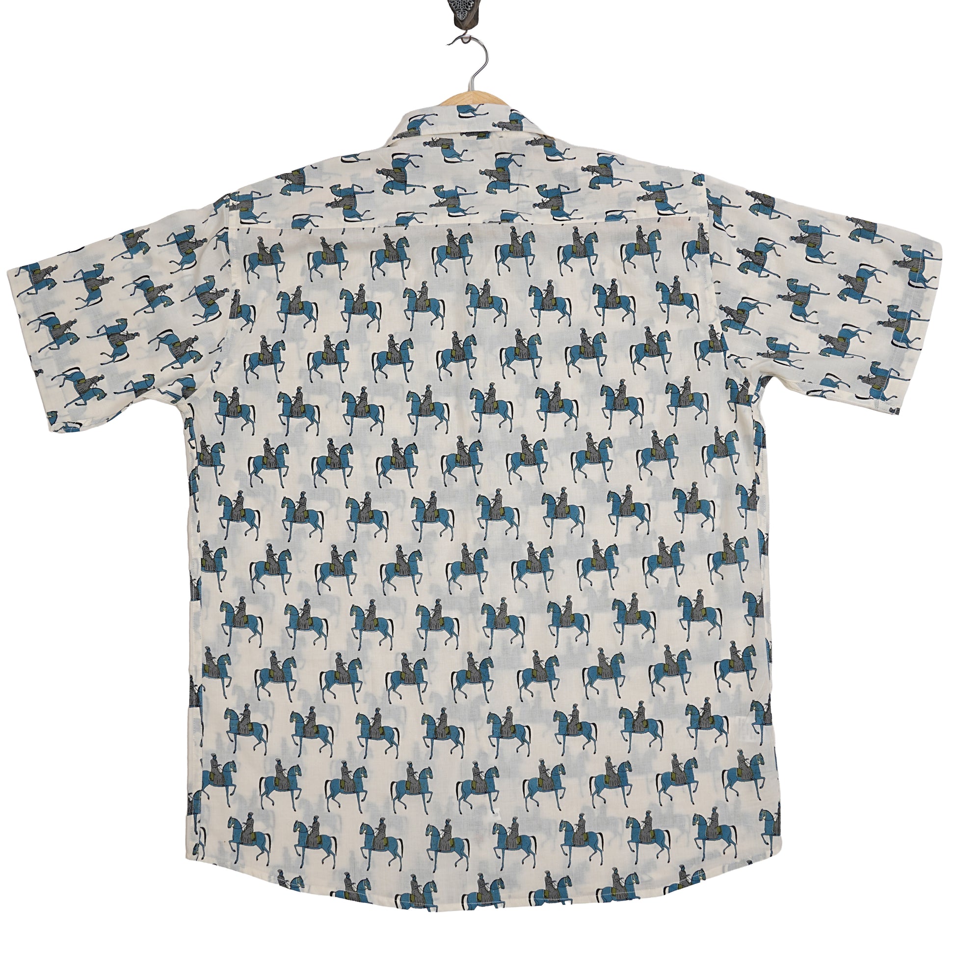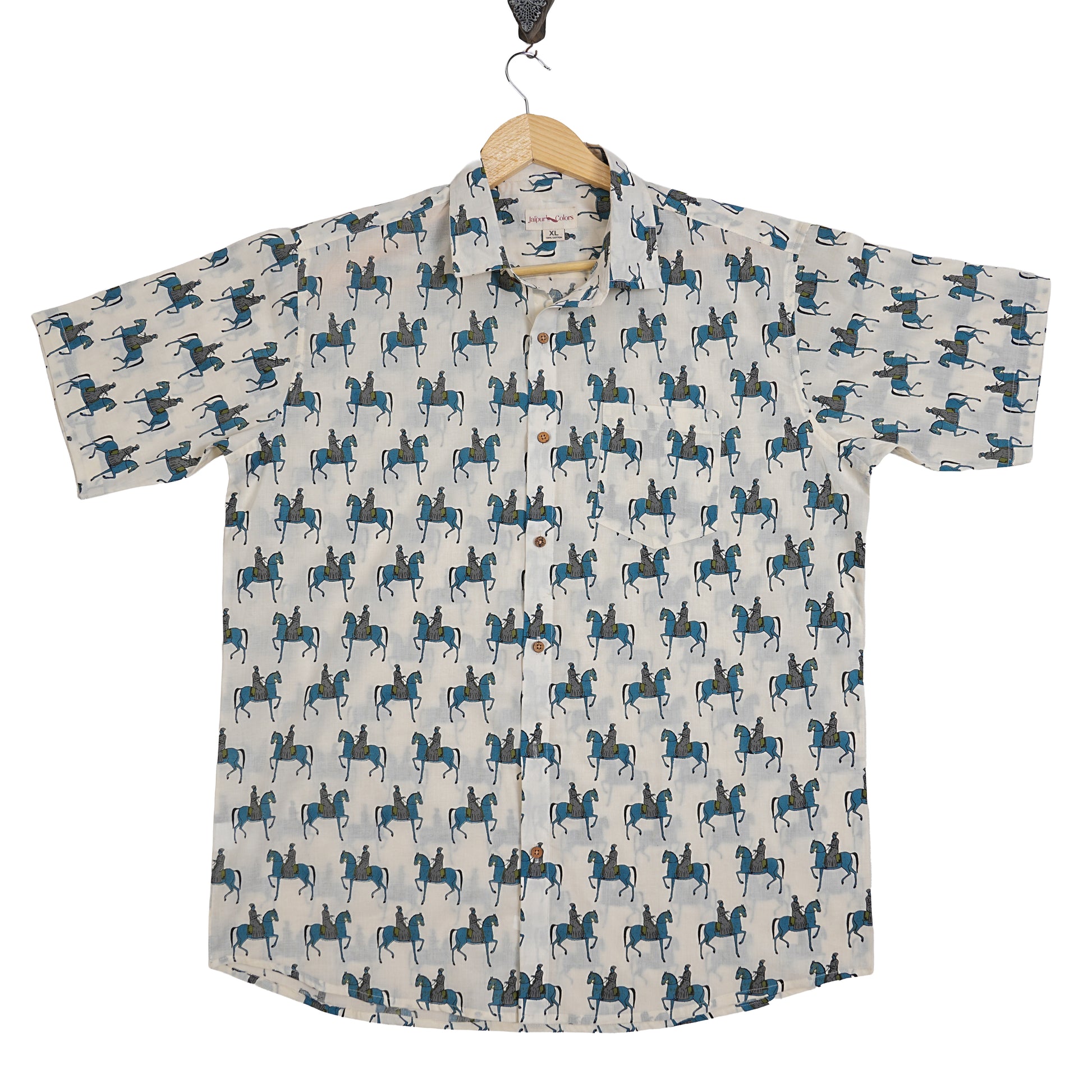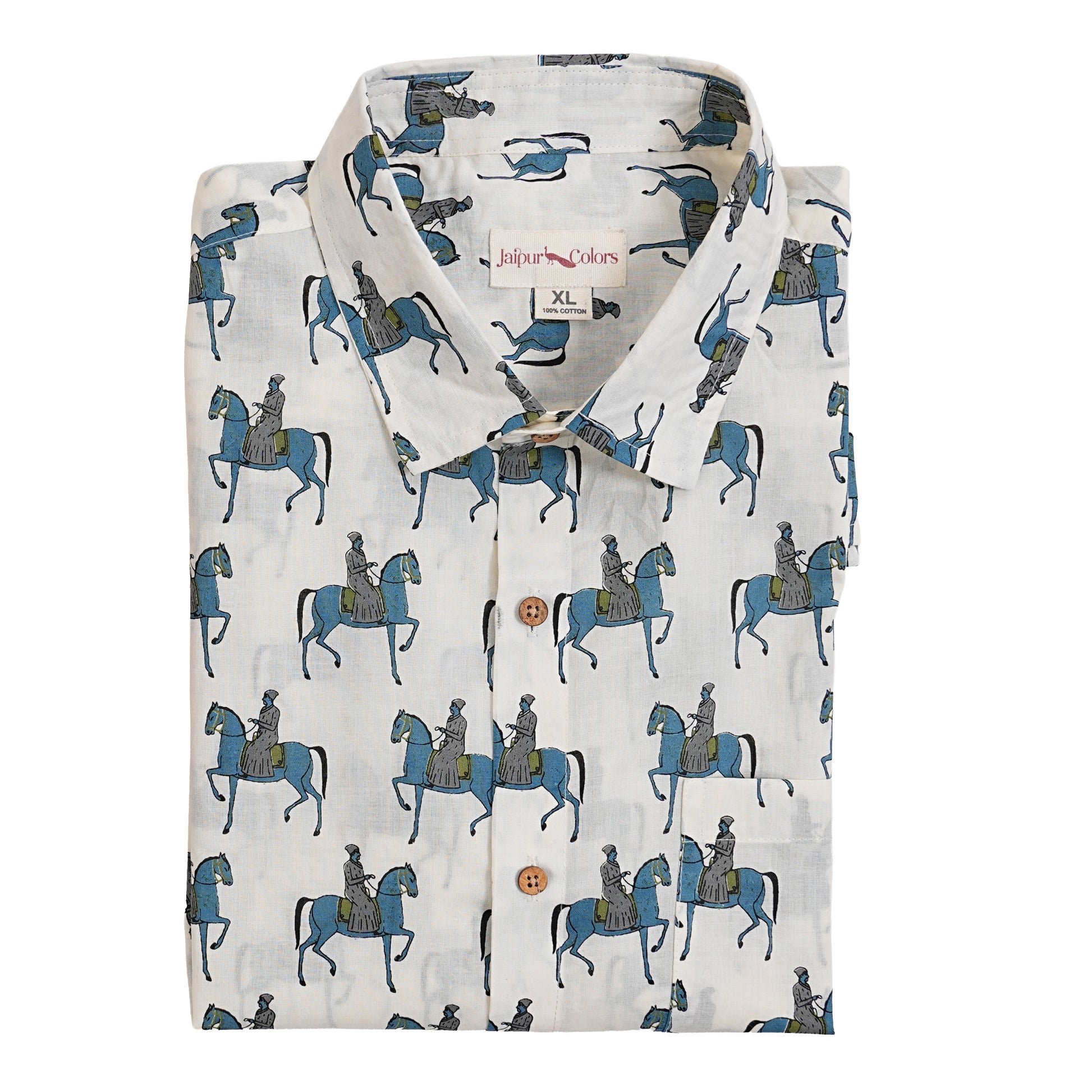 Crafted from 100% cotton, this regular-fit shirt offers breathable comfort with a rich cultural flair. Featuring an intricate screen print inspired by Maharana Pratap, set against a classic blue base, the design reflects heritage and strength in a modern silhouette. Finished with a spread collar, half sleeves, and a front button placket, this shirt is a standout piece for those who appreciate history with style. Ethically made in India.