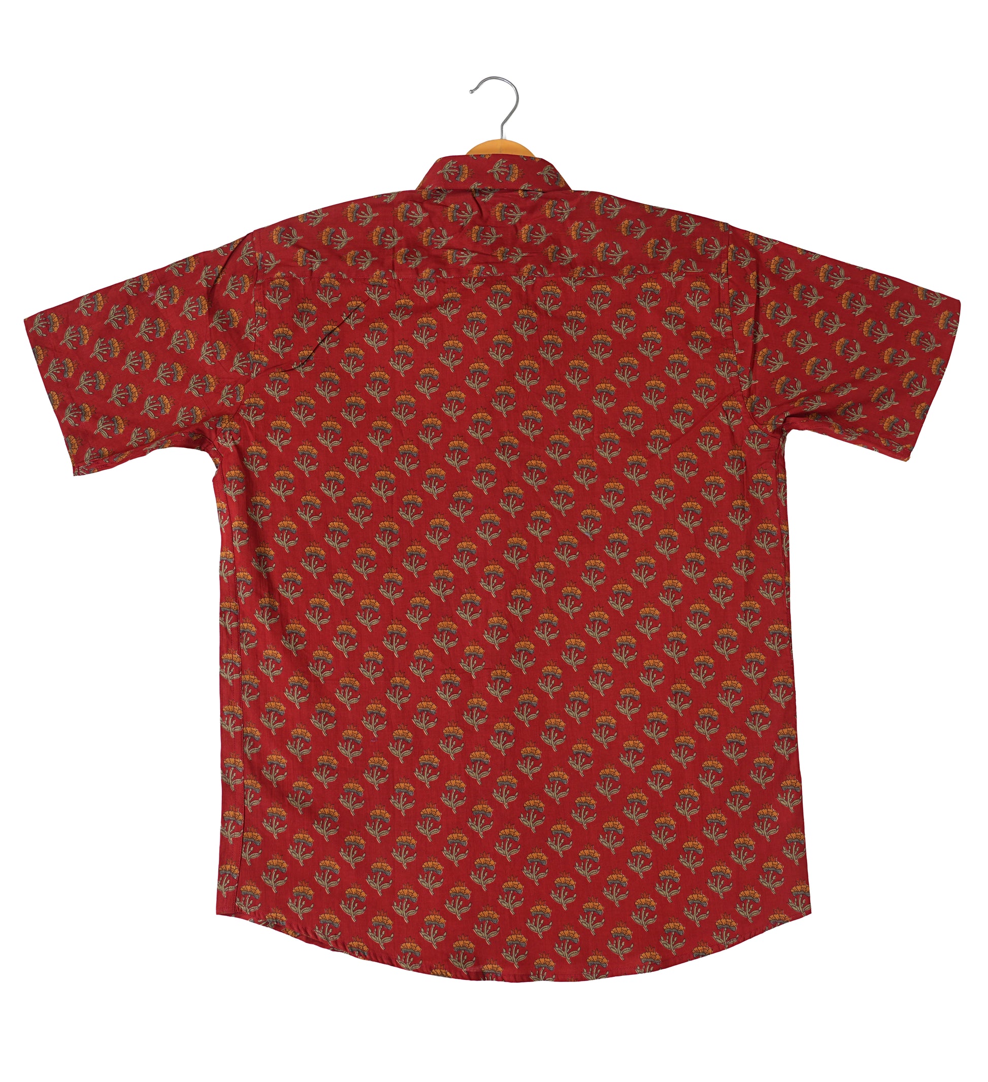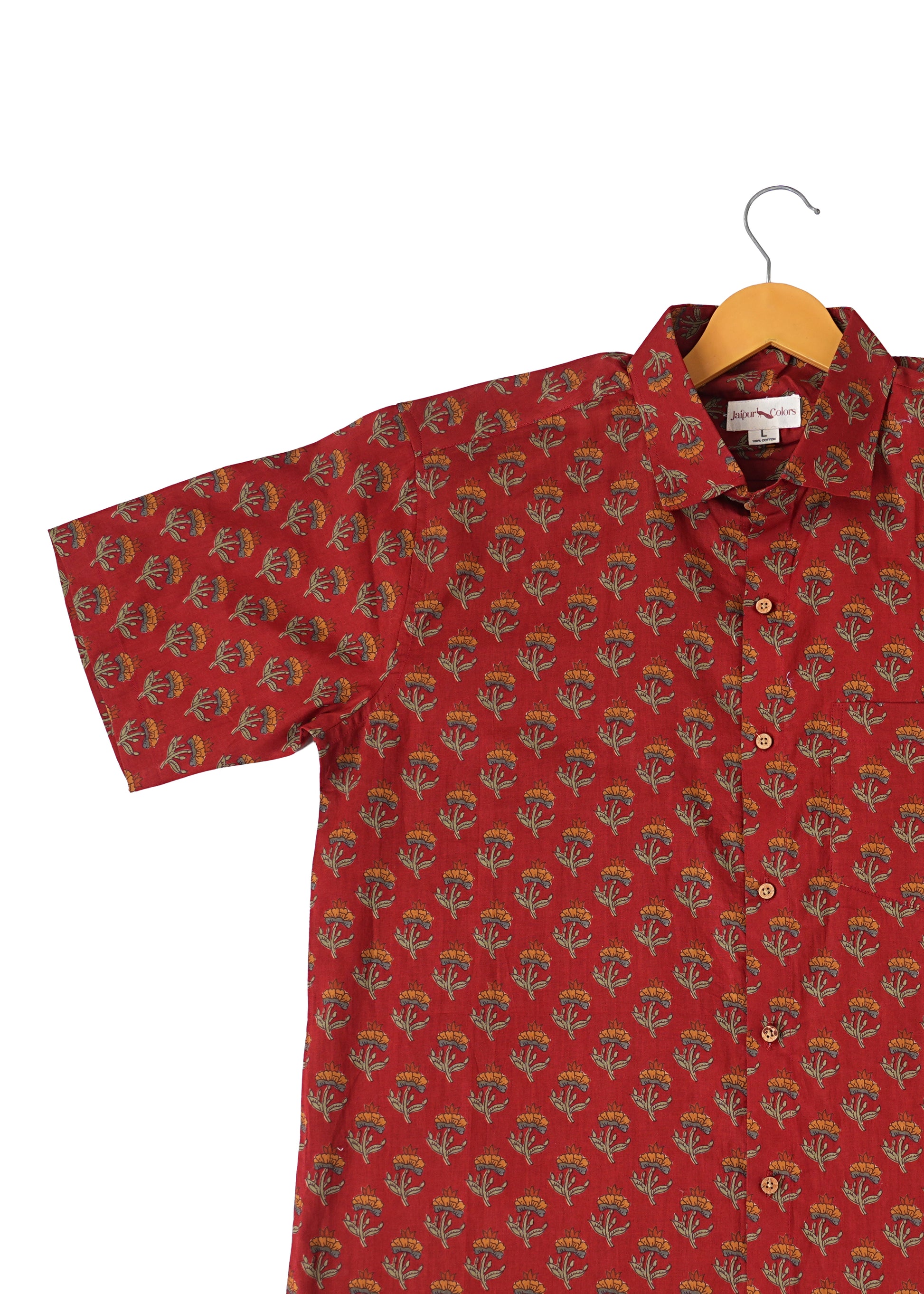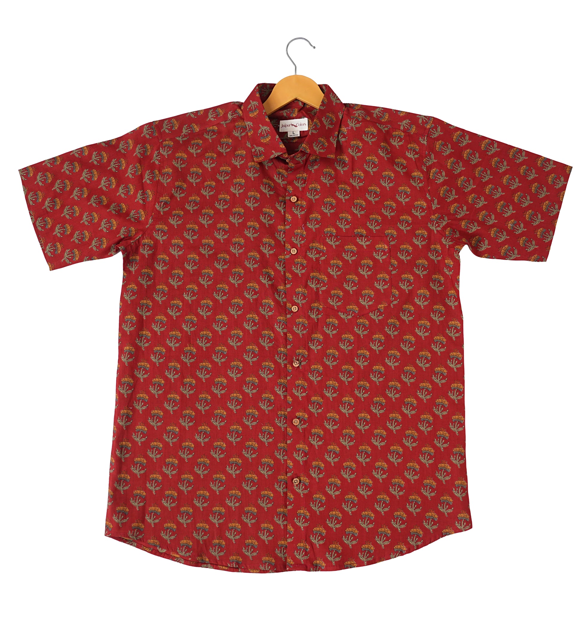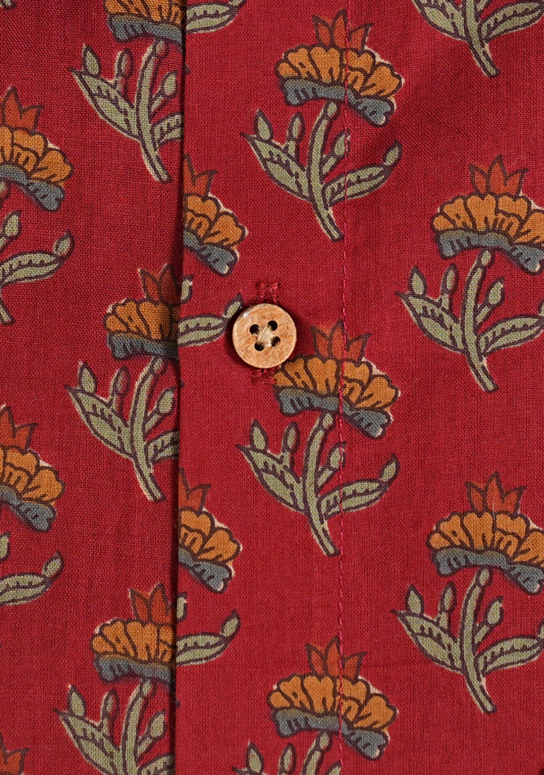Crafted from 100% cotton, this maroon shirt offers a soft, breathable feel in a regular fit. Highlighted by a mustard flower screen print, it features a spread collar, half sleeves, and a front button placket with eco-friendly coconut shell buttons. Ethically made in India.