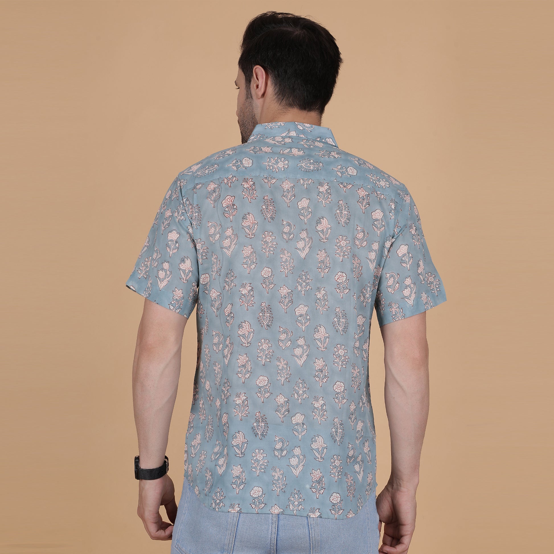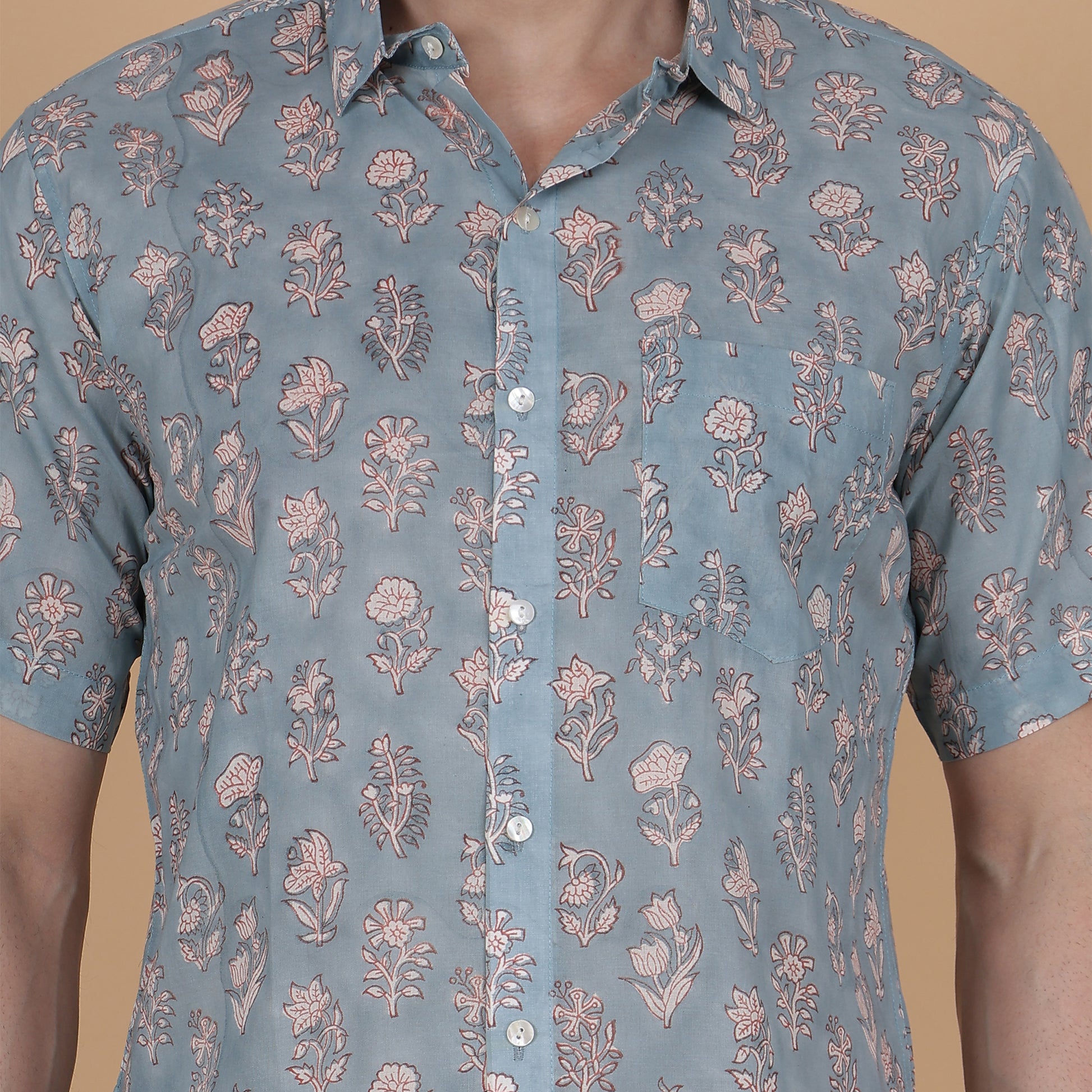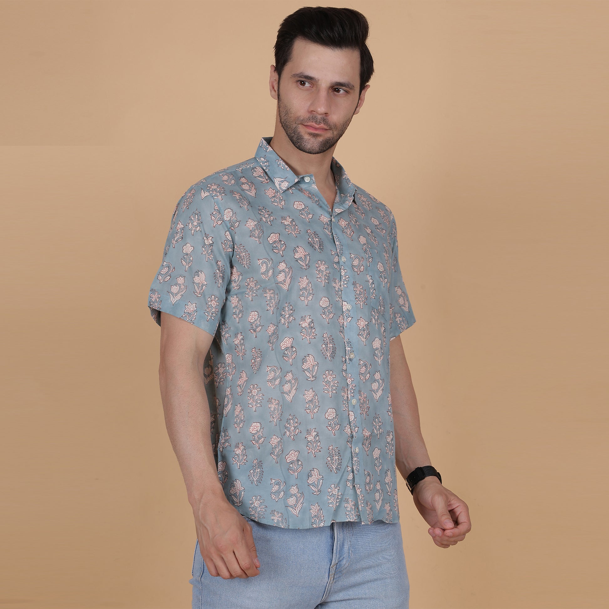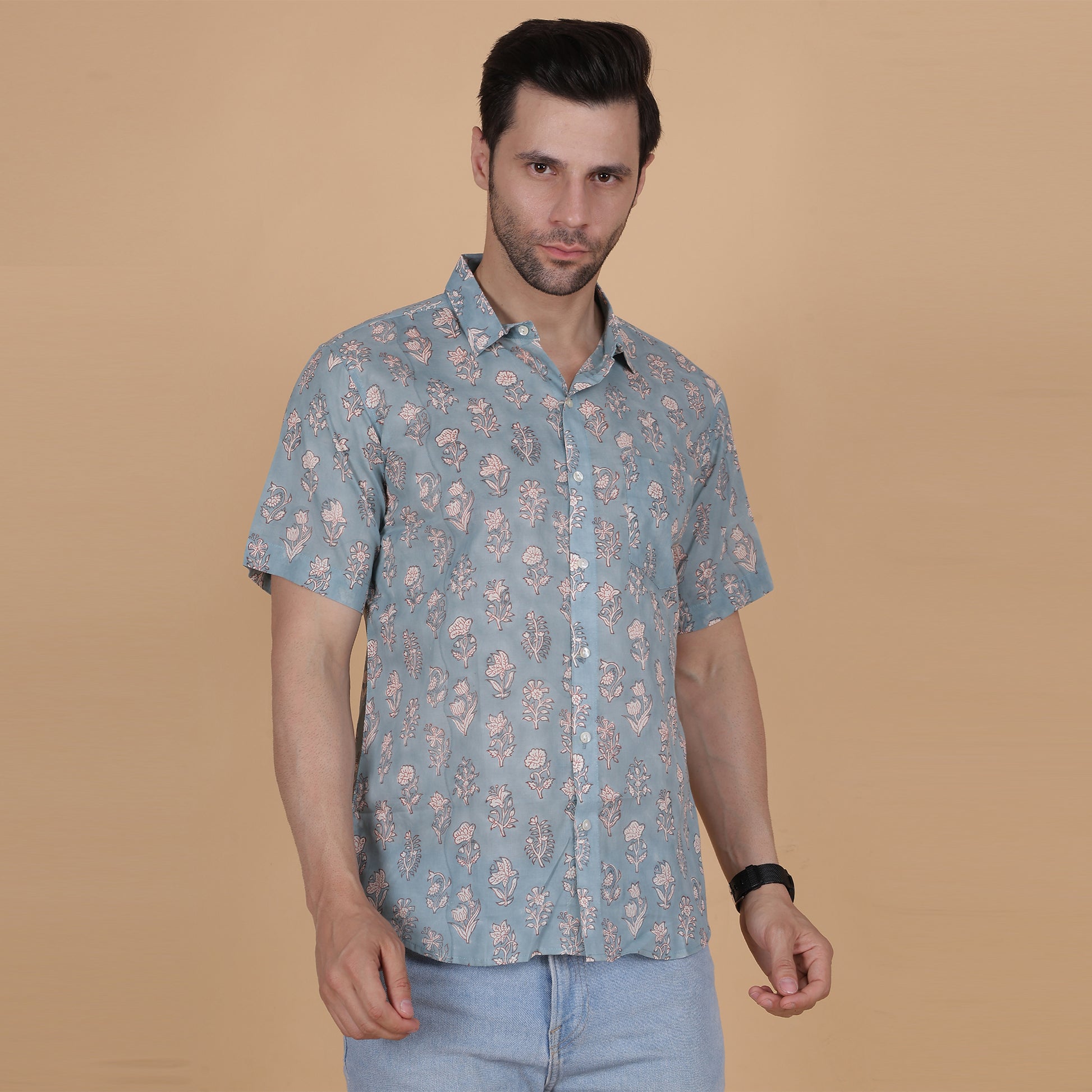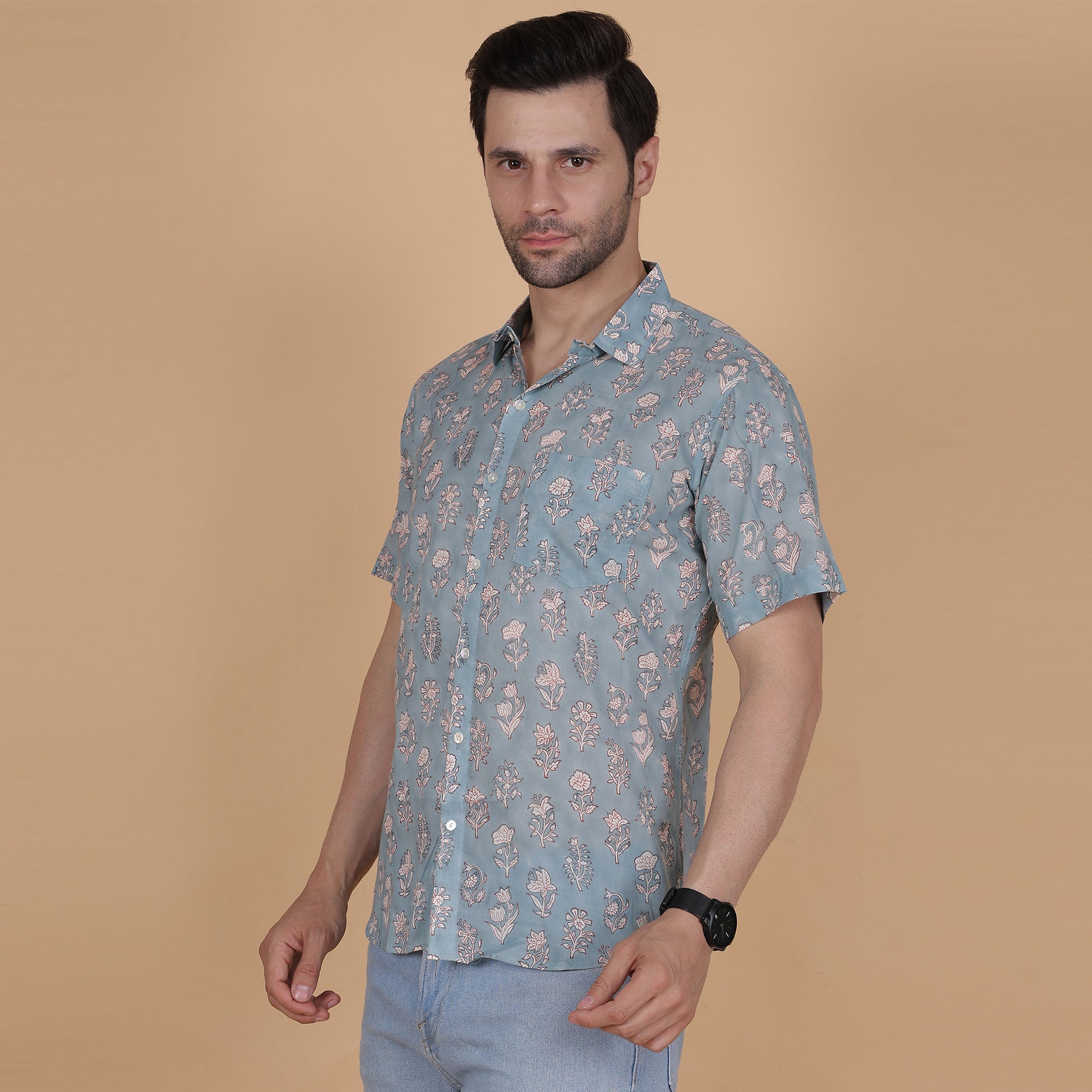 Men's Cotton Half-Sleeve Shirt with Botanical Handblock Print