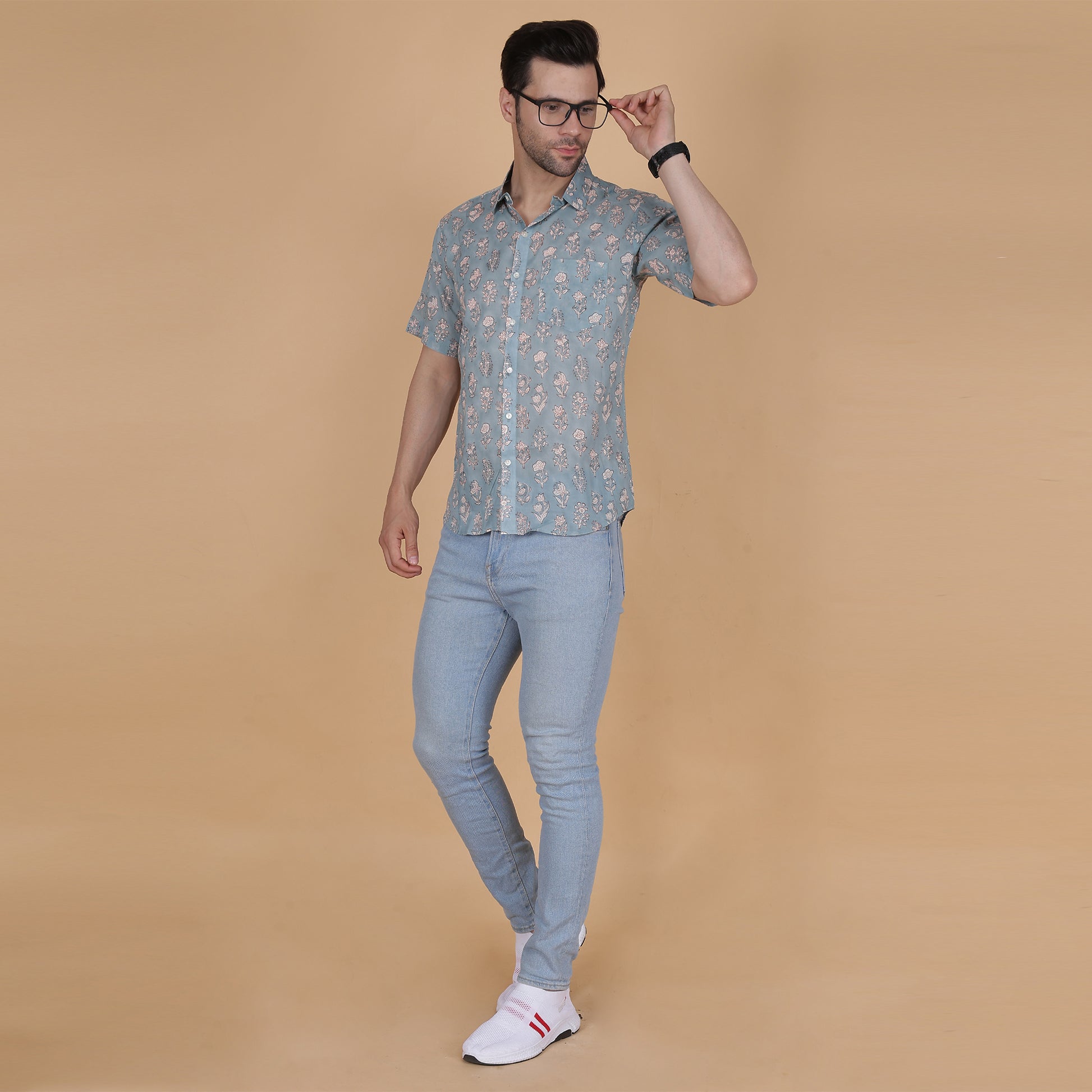 Celebrate timeless craftsmanship with this Men's Cotton Half-Sleeve Shirt, featuring a delicate botanical handblock print on a soothing teal base. Handcrafted using traditional block printing techniques, this shirt combines heritage artistry with contemporary style. Made from 100% breathable cotton, it ensures comfort and elegance for casual outings, festive occasions, or summer gatherings.