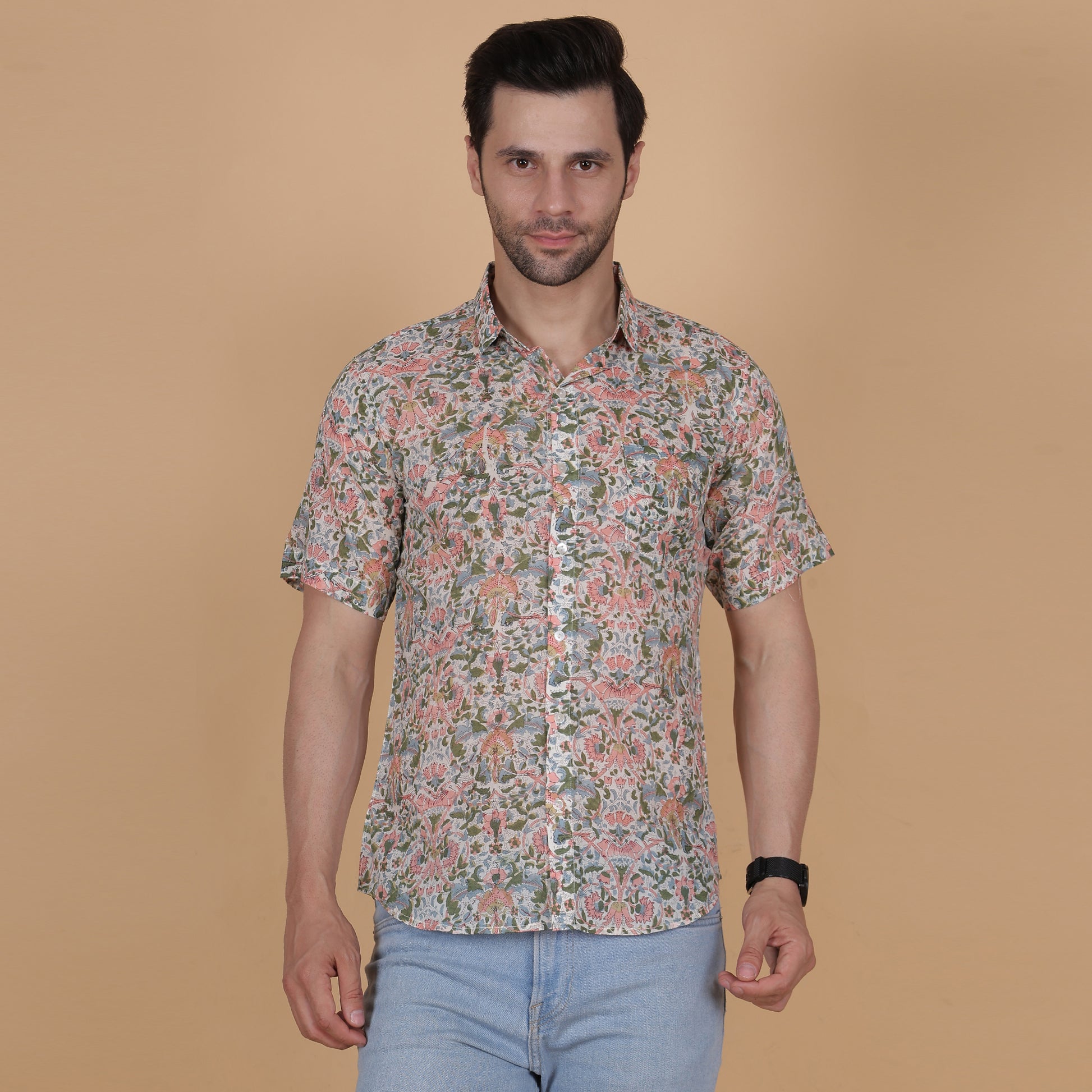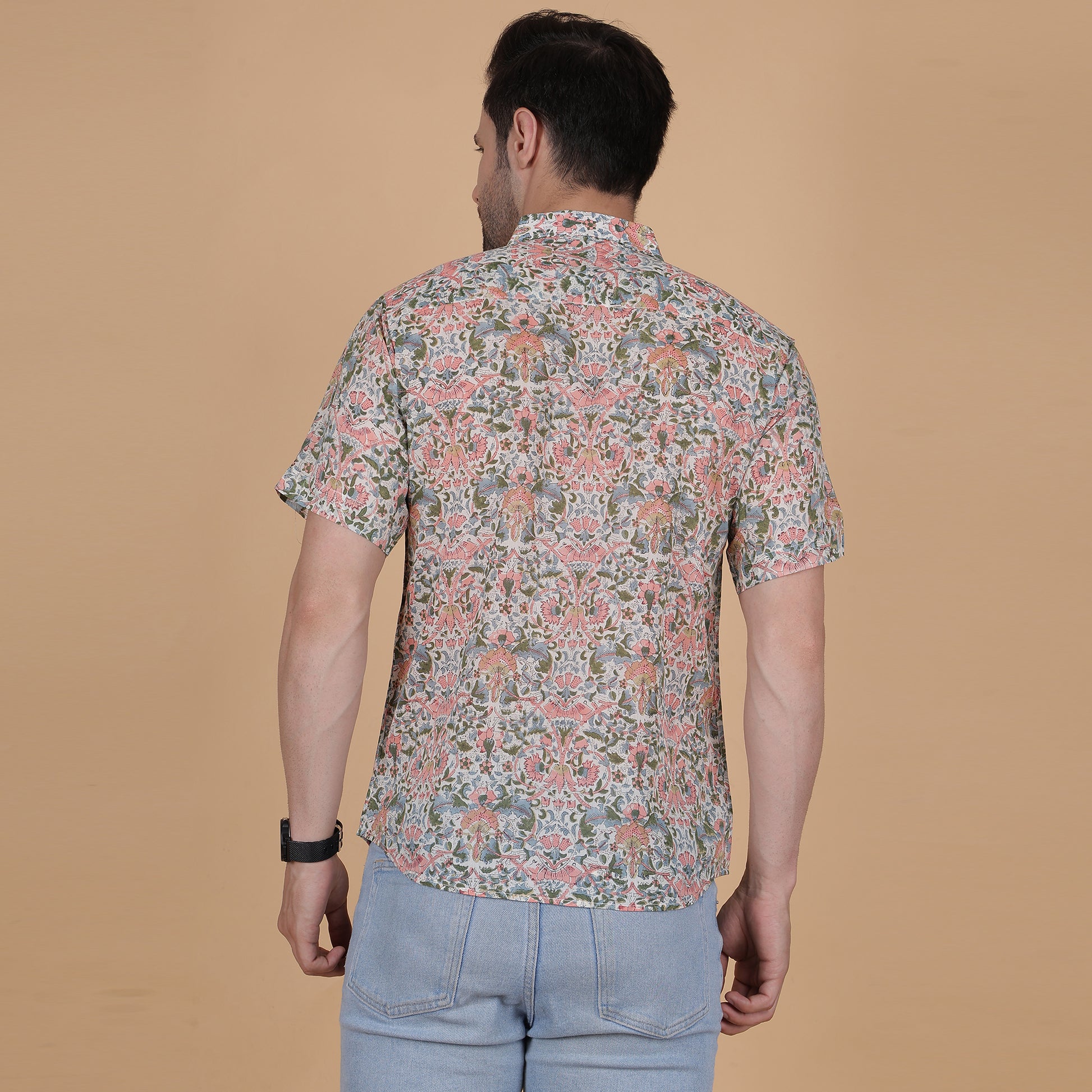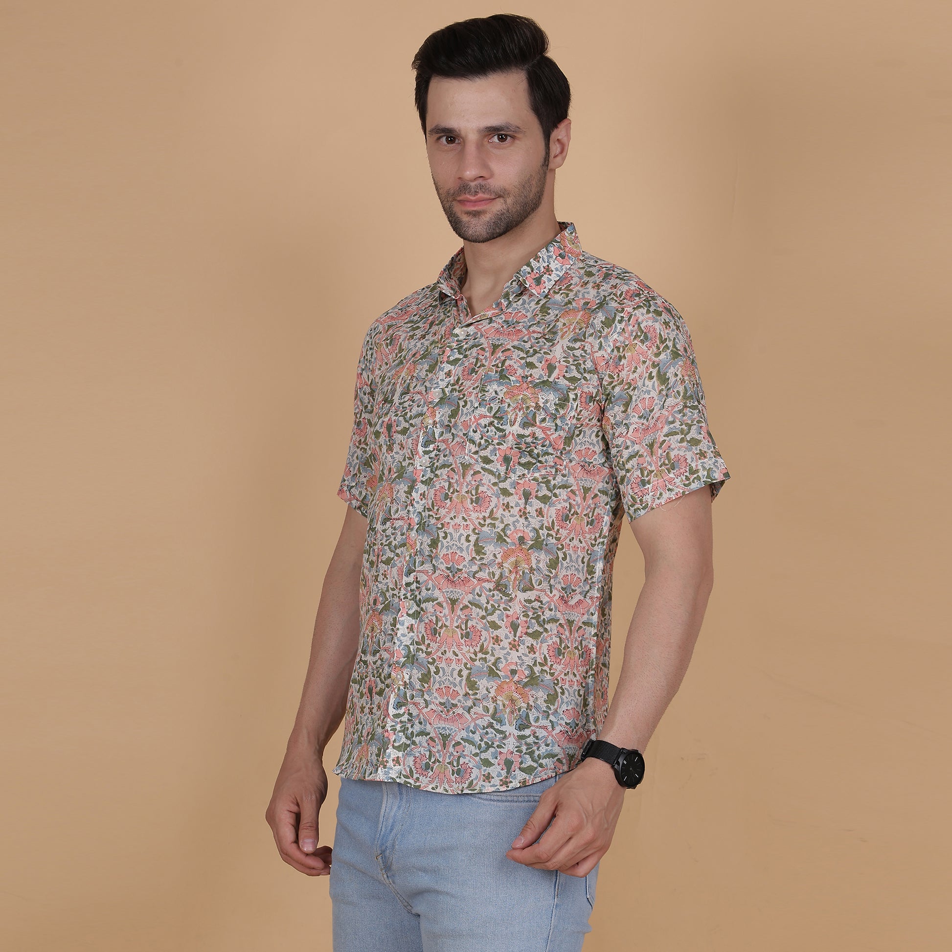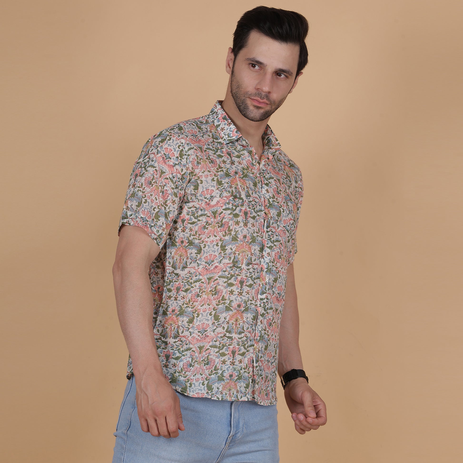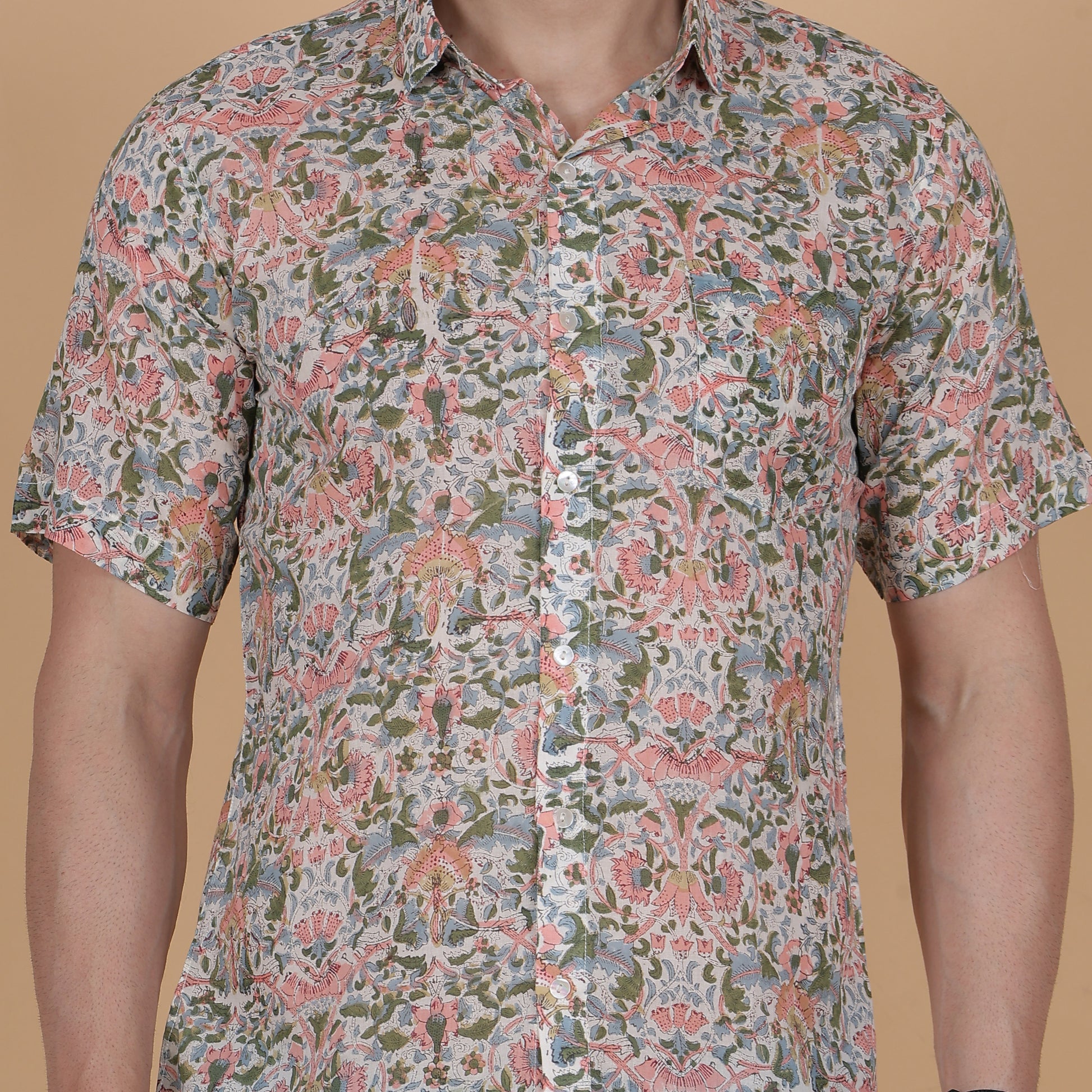 Men's Cotton Half-Sleeve Shirt with Pastel Handblock Floral Print