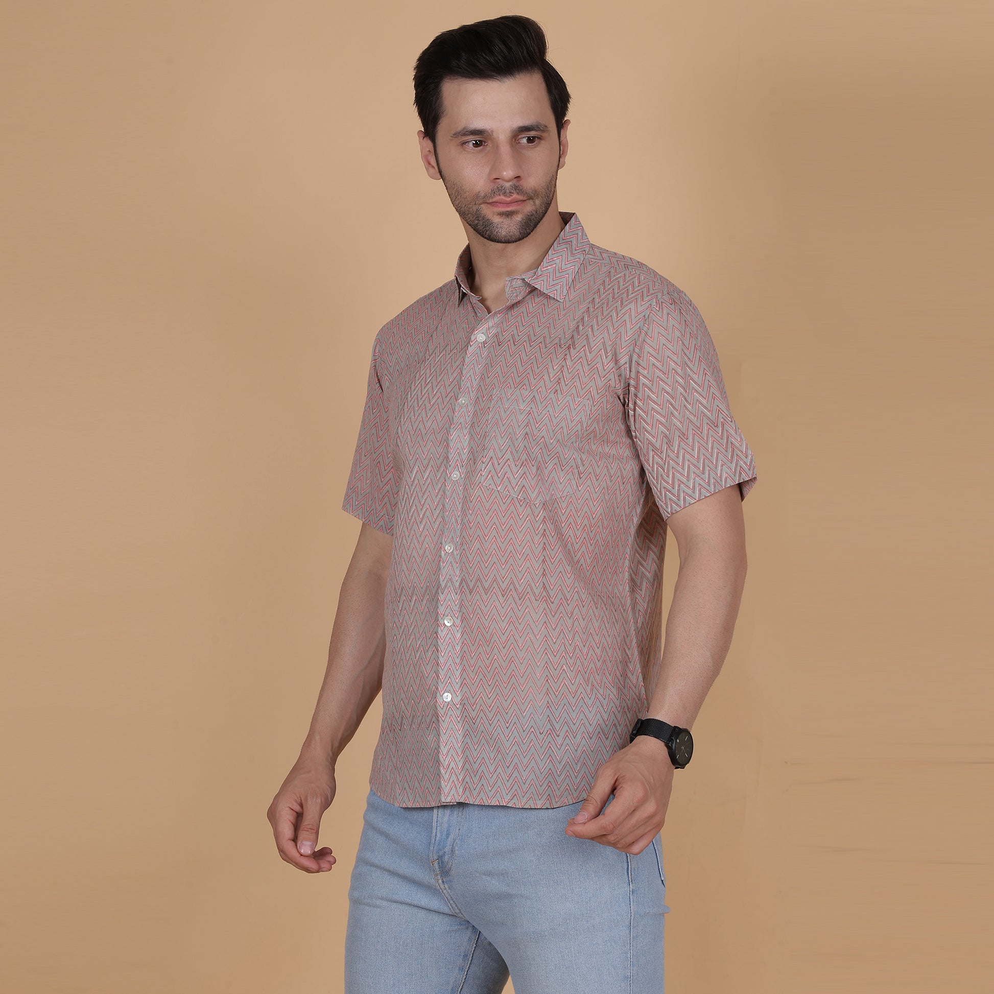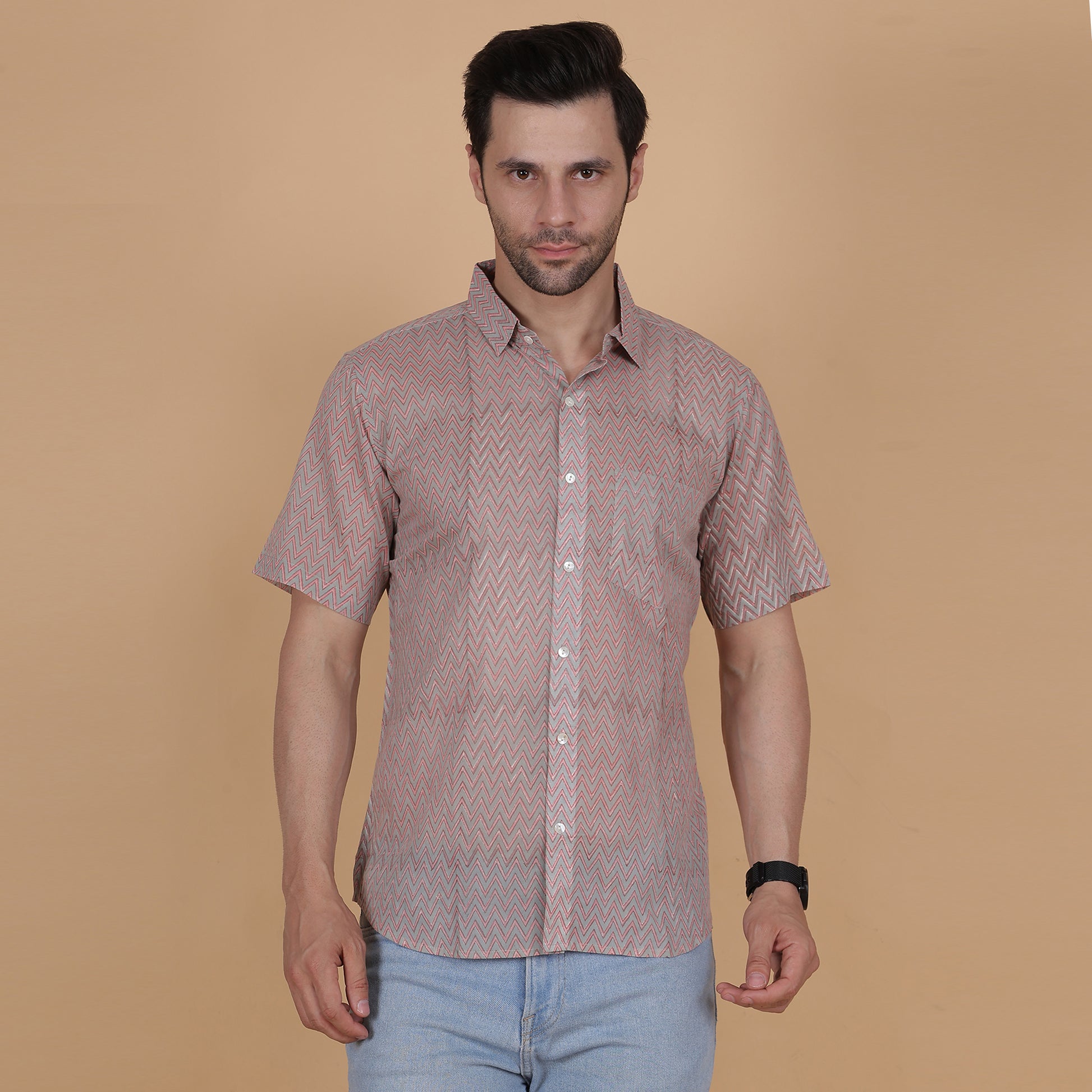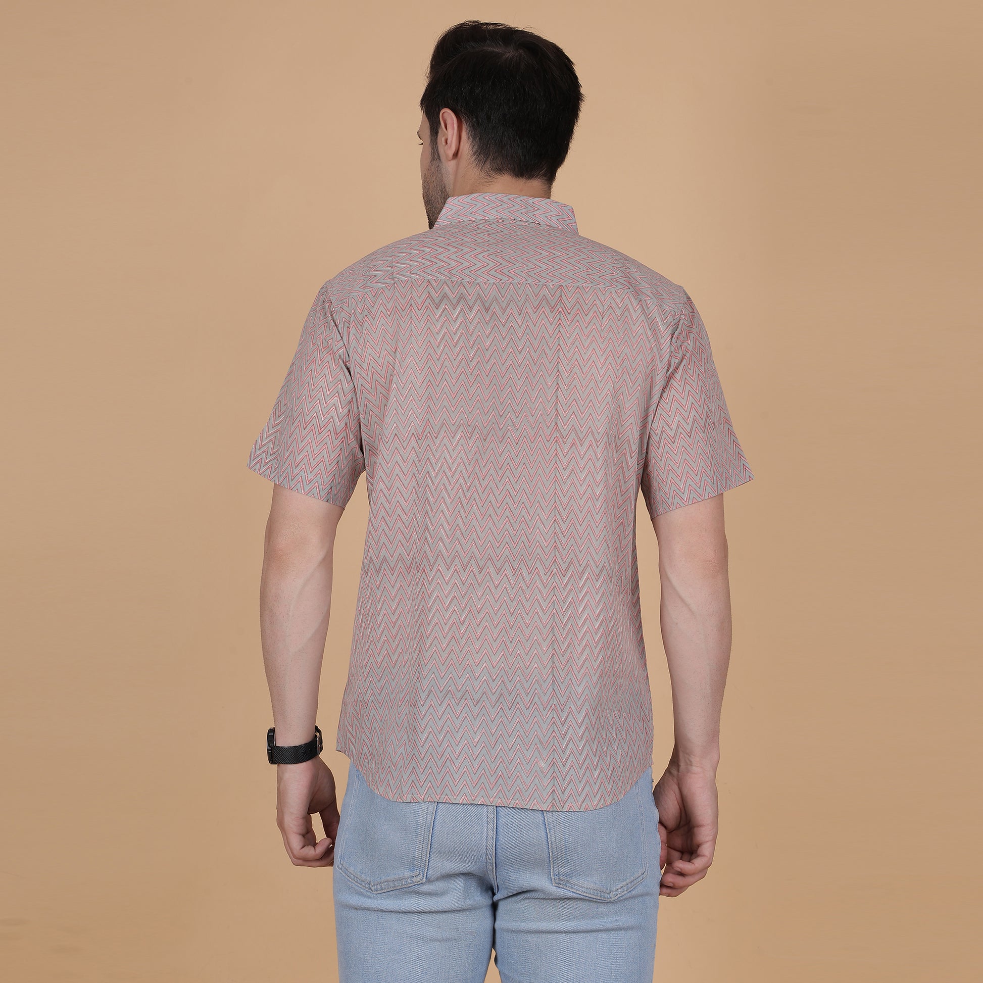 Men's Cotton Half-Sleeve Shirt with Zigzag Handblock Print