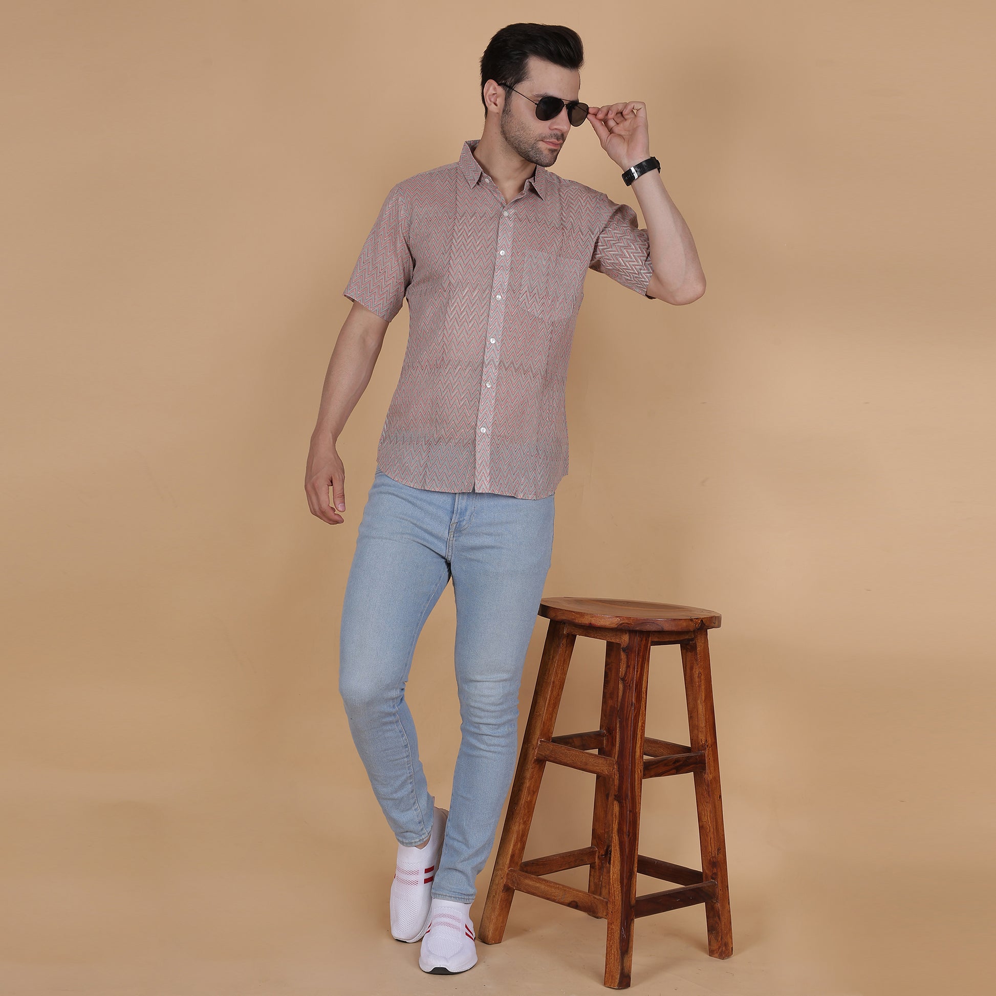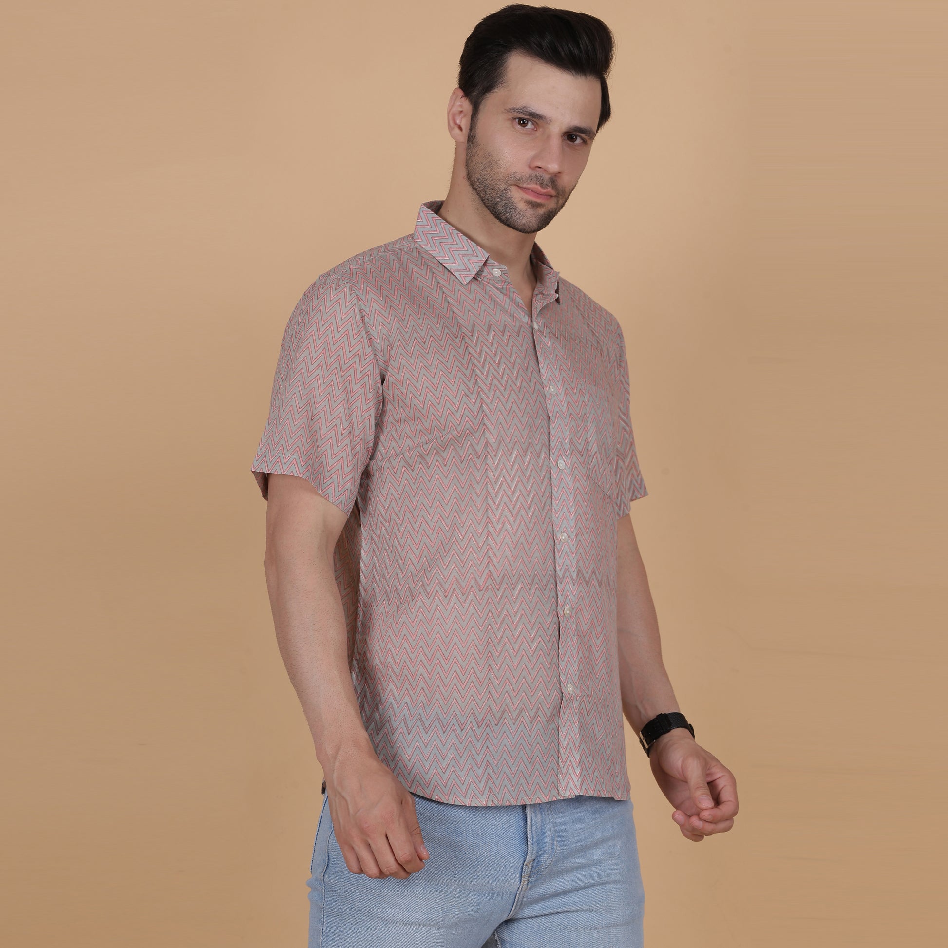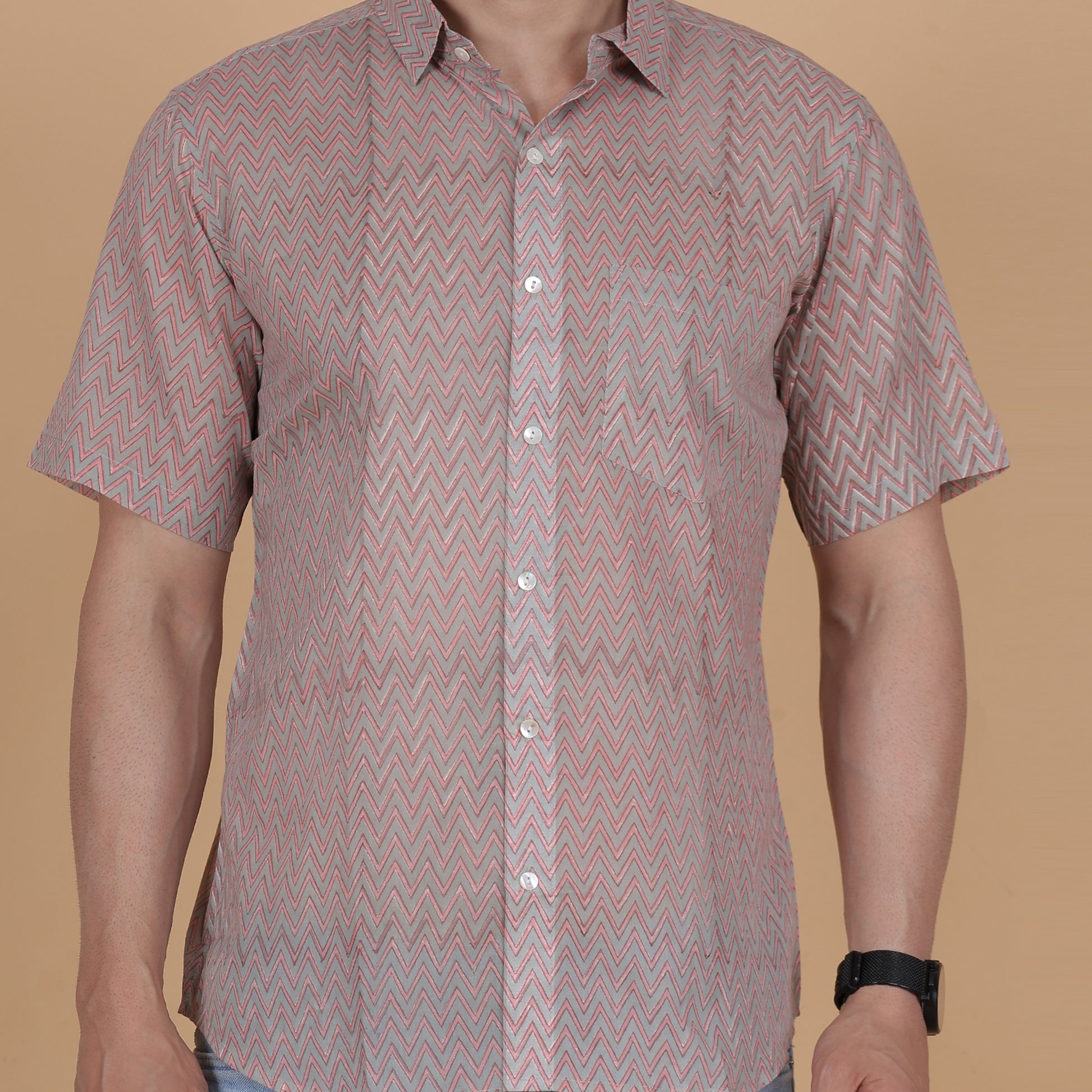 Stand out with this Men's Cotton Half-Sleeve Shirt, featuring a bold zigzag handblock print in soft pink and white. Handcrafted using traditional block printing techniques, this shirt merges heritage craftsmanship with modern design. Made from 100% breathable cotton, it ensures comfort and effortless style, perfect for casual outings, festive celebrations, or semi-formal occasions.