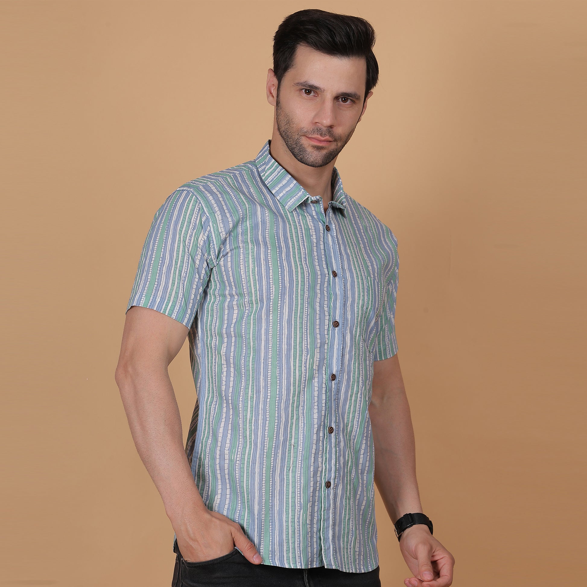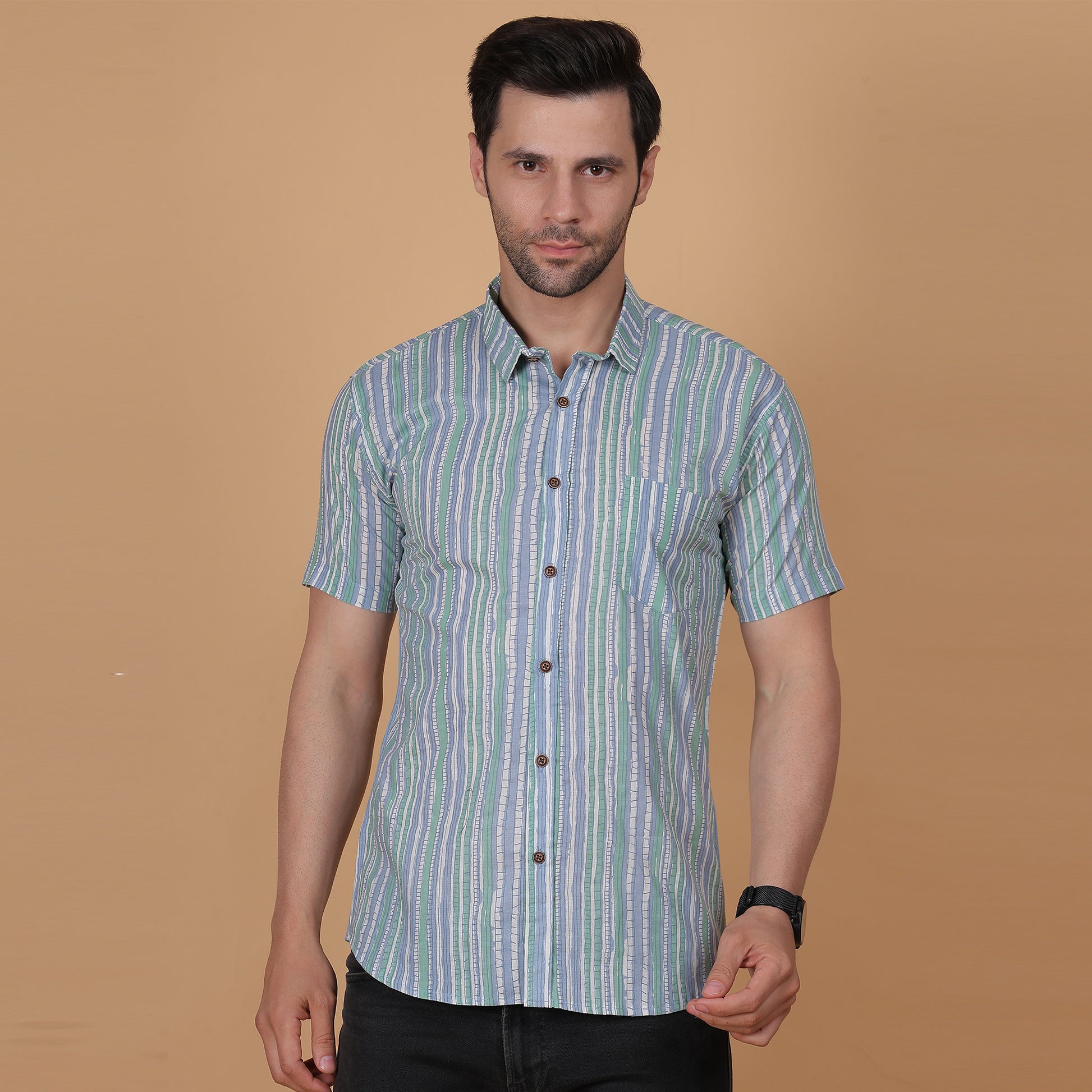Add a touch of casual sophistication to your wardrobe with this Men's Green & Grey Striped Cotton Half-Sleeve Shirt. Featuring soft green and grey tones in a modern striped pattern, this shirt offers effortless style for any occasion. Made from 100% breathable cotton, it ensures all-day comfort and is perfect for sunny days, casual outings, or a relaxed office look. Pair it with trousers or shorts for a versatile, stylish outfit.