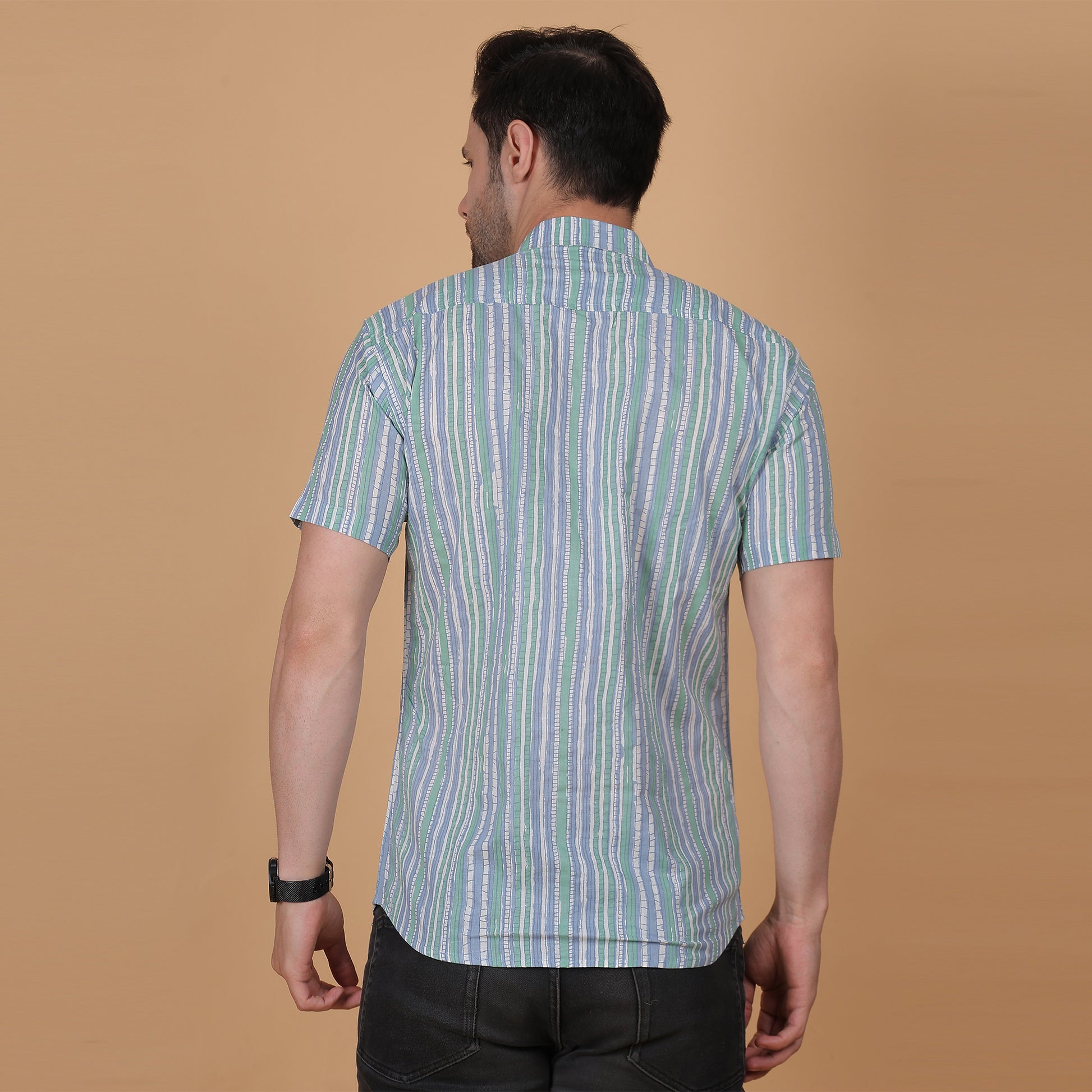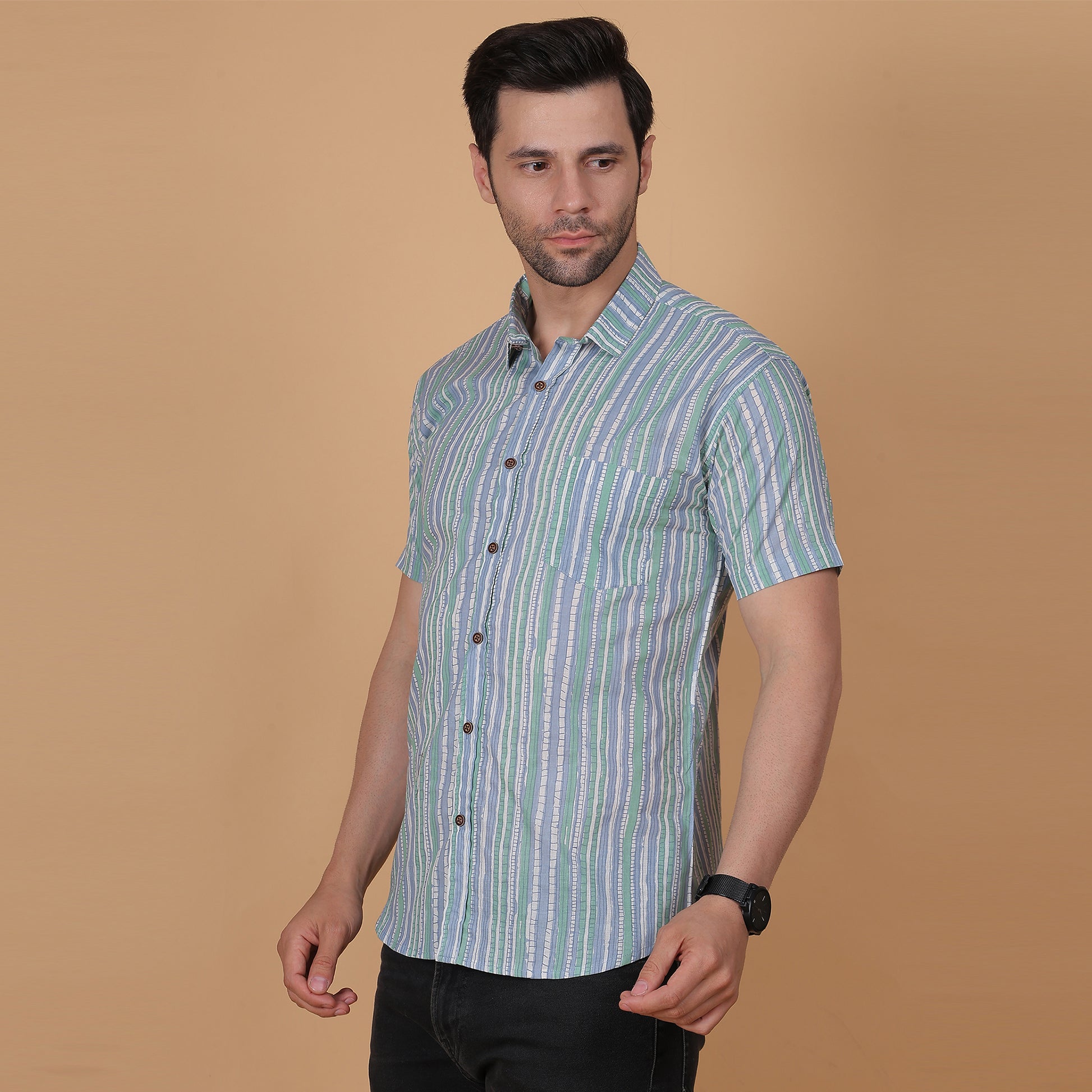 Men's Green & Grey Striped Cotton Half-Sleeve Shirt