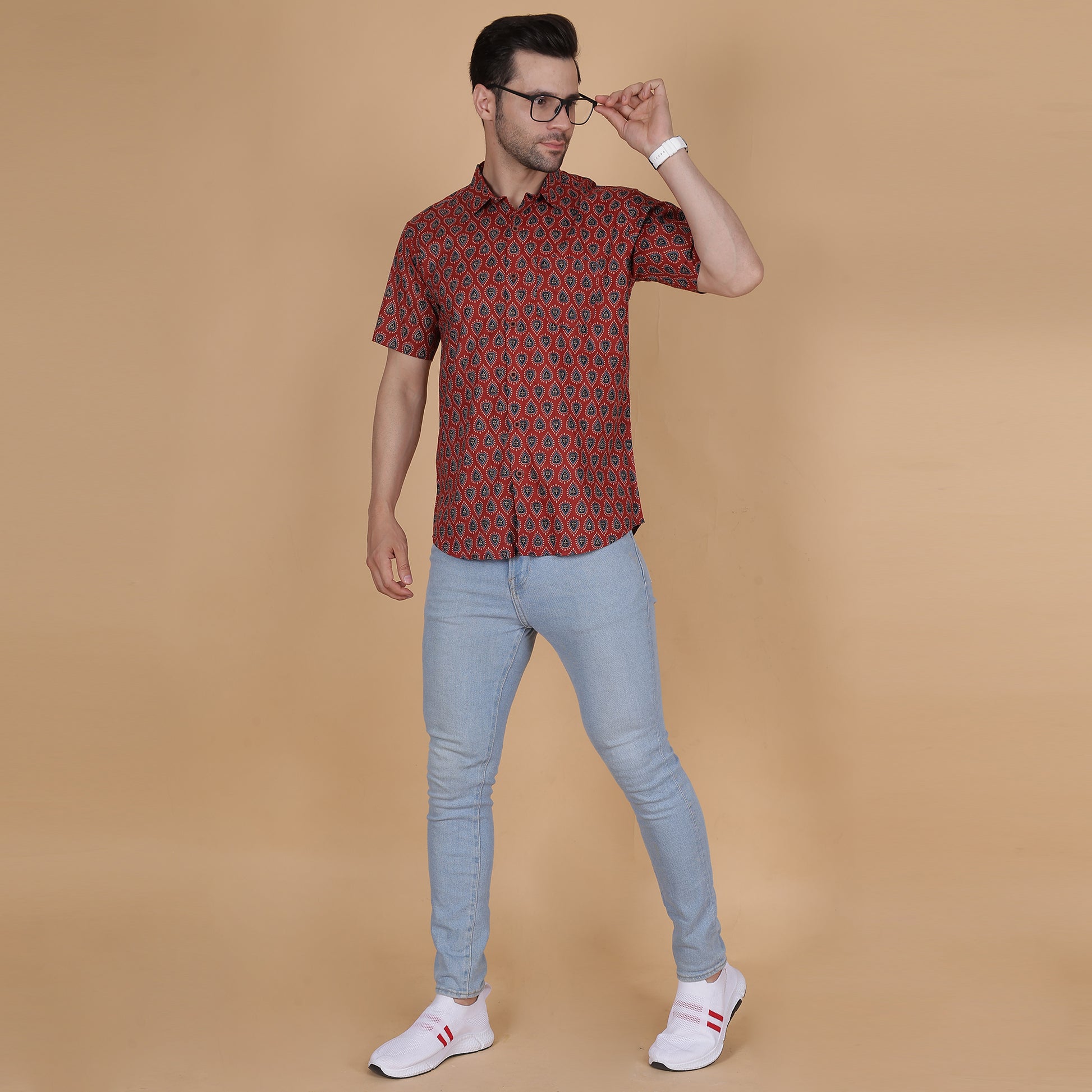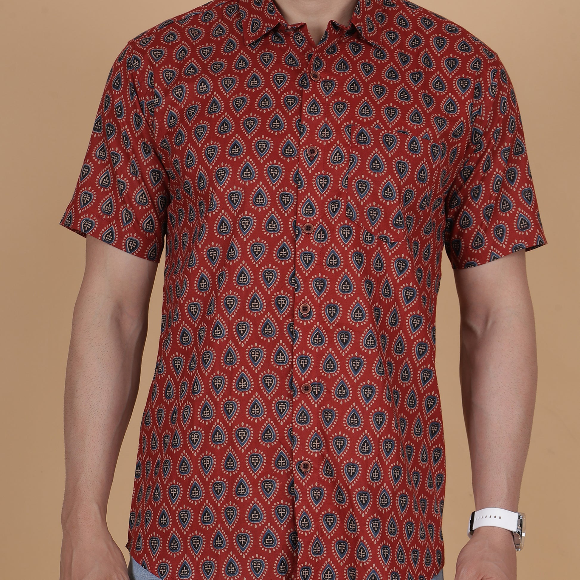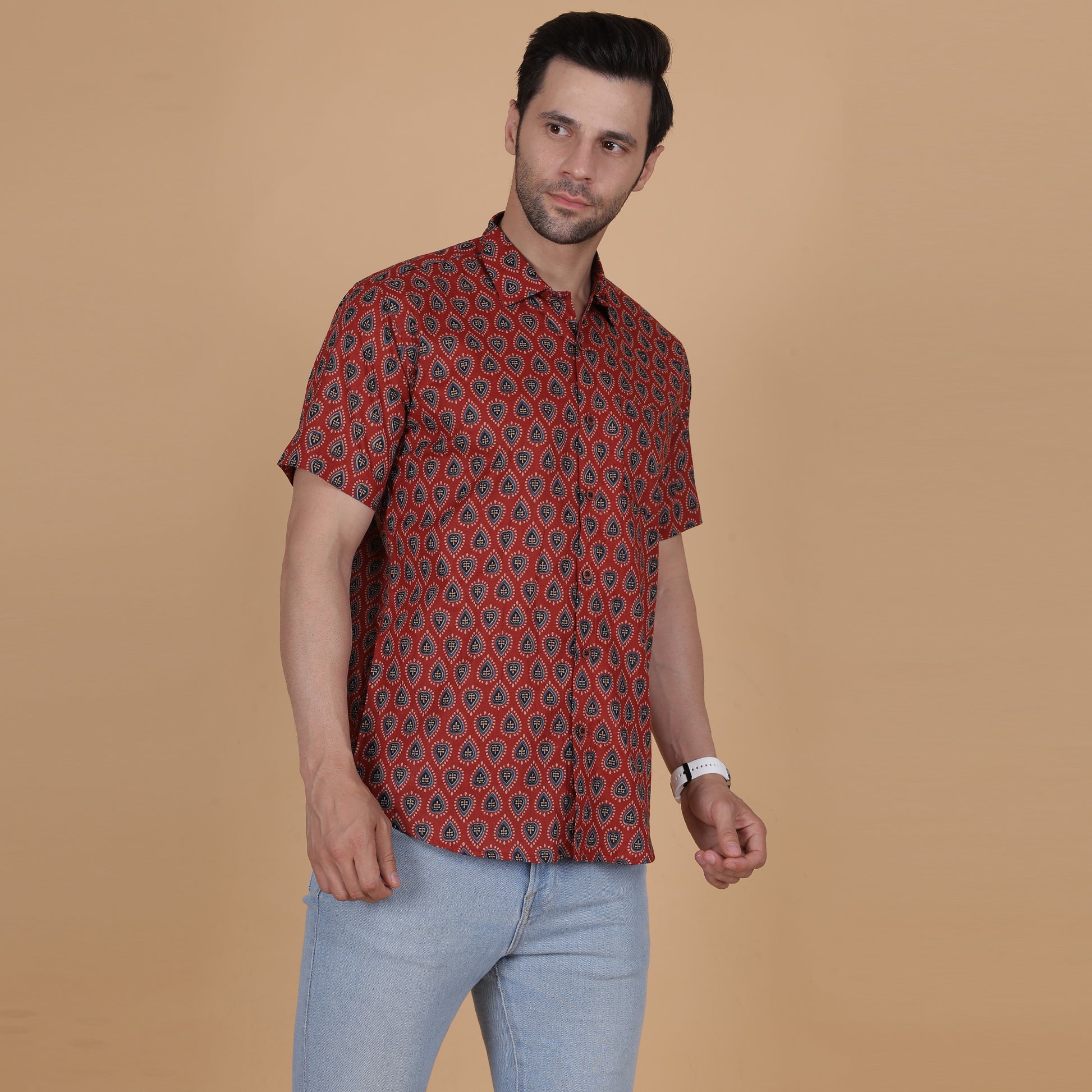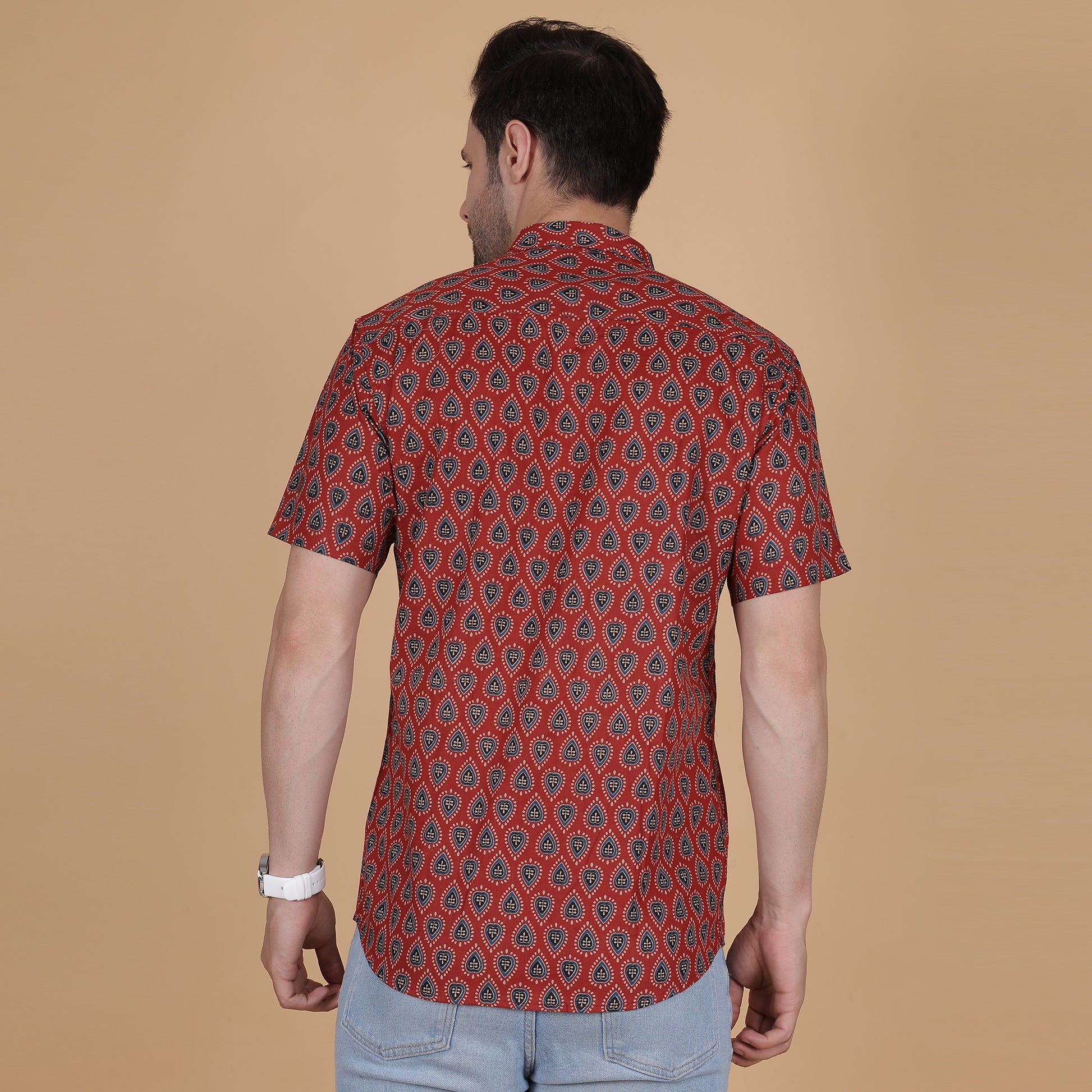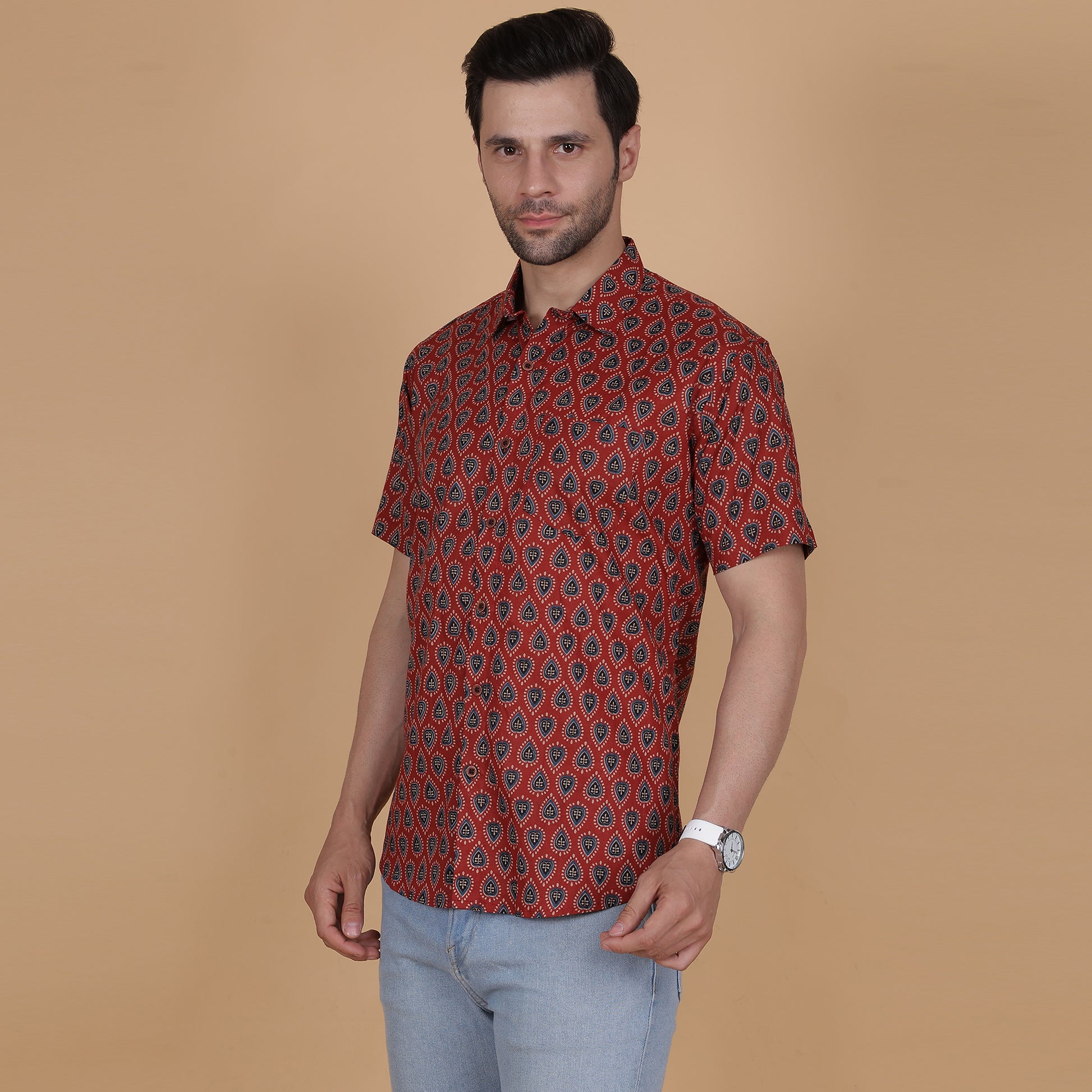 Add a vibrant and unique touch to your wardrobe with this Men's Maroon Cotton Half-Sleeve Shirt, showcasing a bold teardrop motif. Crafted from 100% breathable cotton, this shirt combines rich colors with intricate patterns, ensuring comfort and standout style. Perfect for festive occasions, casual gatherings, or semi-formal events, this piece exudes sophistication and charm.