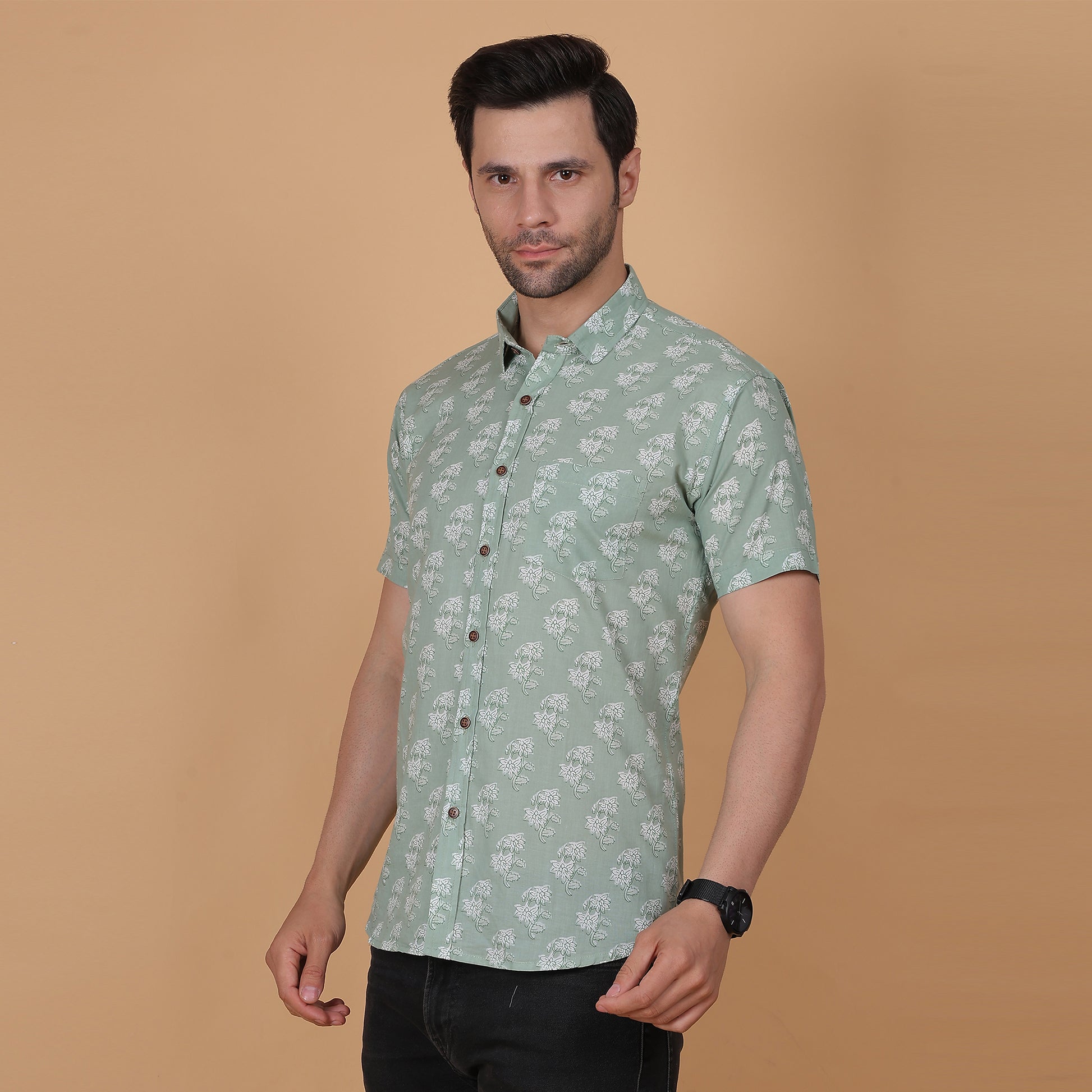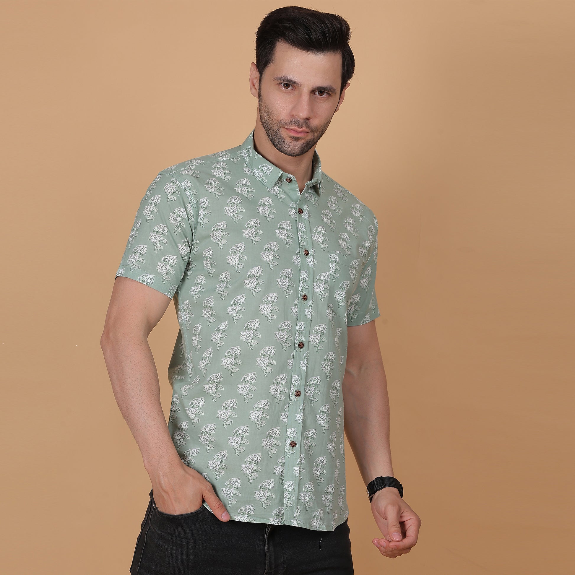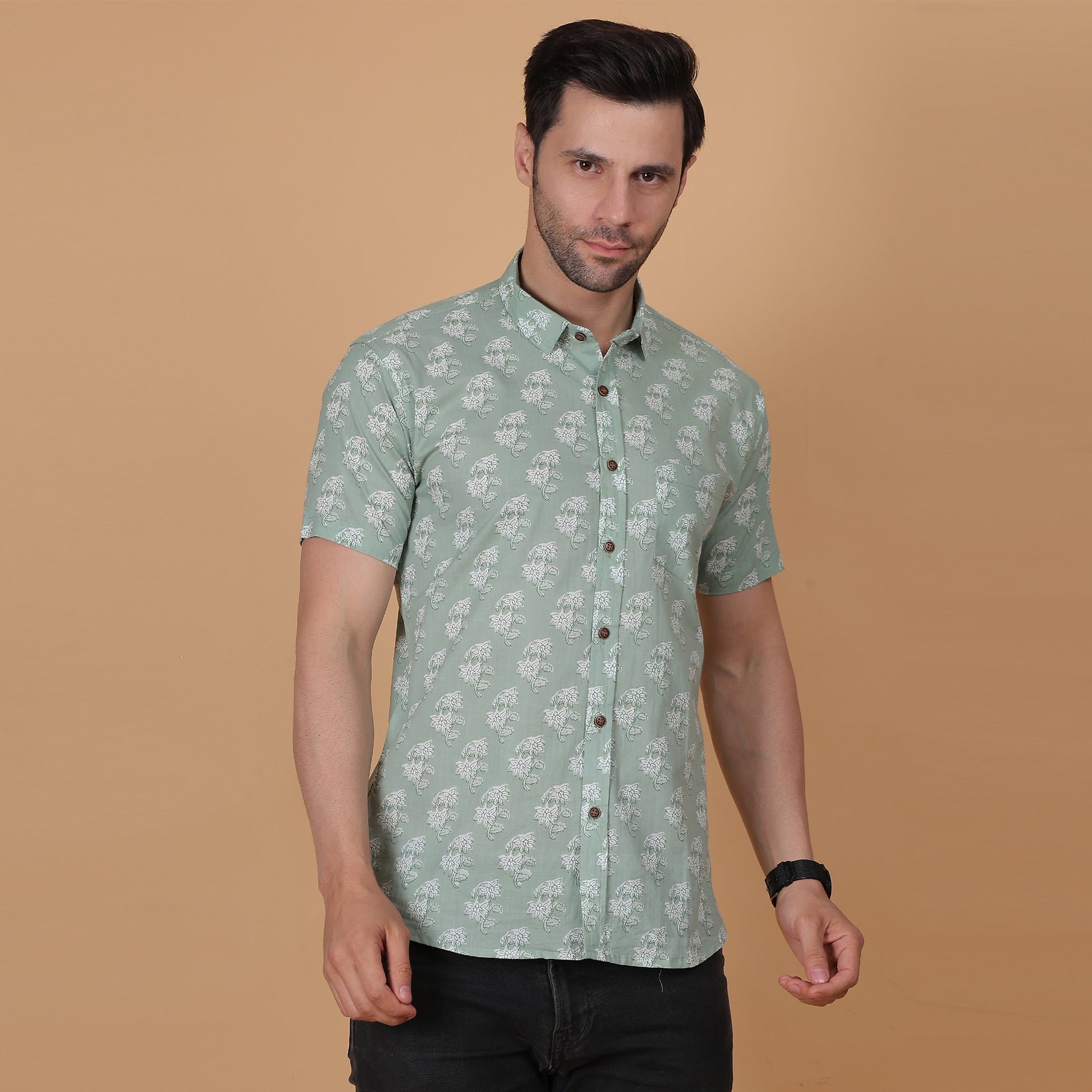 Men's Mint Green Cotton Half-Sleeve Shirt with Floral Print