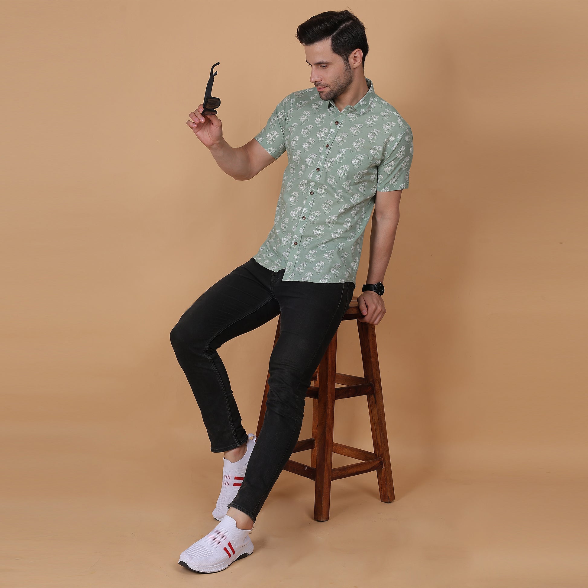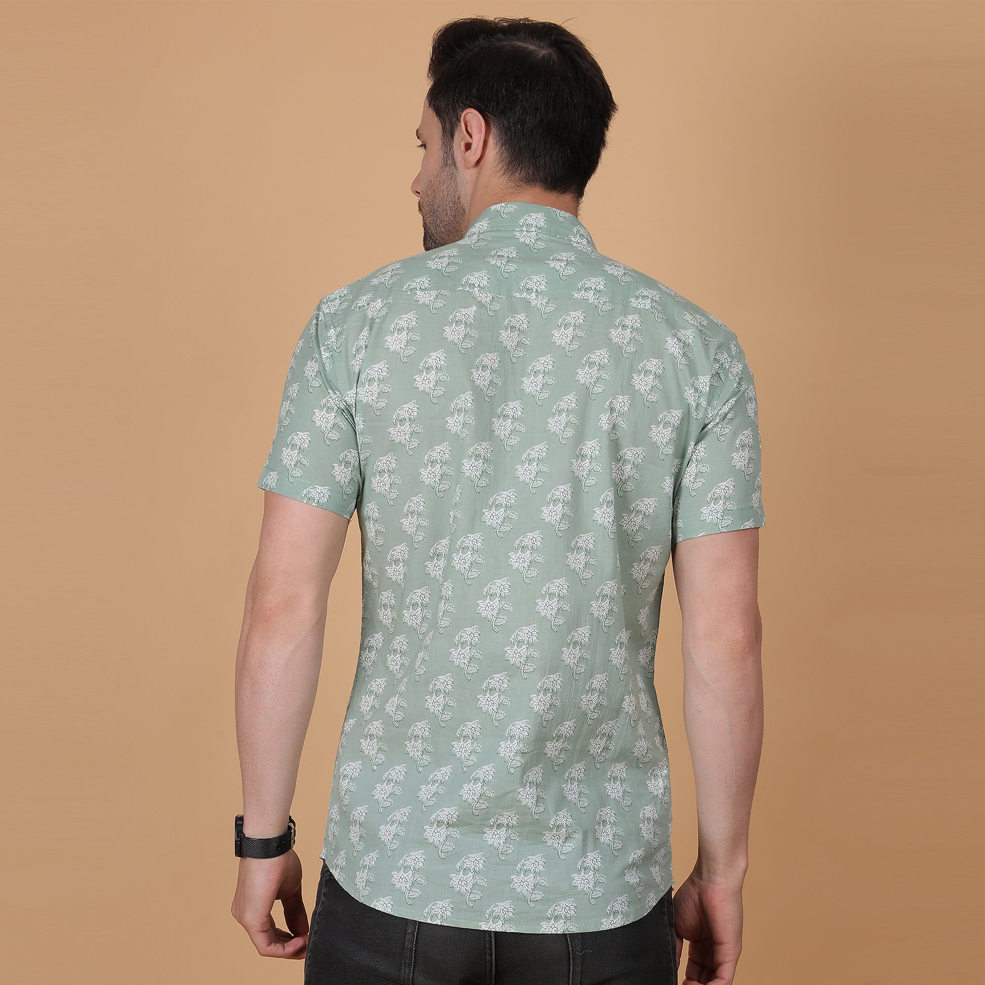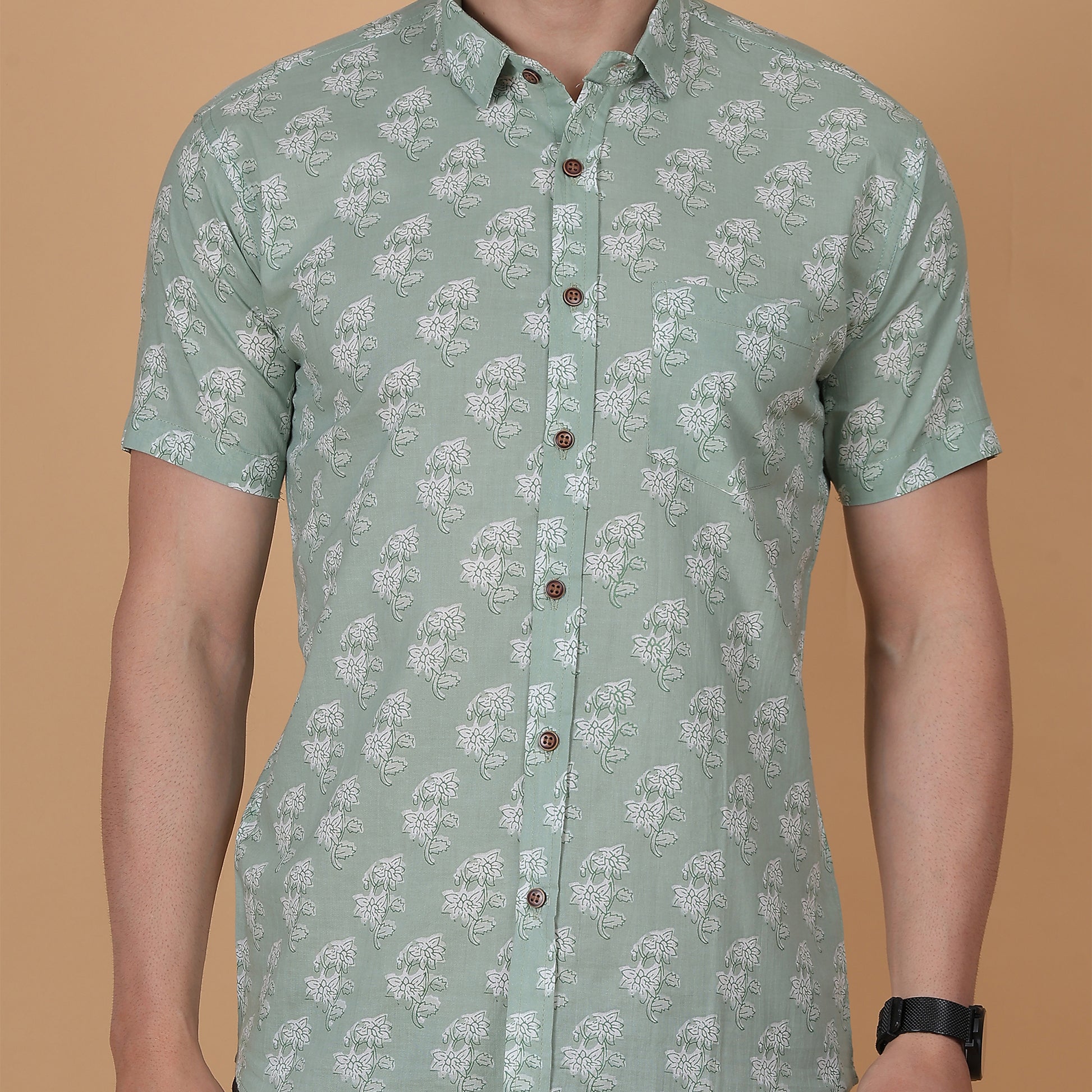 Men's Mint Green Cotton Half-Sleeve Shirt with Floral Print