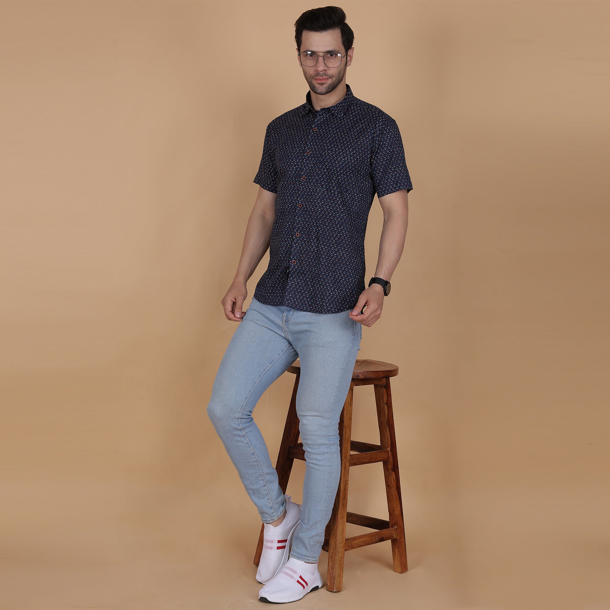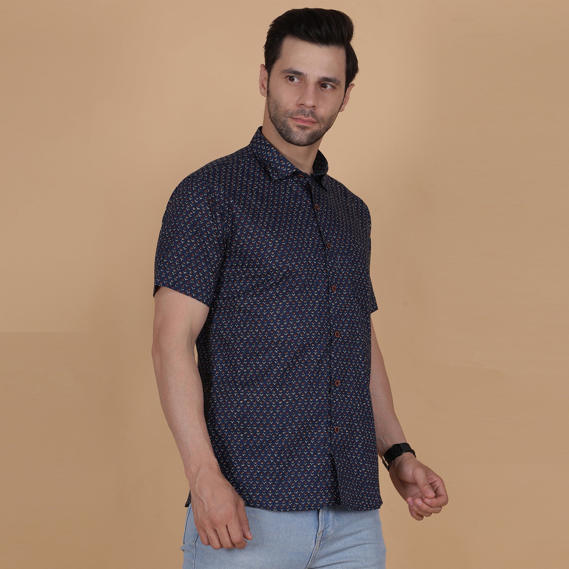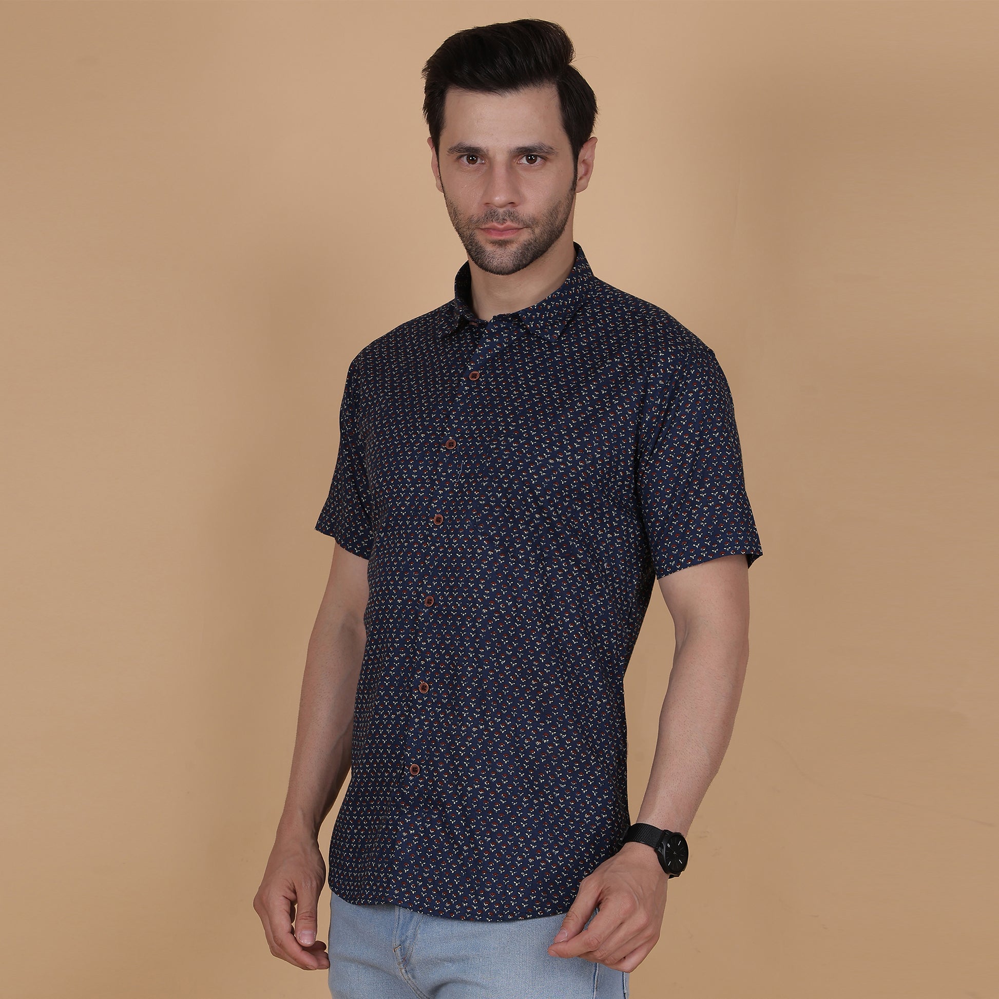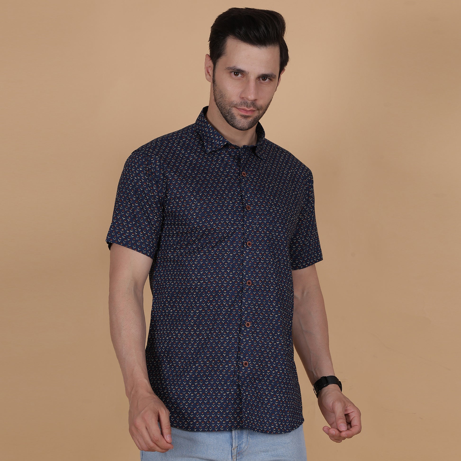Elevate your casual style with this Men's Navy Cotton Half-Sleeve Shirt, featuring a charming micro floral print in subtle tones. Made from 100% breathable cotton, this shirt combines comfort with a timeless aesthetic. Perfect for casual outings, relaxed office days, or festive occasions, this shirt is a versatile addition to any wardrobe.