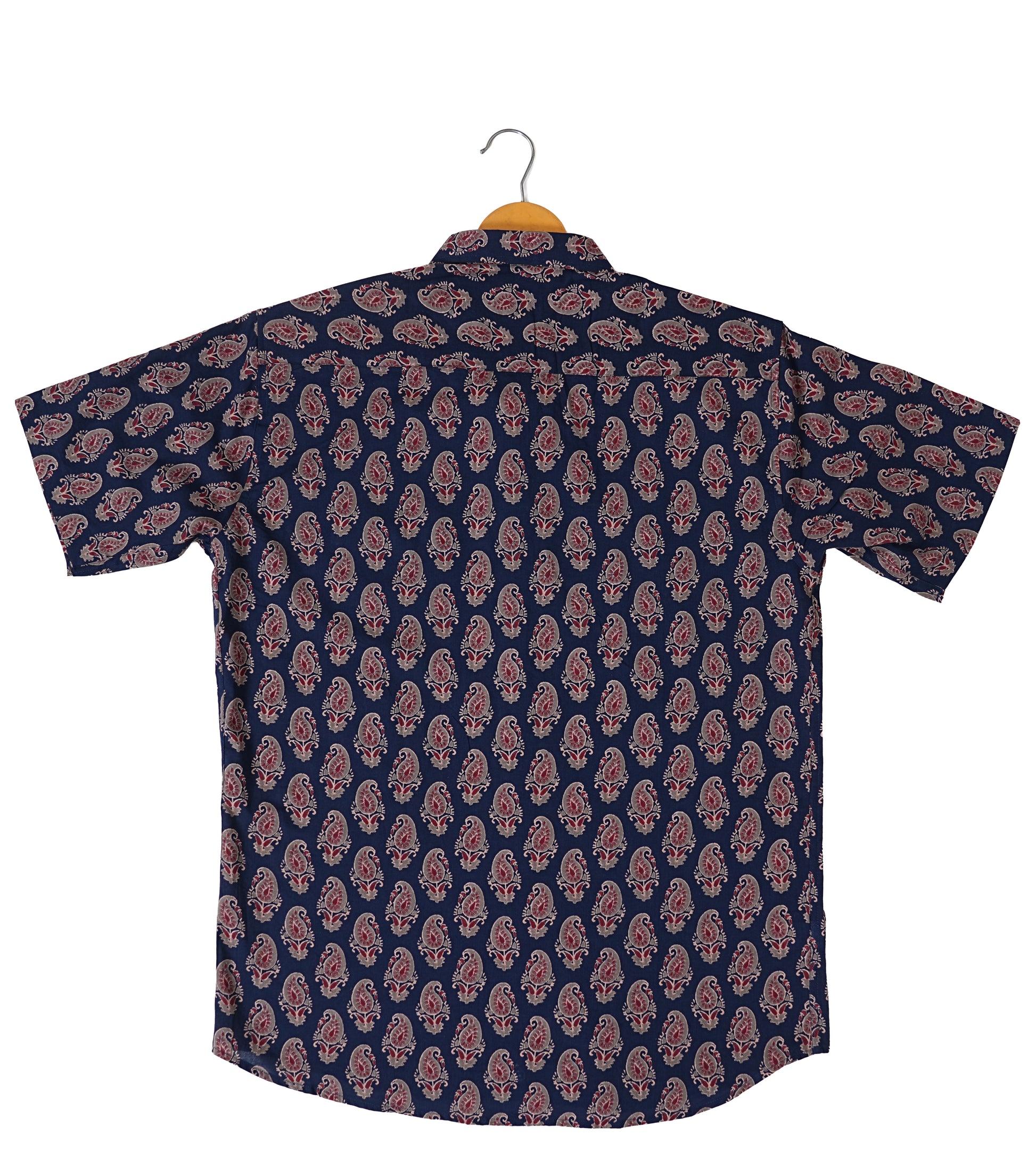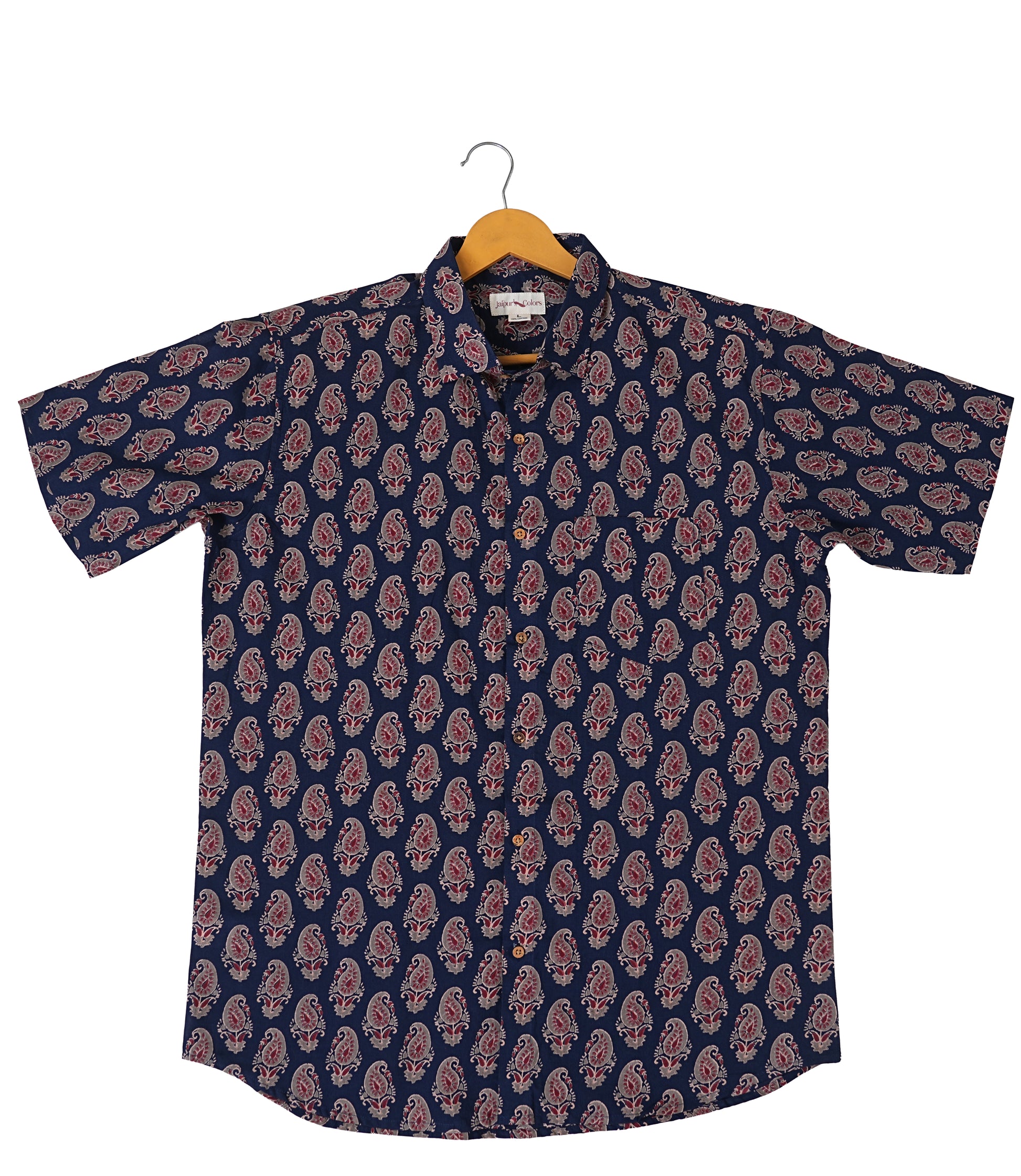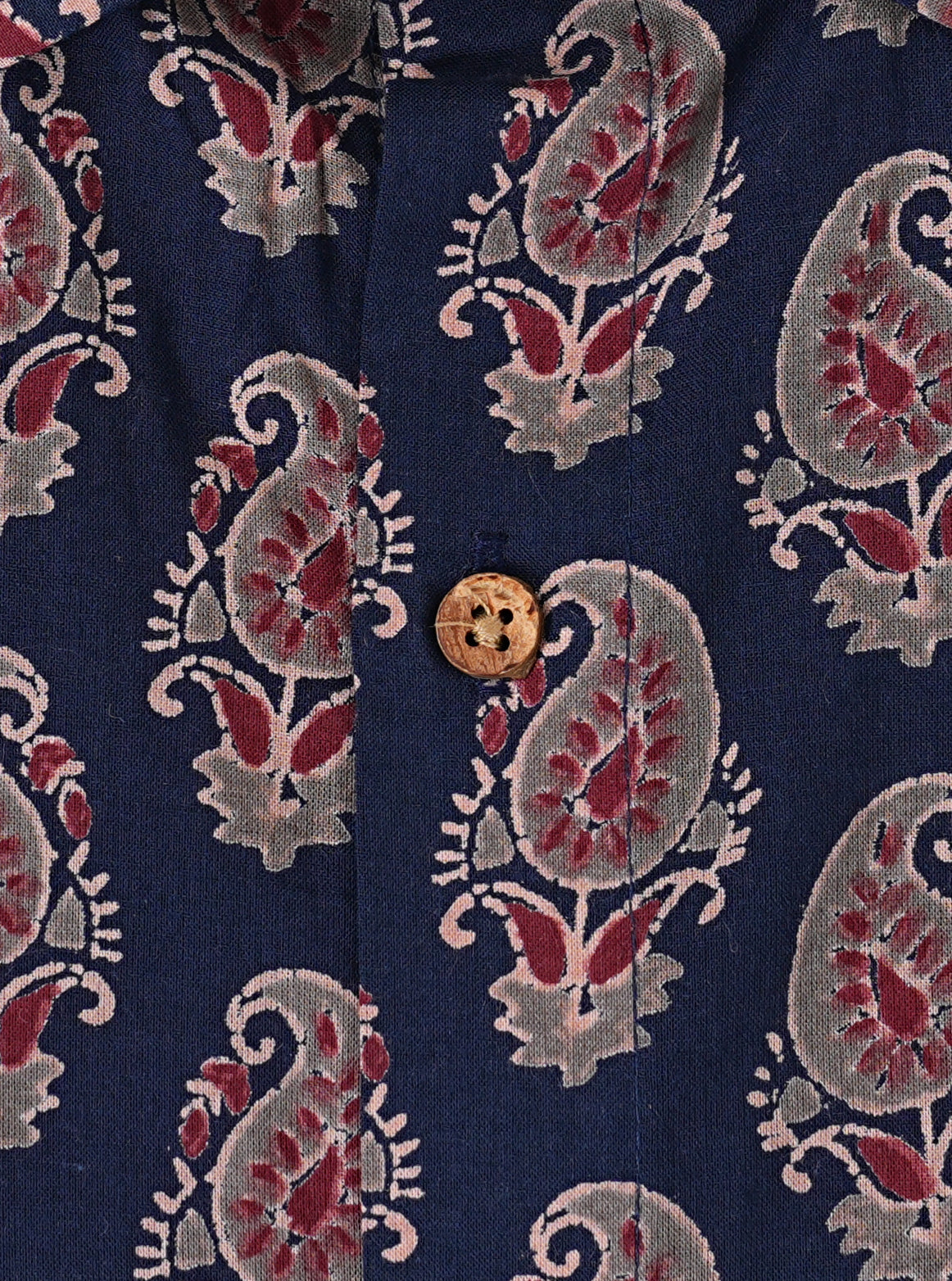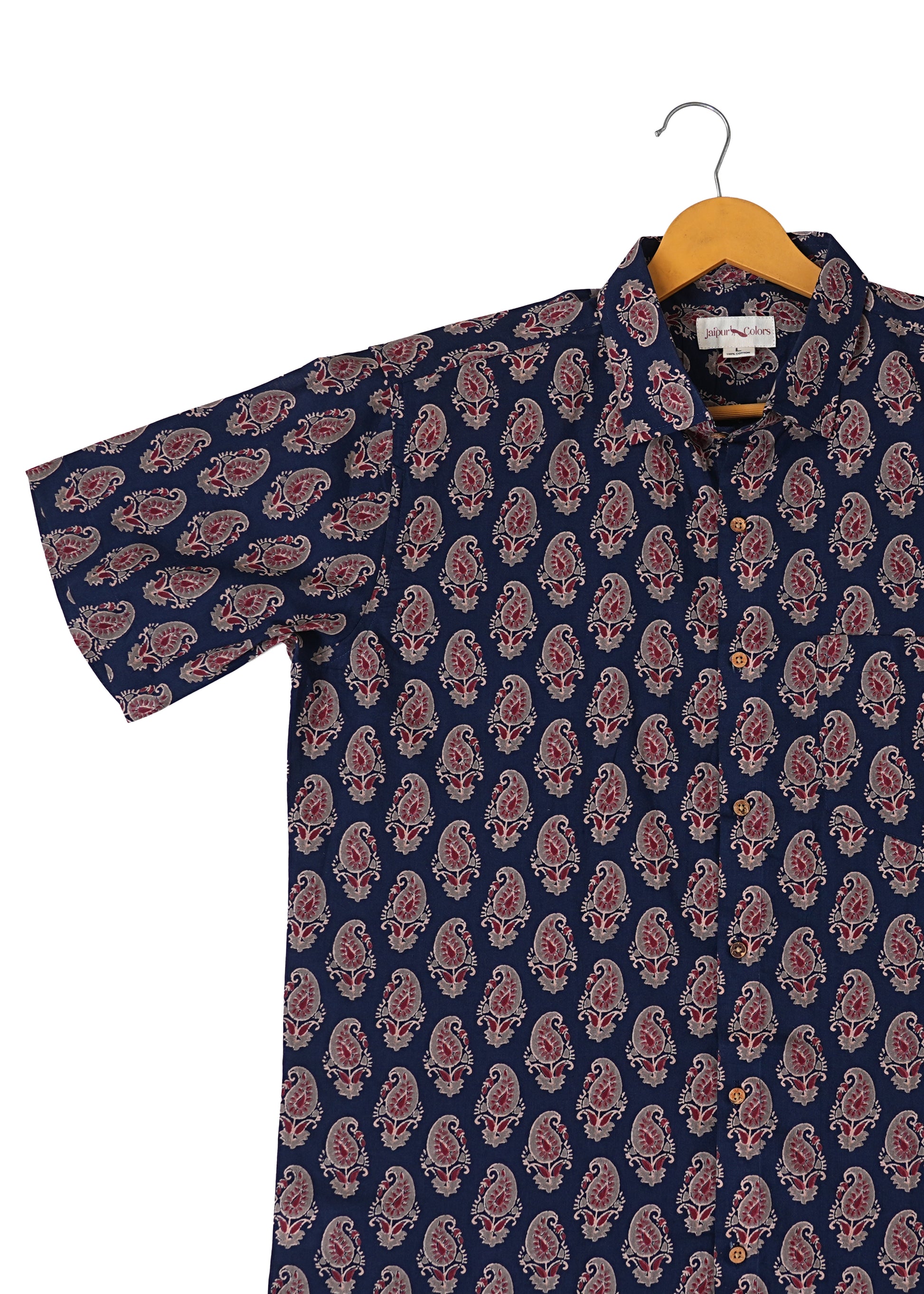 Crafted from 100% cotton, this navy blue shirt offers breathable comfort in a regular fit. Featuring a traditional Kairi Booti screen print, it comes with a spread collar, half sleeves, and a front button placket adorned with eco-friendly coconut shell buttons. Ethically made in India.