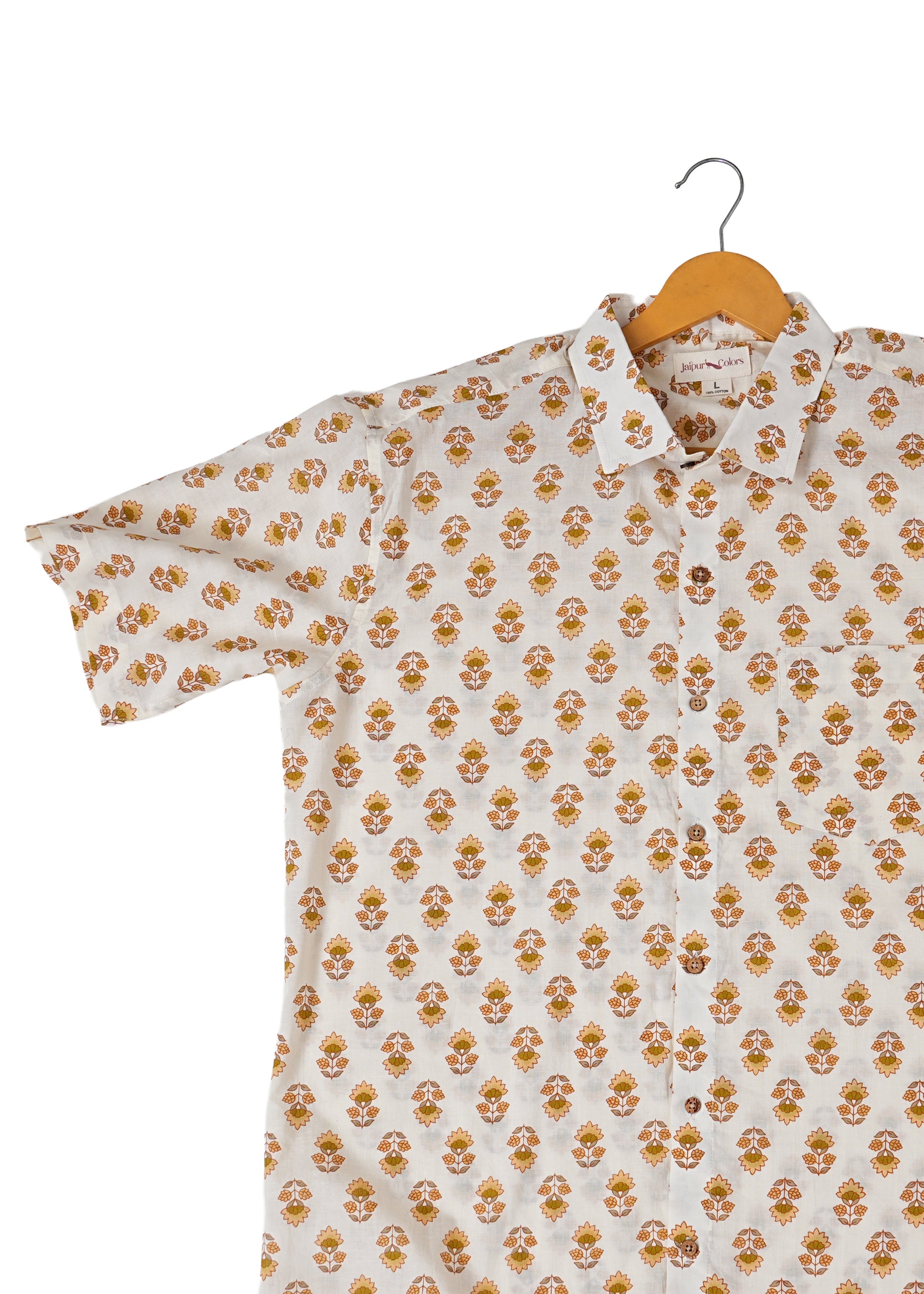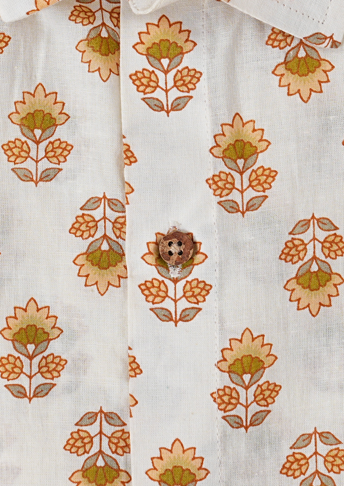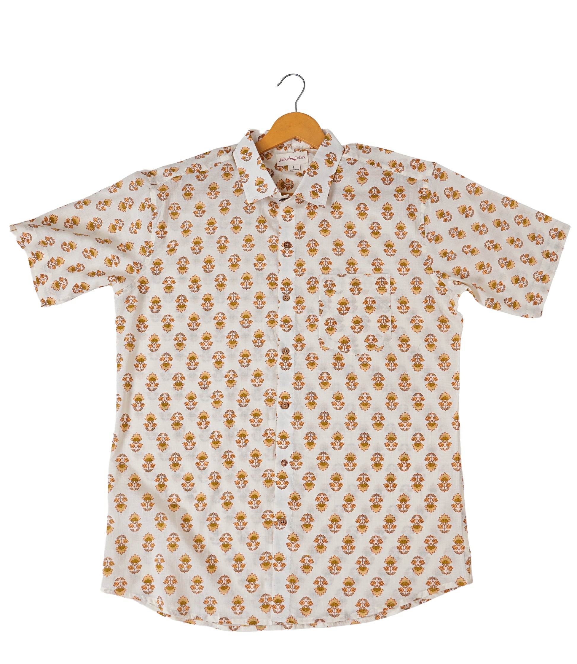 Made from 100% cotton, this regular fit shirt offers comfort with a breathable and soft fabric. Featuring a vibrant screen print of yellow flowers, it comes with a spread collar, half sleeves, and a front button placket with eco-friendly coconut shell buttons. Ethically made in India.
