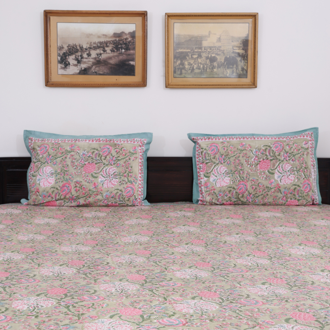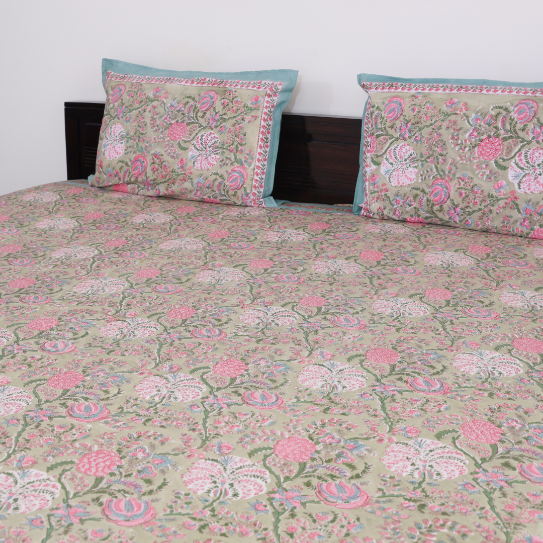 Add a touch of timeless elegance to your bedroom with this Pink Floral Handblock Printed Cotton Bedcover. Featuring intricate floral motifs in vibrant pink and green hues, this bedcover is a masterpiece of traditional handblock artistry. Crafted from premium-quality cotton, it ensures superior softness, durability, and comfort. The generous size (90 x 108 inches) and the matching pillow covers provide a cohesive and stylish look, making it the perfect choice for elevating your bedroom decor.