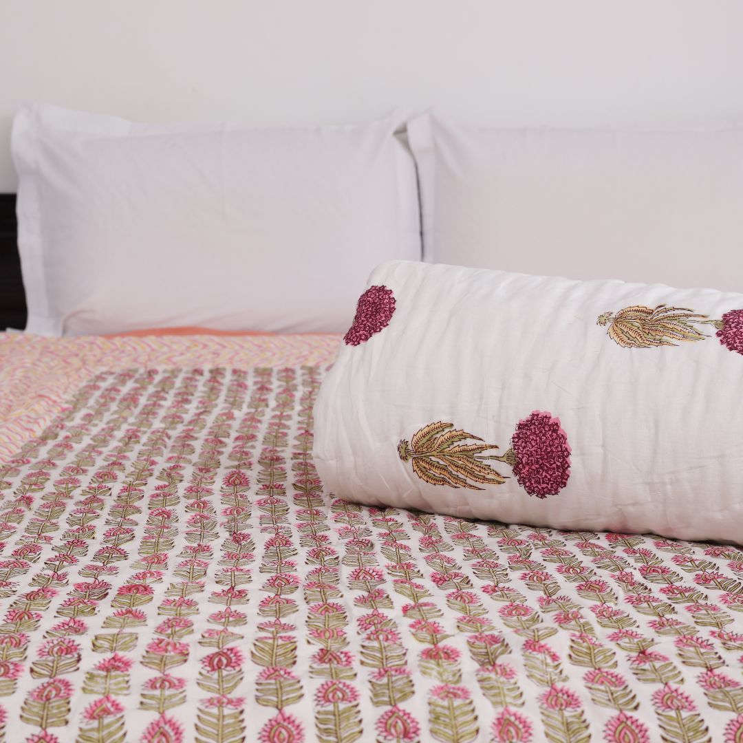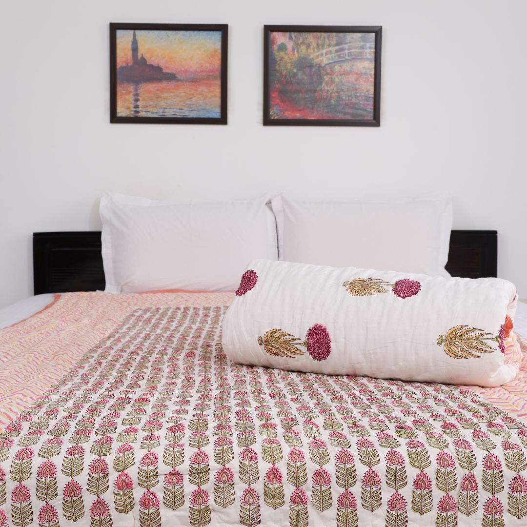 Add timeless elegance to your bedroom with the Pink Floral Handblock Reversible Quilt. Showcasing intricate handblock-printed floral motifs in vibrant pink and green tones, this quilt is crafted from premium cotton for a soft, breathable feel. The reversible design features two unique patterns, making it versatile for a fresh look every time. Perfect for adding warmth and charm, this quilt is a delightful blend of comfort and Jaipur's rich craftsmanship.