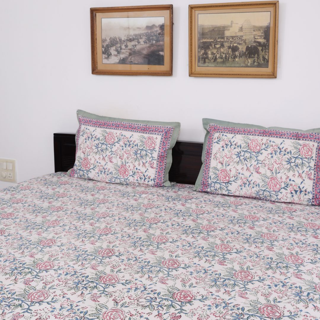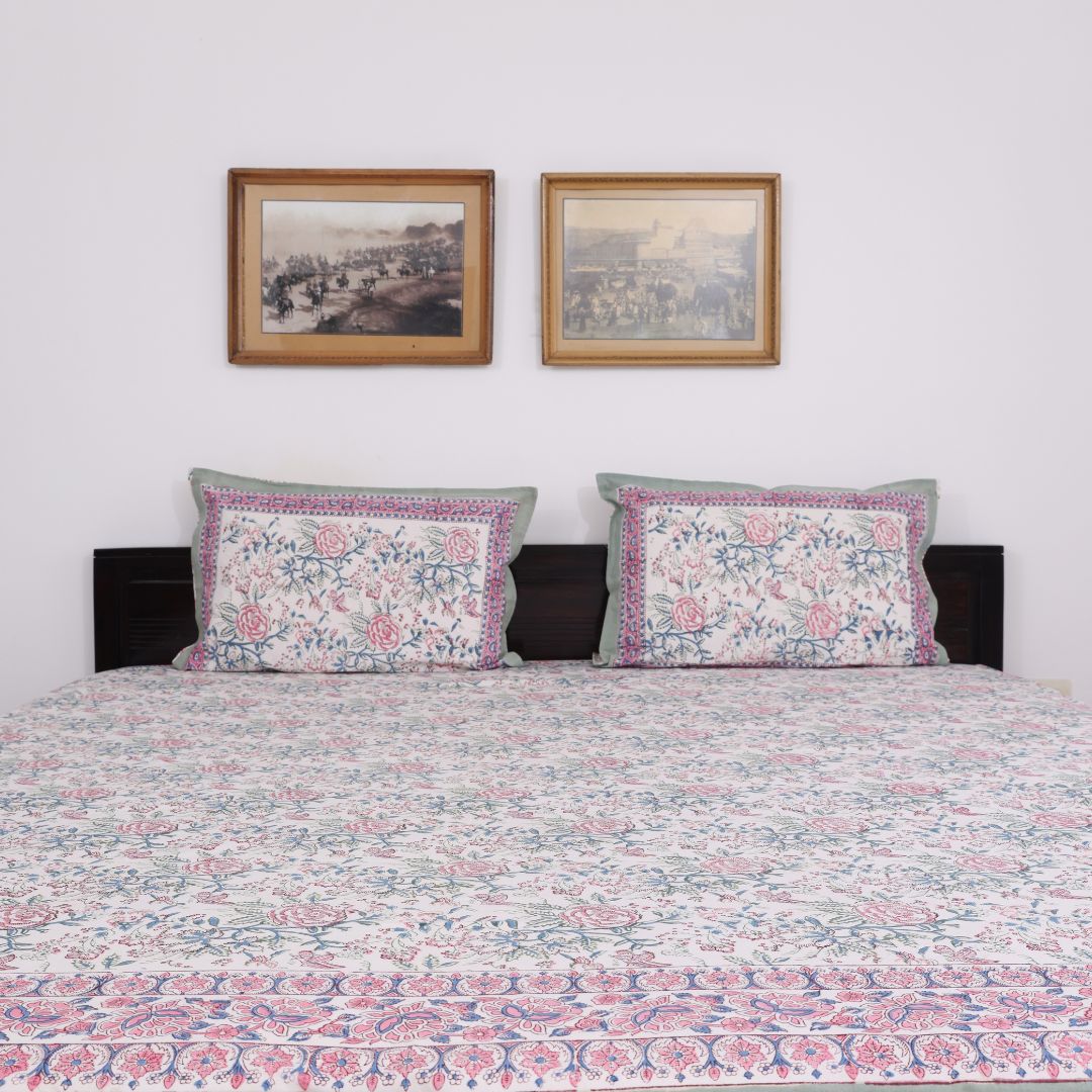 Adorn your bedroom with the delicate elegance of the Pink Floral Vine Handblock Cotton Bedcover. Featuring intricately handblock-printed floral vines in soft pink hues with green accents, this bedcover brings a soothing and elegant touch to your decor. Crafted from 100% pure cotton, it offers a lightweight, breathable, and durable option for everyday use. The large size (90 x 108 inches) and matching pillow covers ensure a cohesive and sophisticated look for your bedding ensemble.