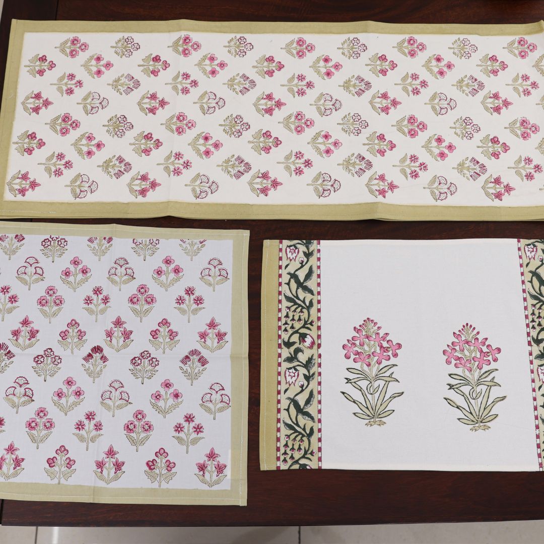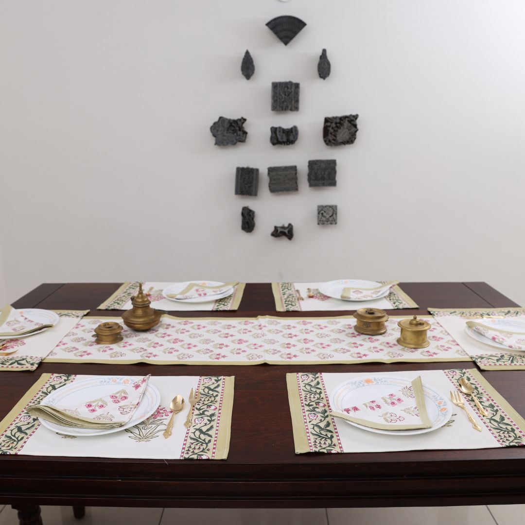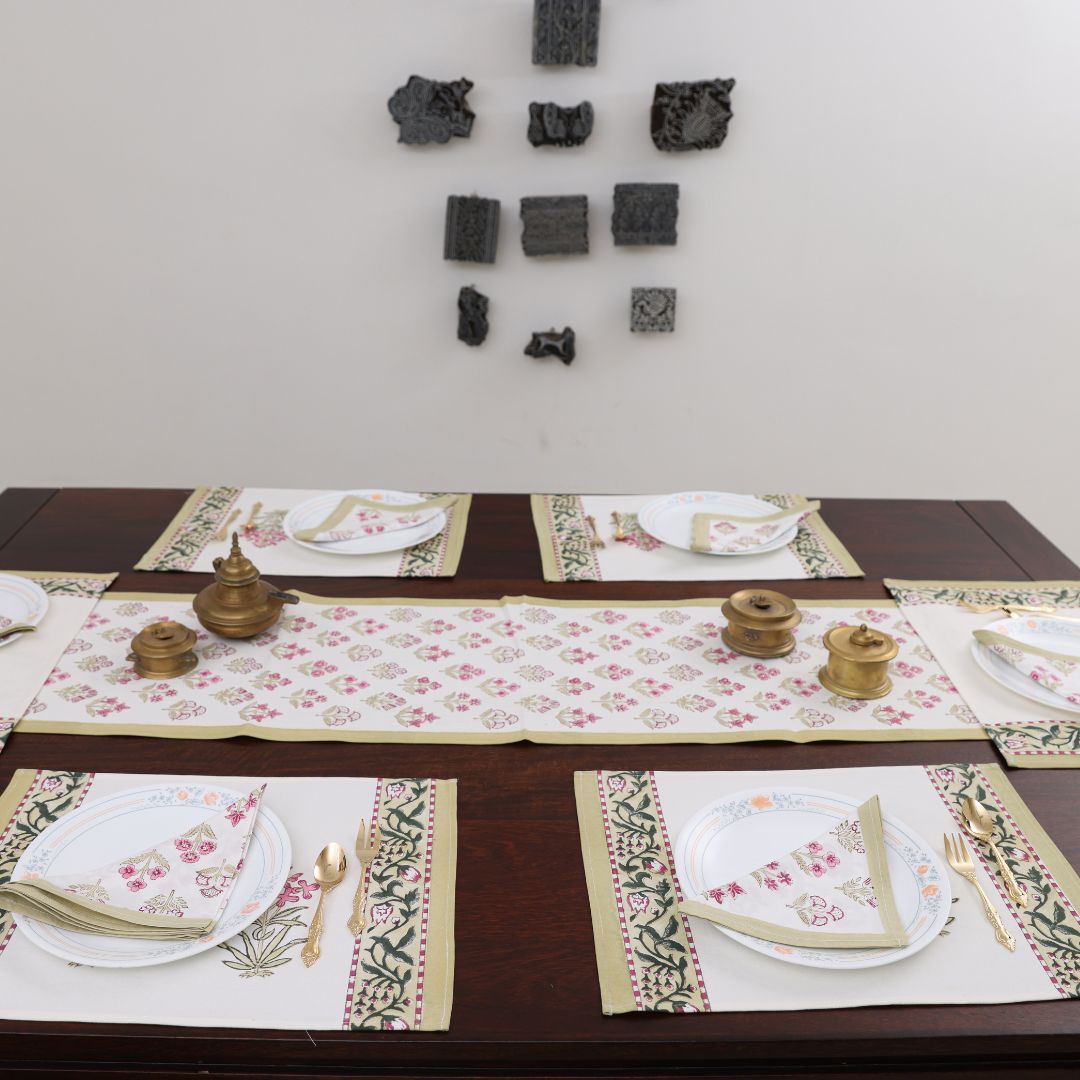 Enhance your dining table with the timeless elegance of the Pink Flower Handblock Dining Set. Featuring delicately handblock-printed floral patterns, this set includes table mats, napkins, and a runner, all crafted from 100% pure cotton canvas. The vibrant pink flower motifs celebrate Jaipur’s traditional craftsmanship, bringing sophistication and charm to any meal. Perfect for special occasions or everyday use, this set adds a touch of heritage to your dining space.