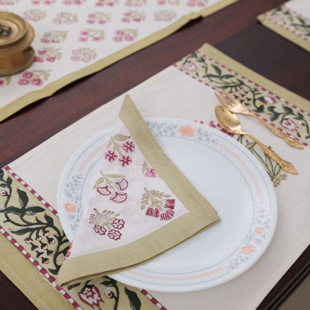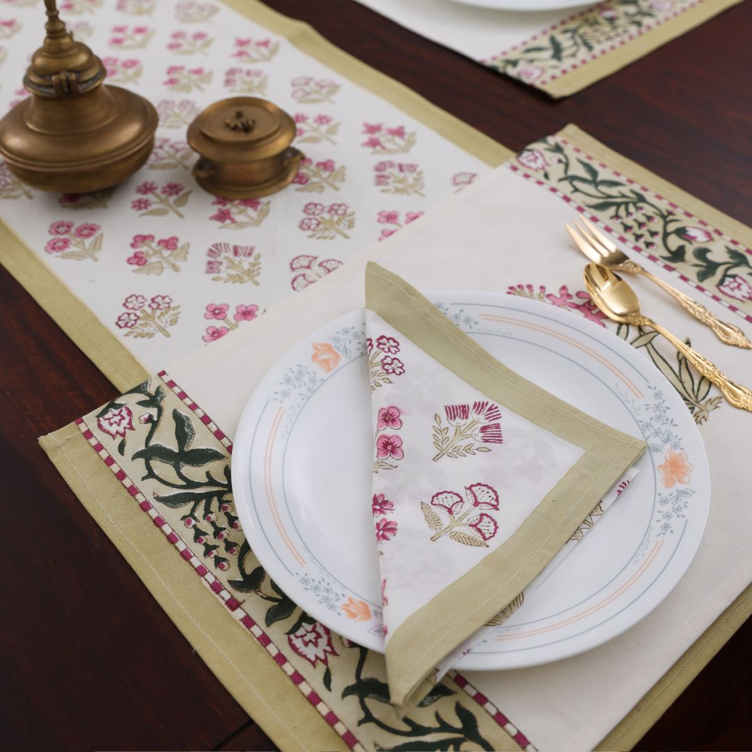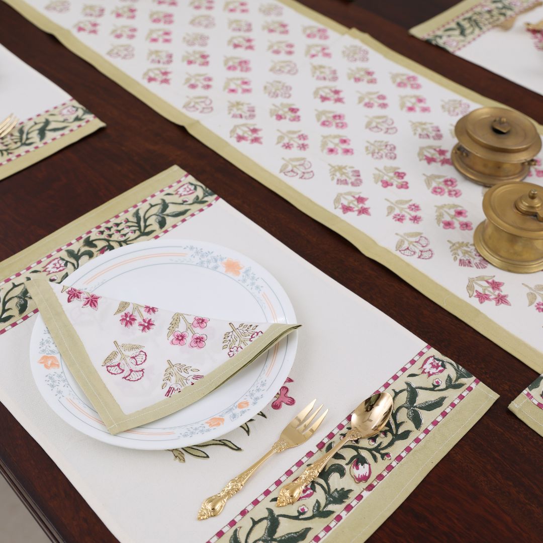 Enhance your dining table with the timeless elegance of the Pink Flower Handblock Dining Set. Featuring delicately handblock-printed floral patterns, this set includes table mats, napkins, and a runner, all crafted from 100% pure cotton canvas. The vibrant pink flower motifs celebrate Jaipur’s traditional craftsmanship, bringing sophistication and charm to any meal. Perfect for special occasions or everyday use, this set adds a touch of heritage to your dining space.