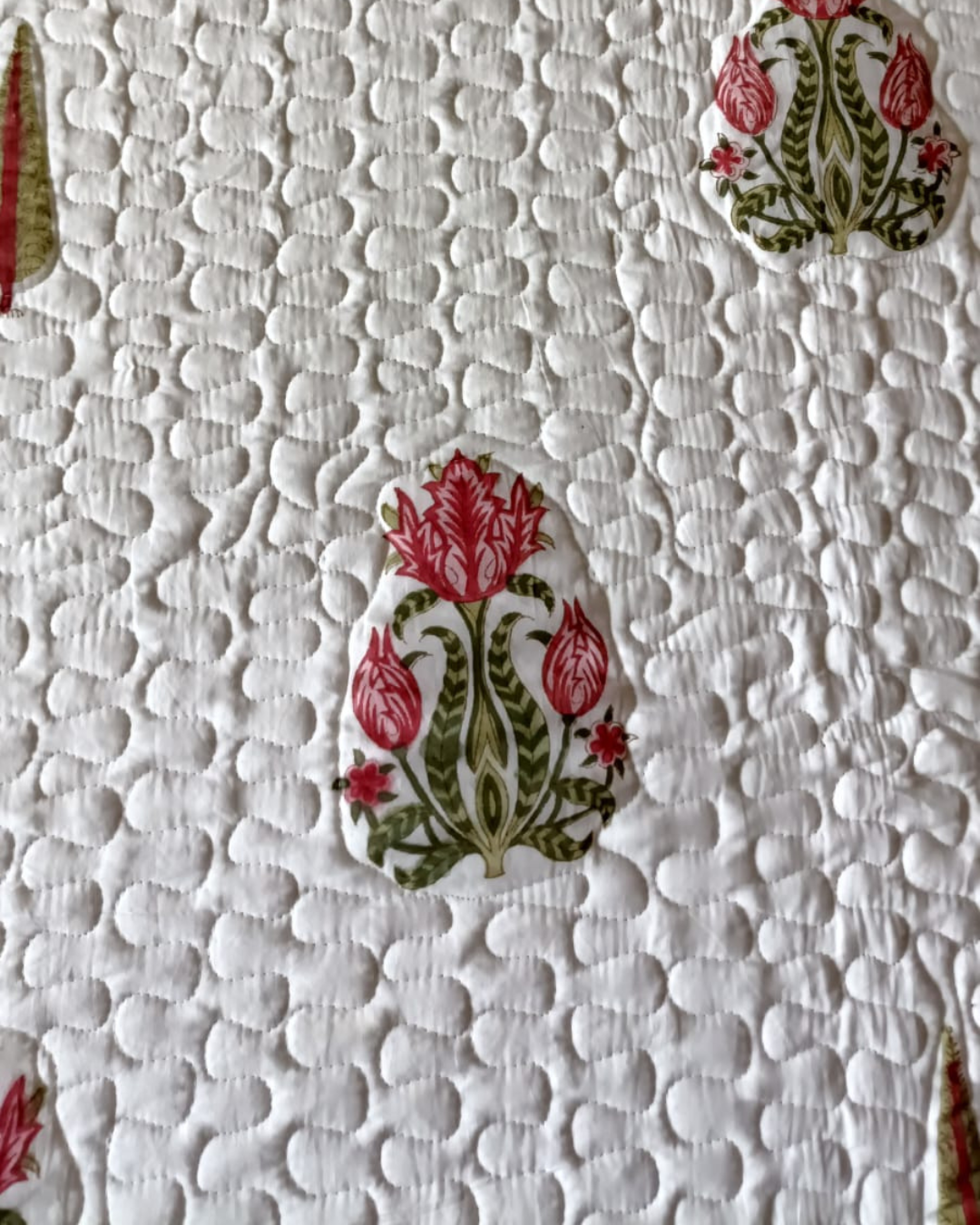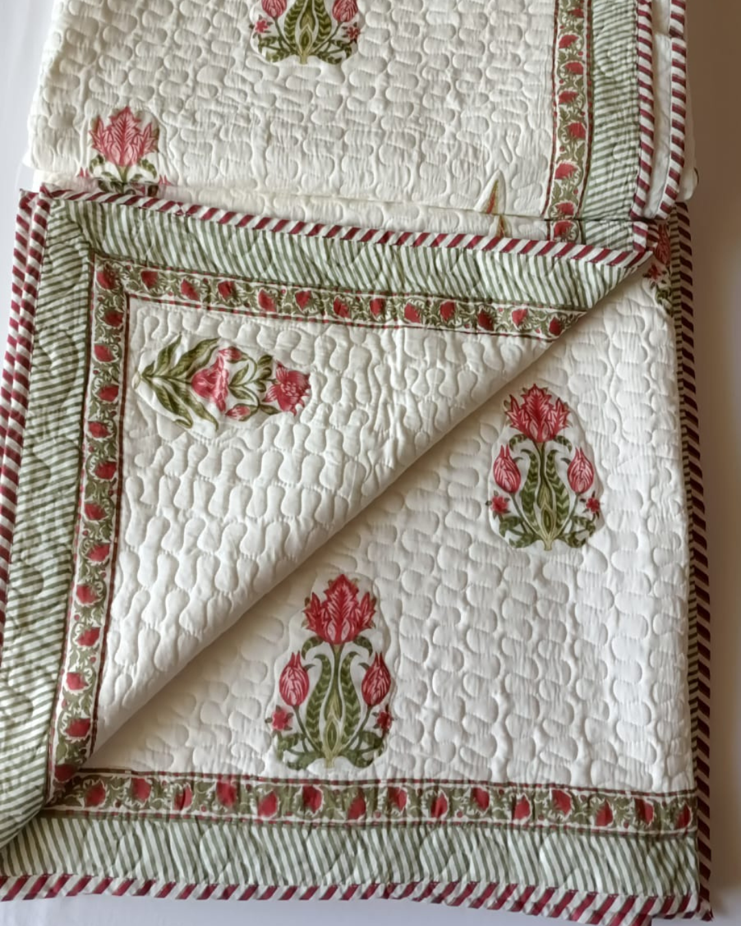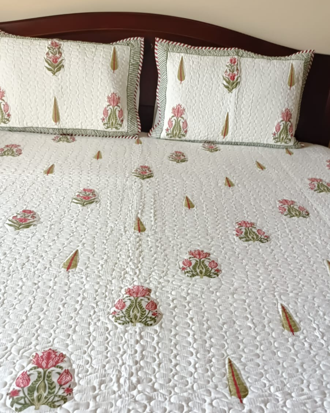 Pink Flower , Handblock Quilted Comforter Set with 2 Pillow Covers