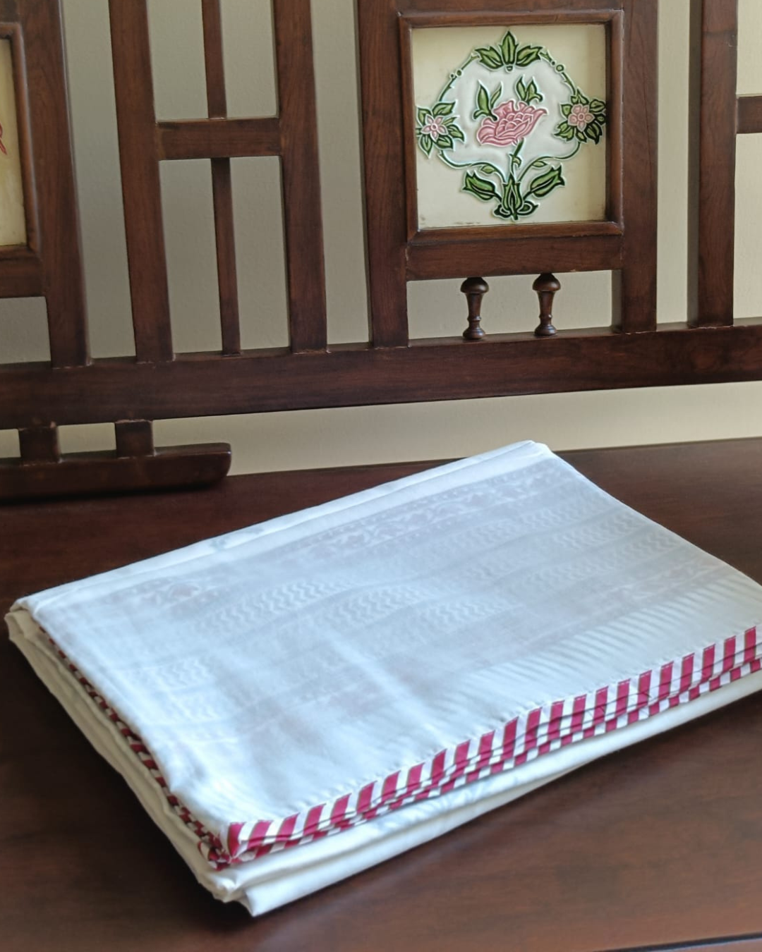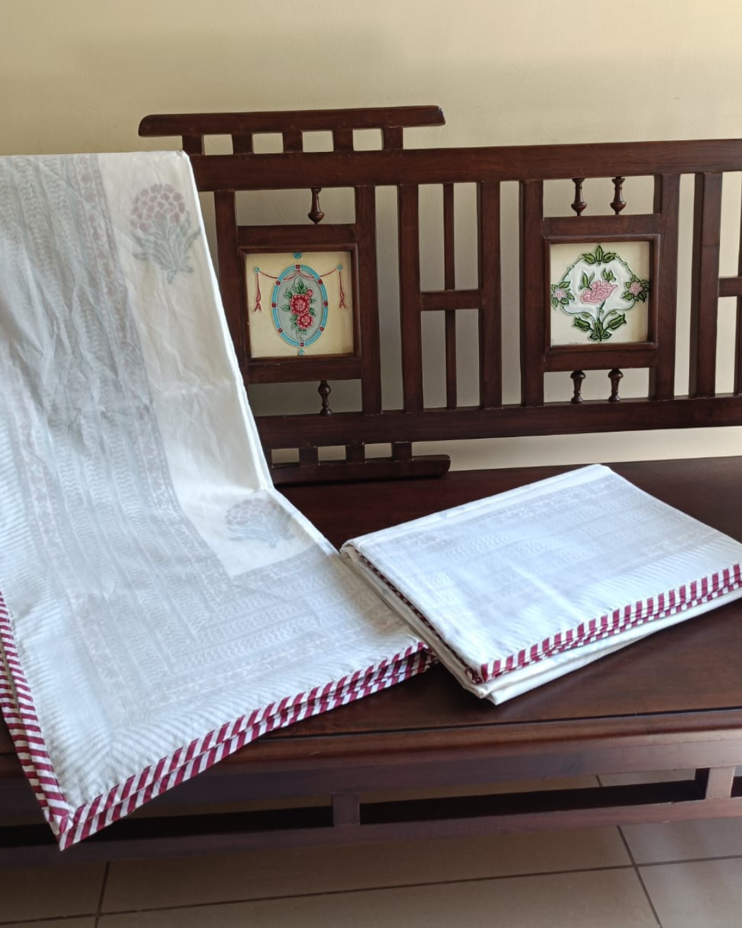 Finished with a striking red trim, this dohar adds a graceful pop of color to your bedding. A blend of subtle block print and bold detailing for those who like understated elegance.