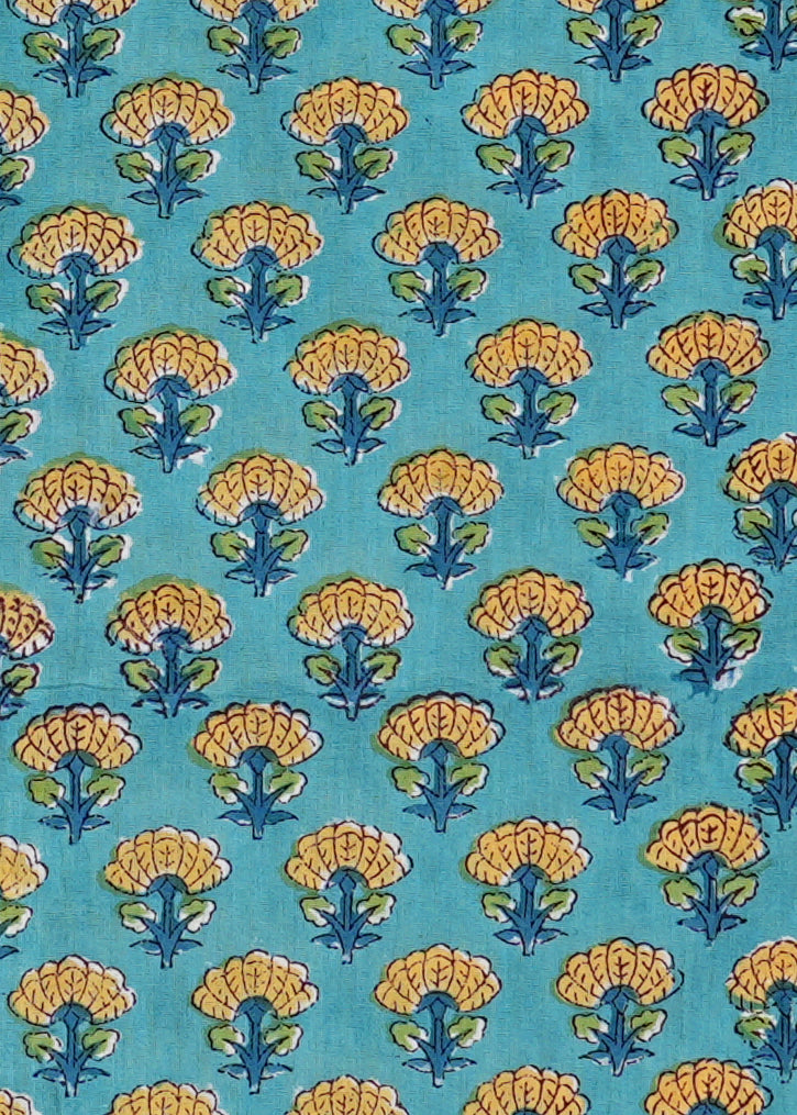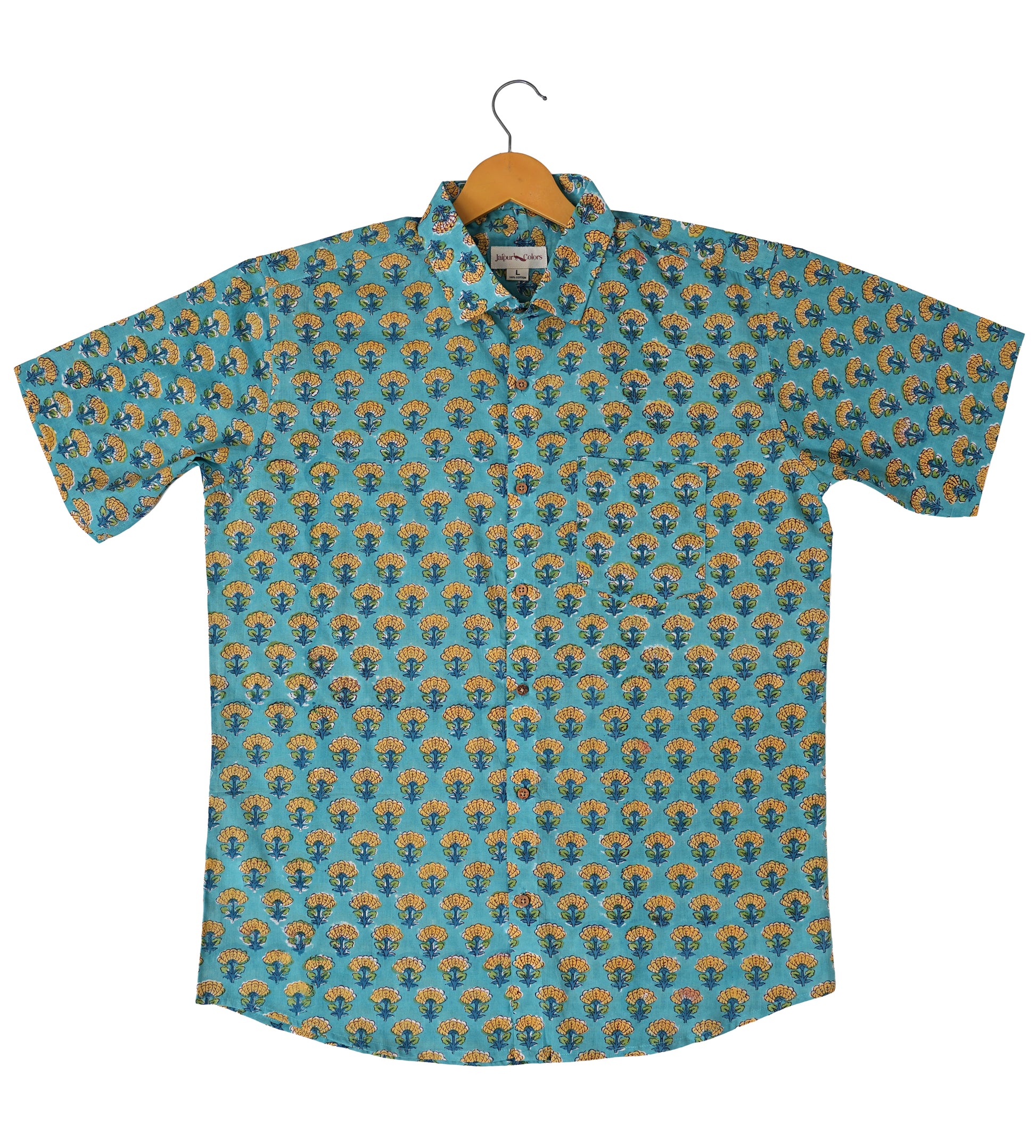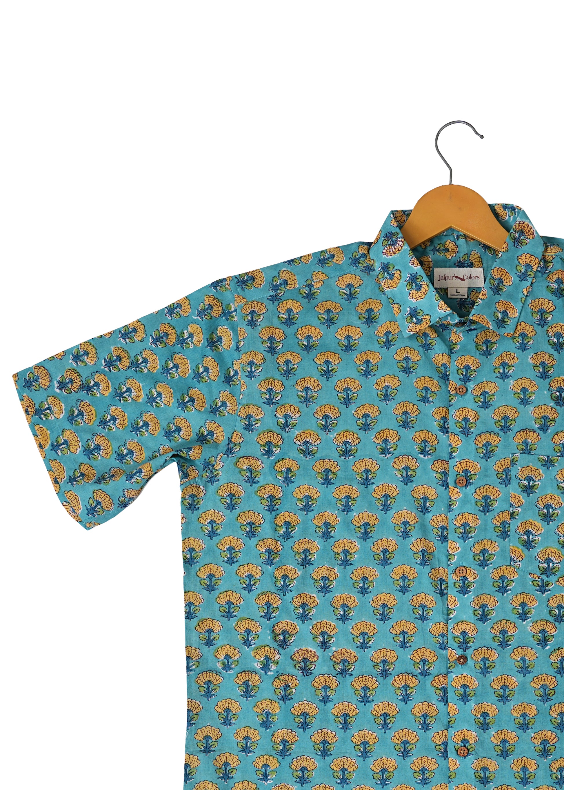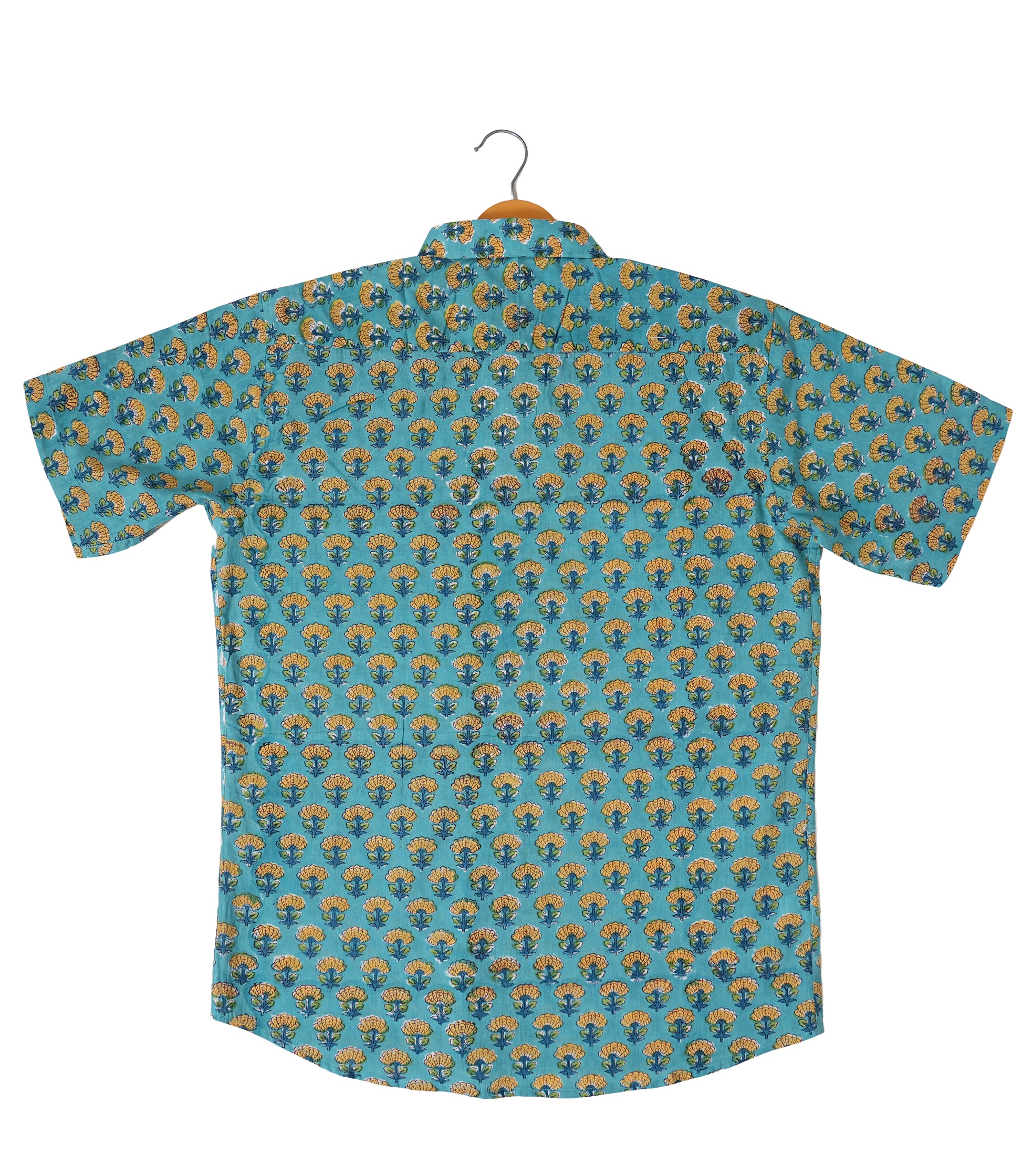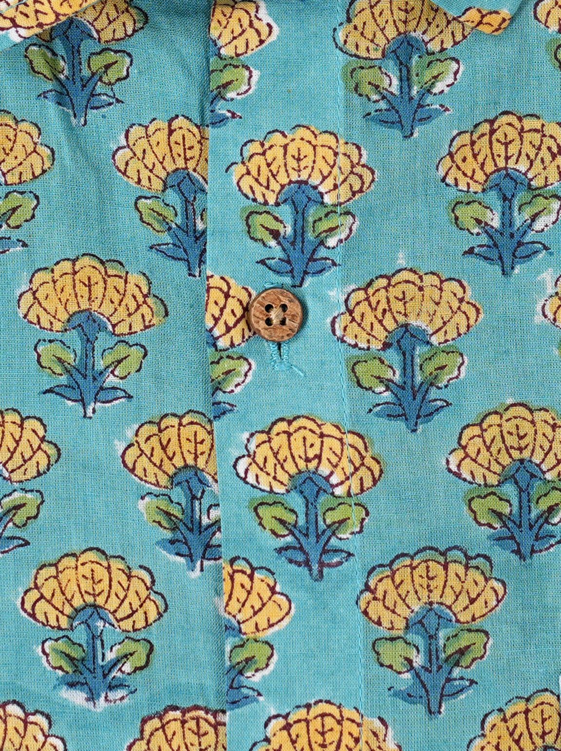Made from 100% cotton, this turquoise shirt offers soft, breathable comfort in a regular fit. Featuring a traditional hand block of mustard flowers, it’s designed with a spread collar, half sleeves, and a front button placket with eco-friendly coconut shell buttons. Hand wash recommended. Ethically made in India.