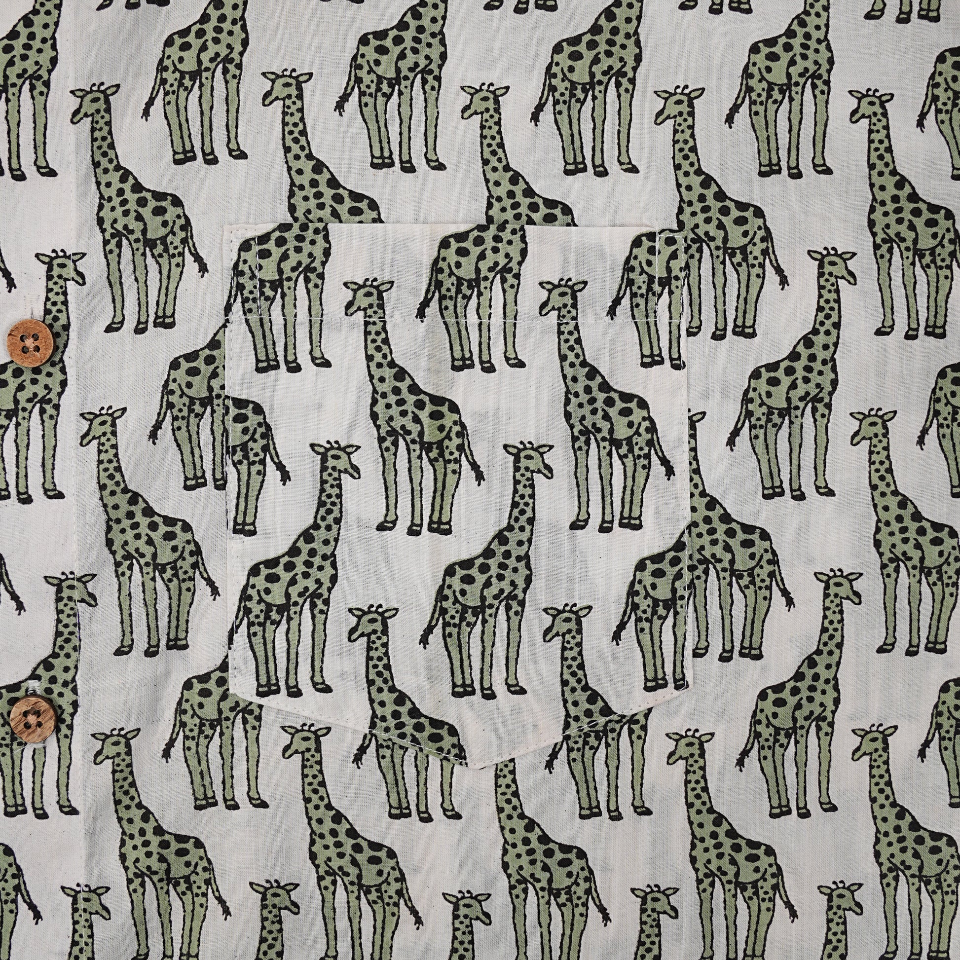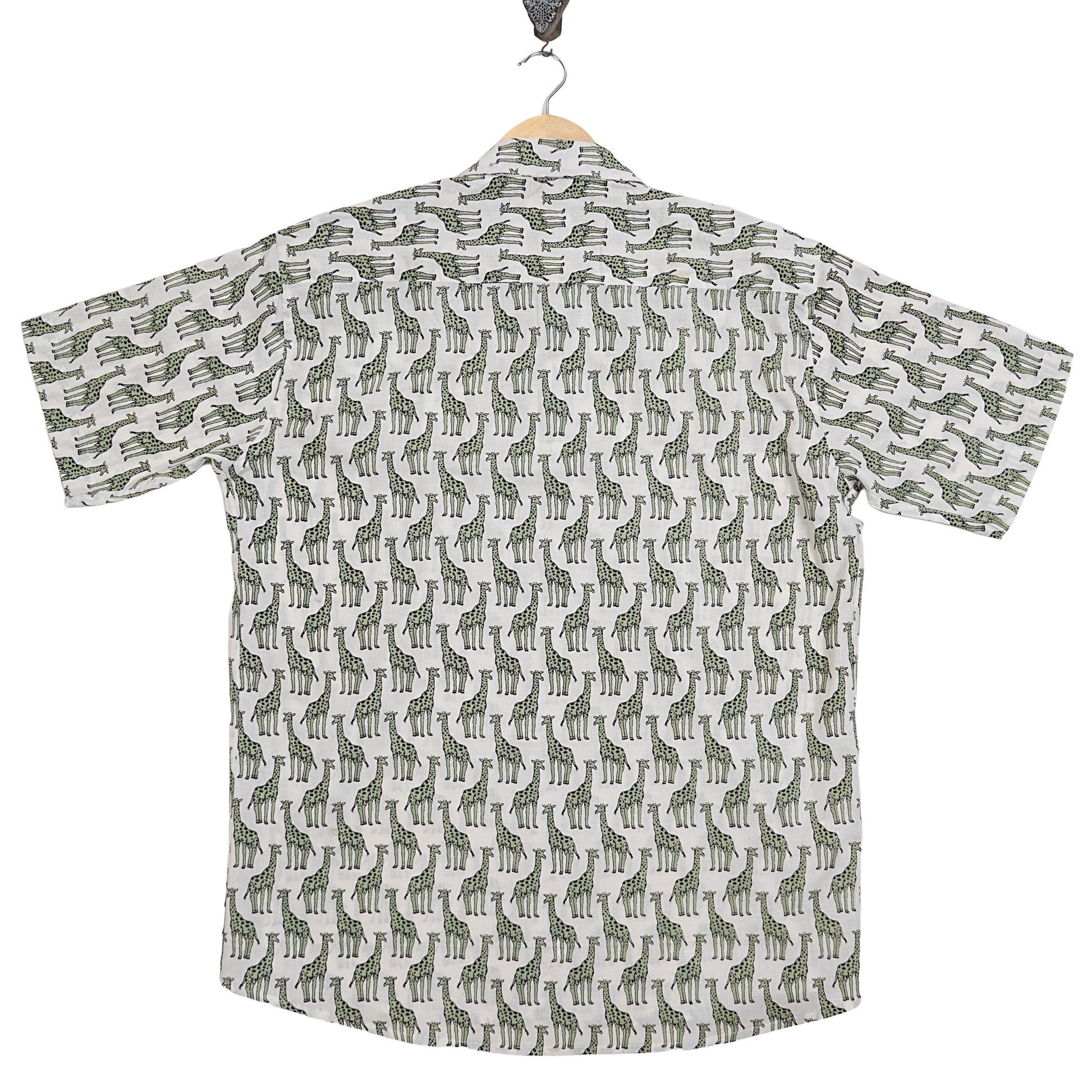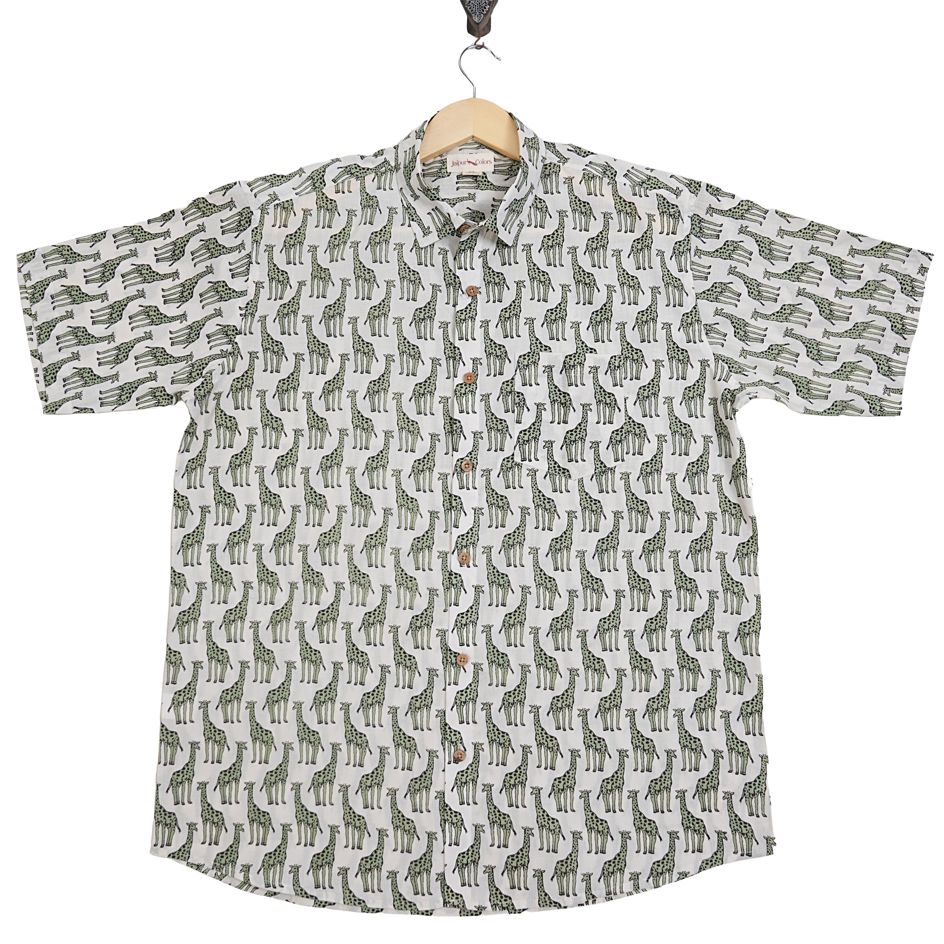 Crafted from 100% cotton, this regular-fit shirt promises all-day comfort with its breathable and soft fabric. The design features a playful screen print of long green giraffes on a crisp white base, making it a fun yet subtle statement piece. Designed with a spread collar, half sleeves, and a front button placket, this shirt is perfect for easygoing summer days. Ethically made in India.