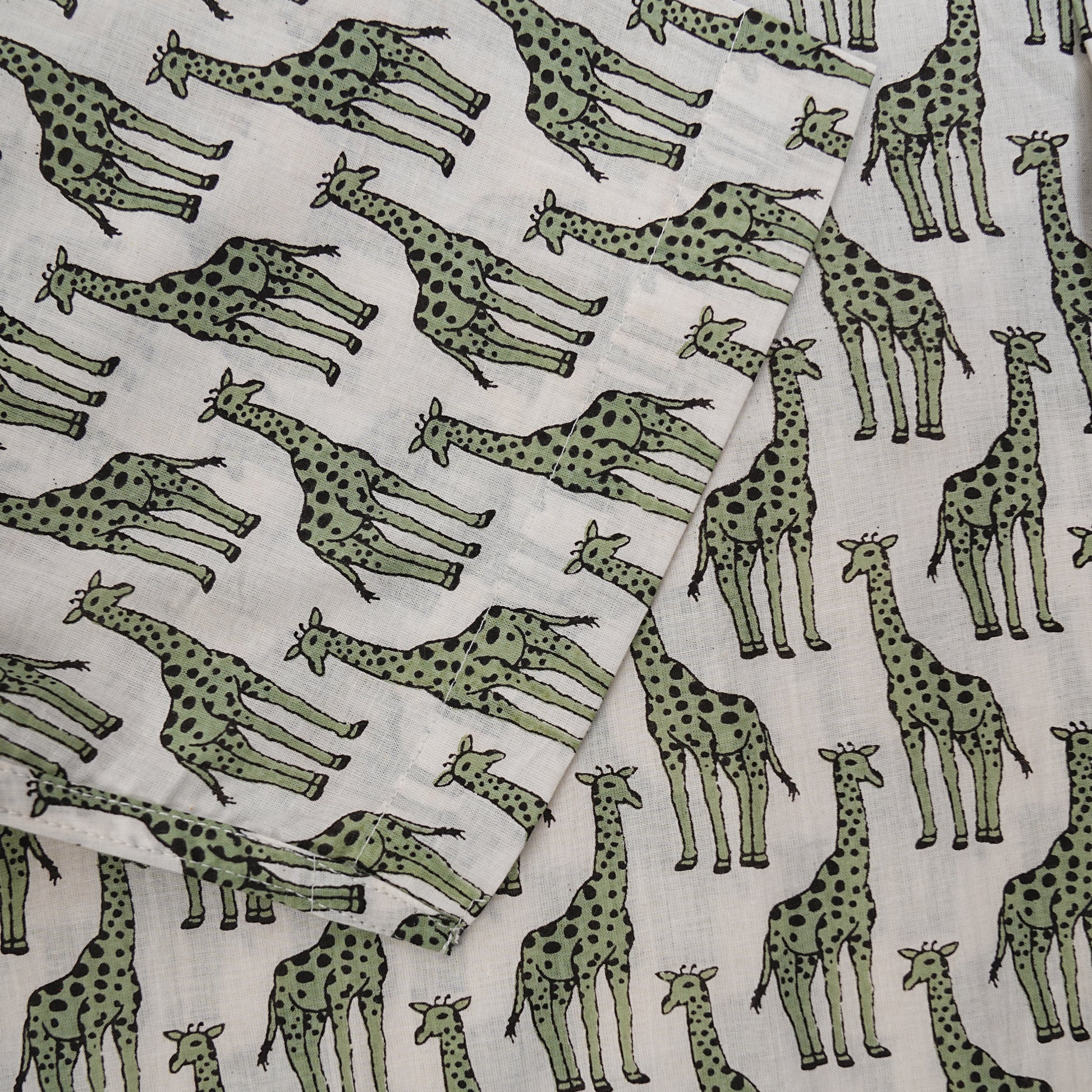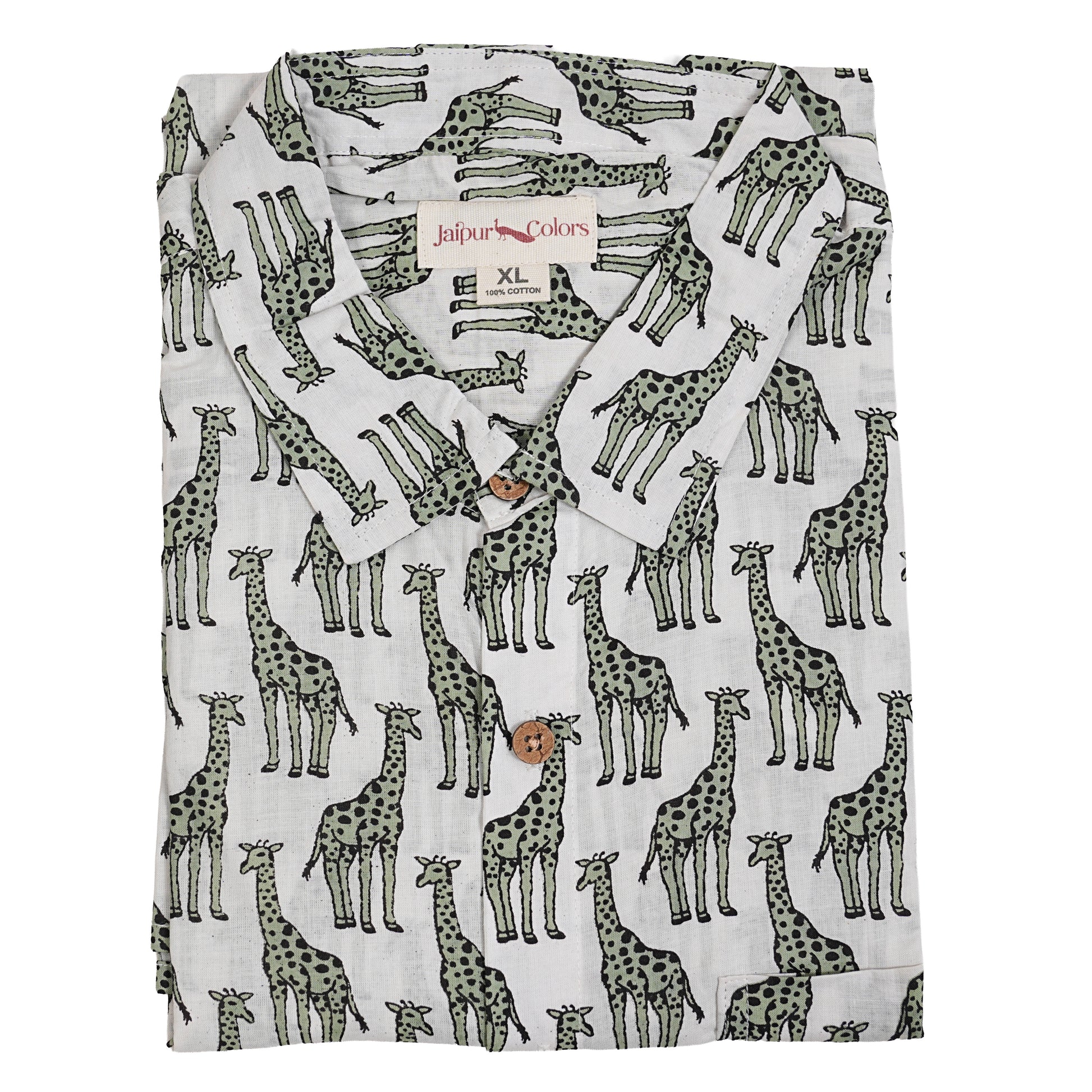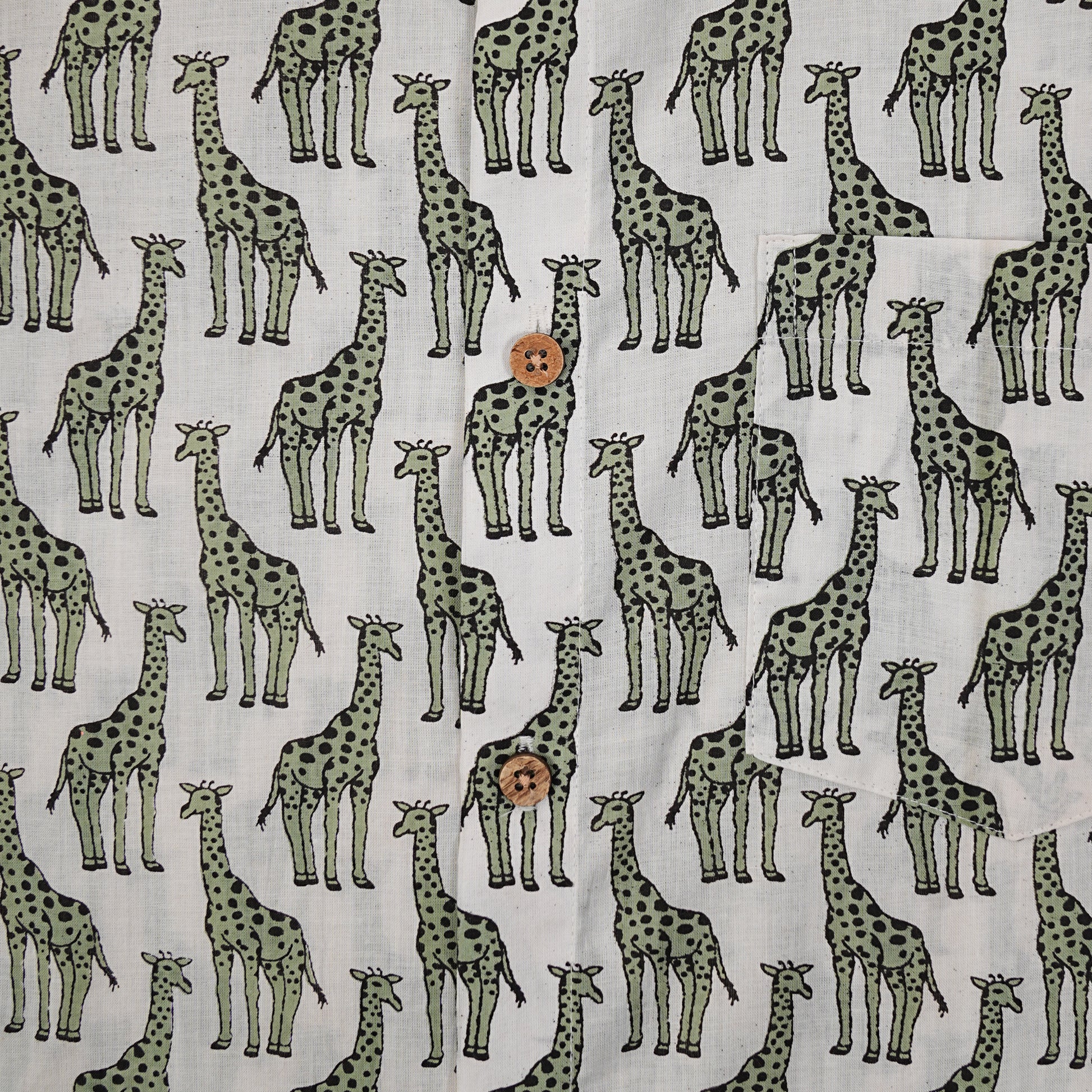 Crafted from 100% cotton, this regular-fit shirt promises all-day comfort with its breathable and soft fabric. The design features a playful screen print of long green giraffes on a crisp white base, making it a fun yet subtle statement piece. Designed with a spread collar, half sleeves, and a front button placket, this shirt is perfect for easygoing summer days. Ethically made in India.