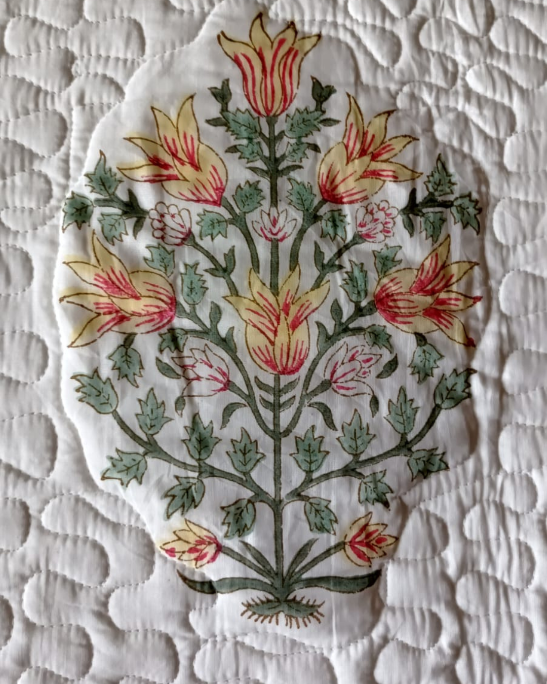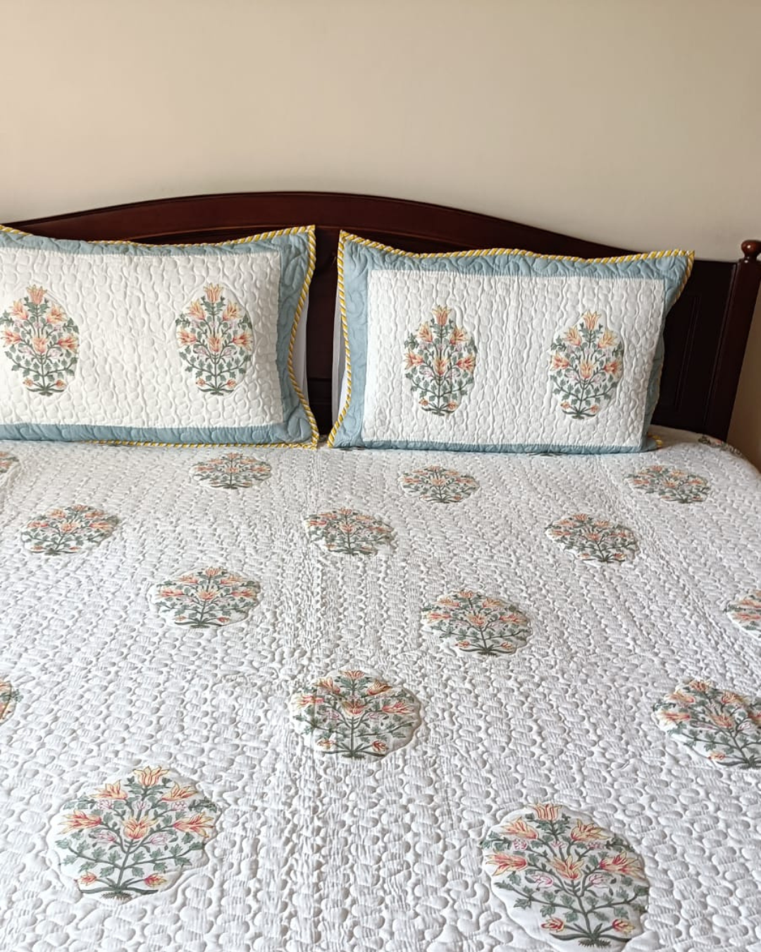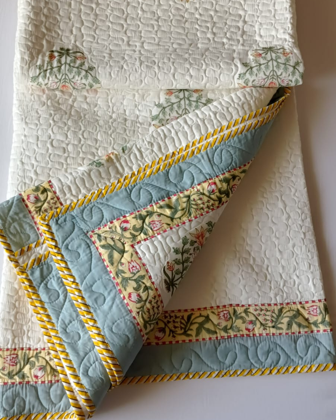 Add a pop of vibrant charm to your bedroom with our Yellow Flower Quilted Comforter Set featuring a Blue & Yellow Border. Handblock printed by skilled artisans, the design beautifully blends delicate floral motifs with a bold, contrasting border—creating a timeless and elegant statement. Made from soft, breathable cotton and quilted with lightweight cotton filling, this comforter set offers the perfect balance of comfort and warmth throughout the year. Complete with two matching pillow covers, it brings a fresh, handcrafted touch of Jaipur’s artistry into your space.